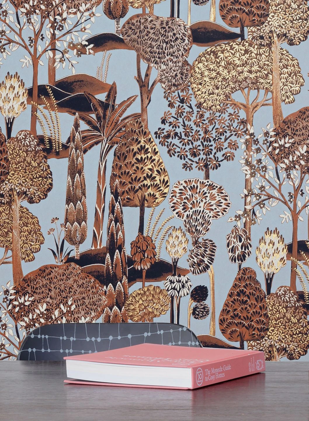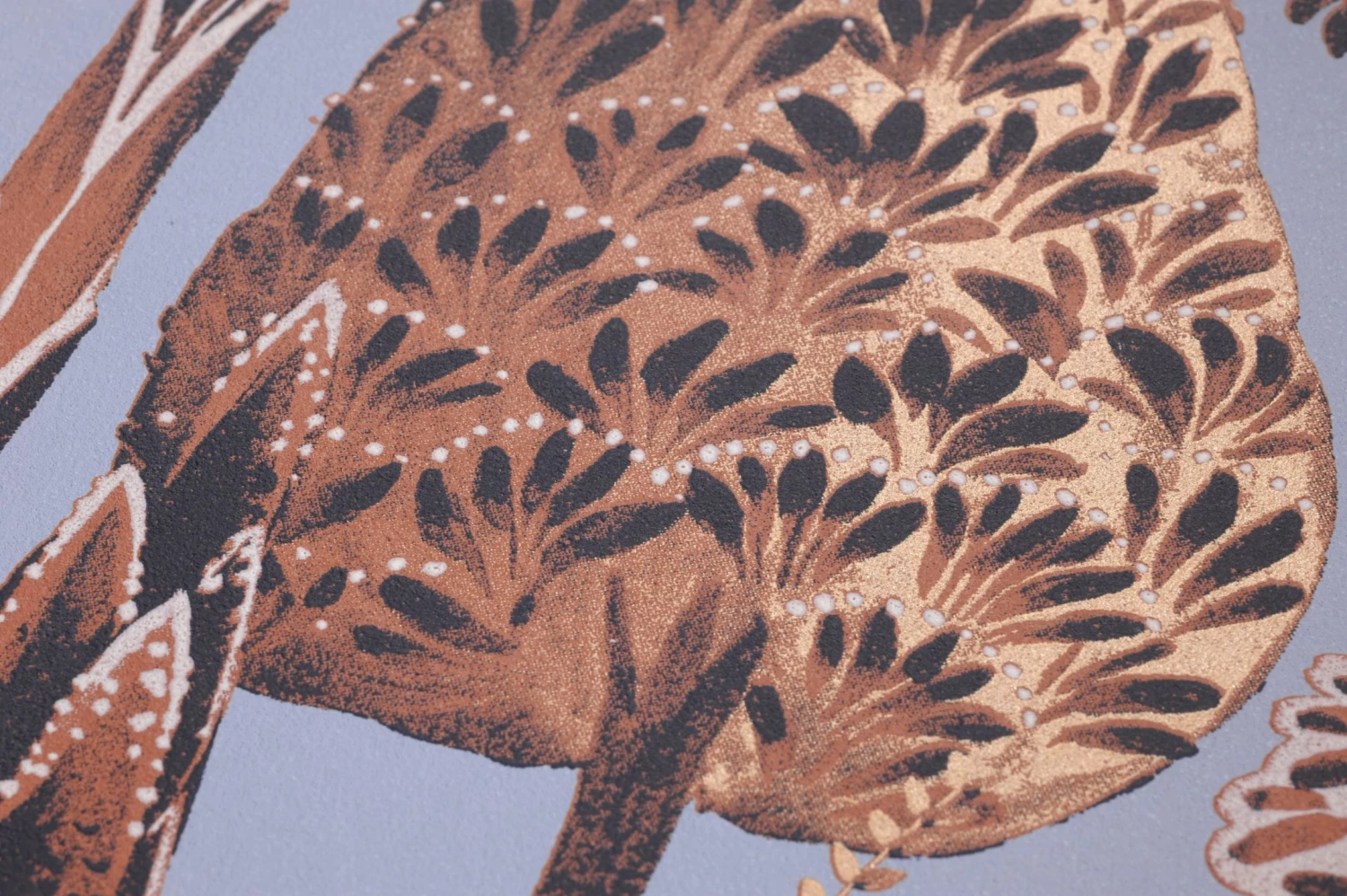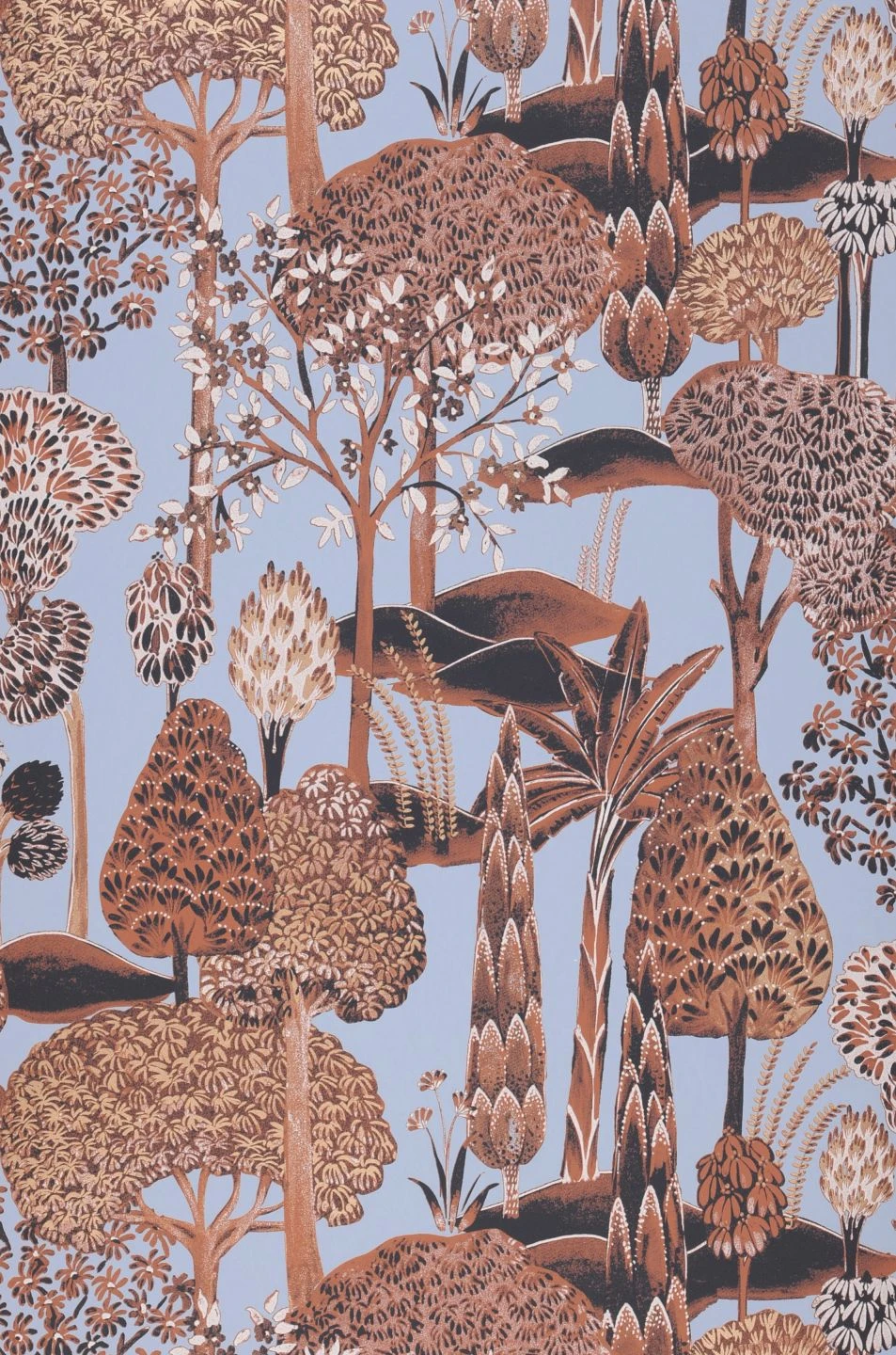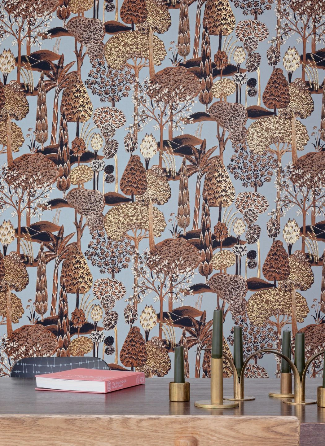 Ein Waldspaziergang, für den Sie das Haus nicht verlassen müssen: Eine Vielfalt verschieden geformter stilisierter Laubbäume in Naturtönen und Weiß mit perlgolden schimmernden Reflexen lädt dazu ein, sich in ihrem Schatten auszuruhen. Zwischen den Bäumen mit ihren ausladenden Kronen könnte der hellblaue Untergrund der Tapete der Himmel sein. Vliestapete Akari ist dekorativ und spendet zugleich Erholung.