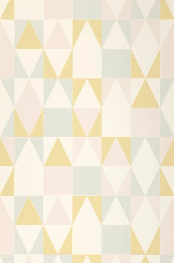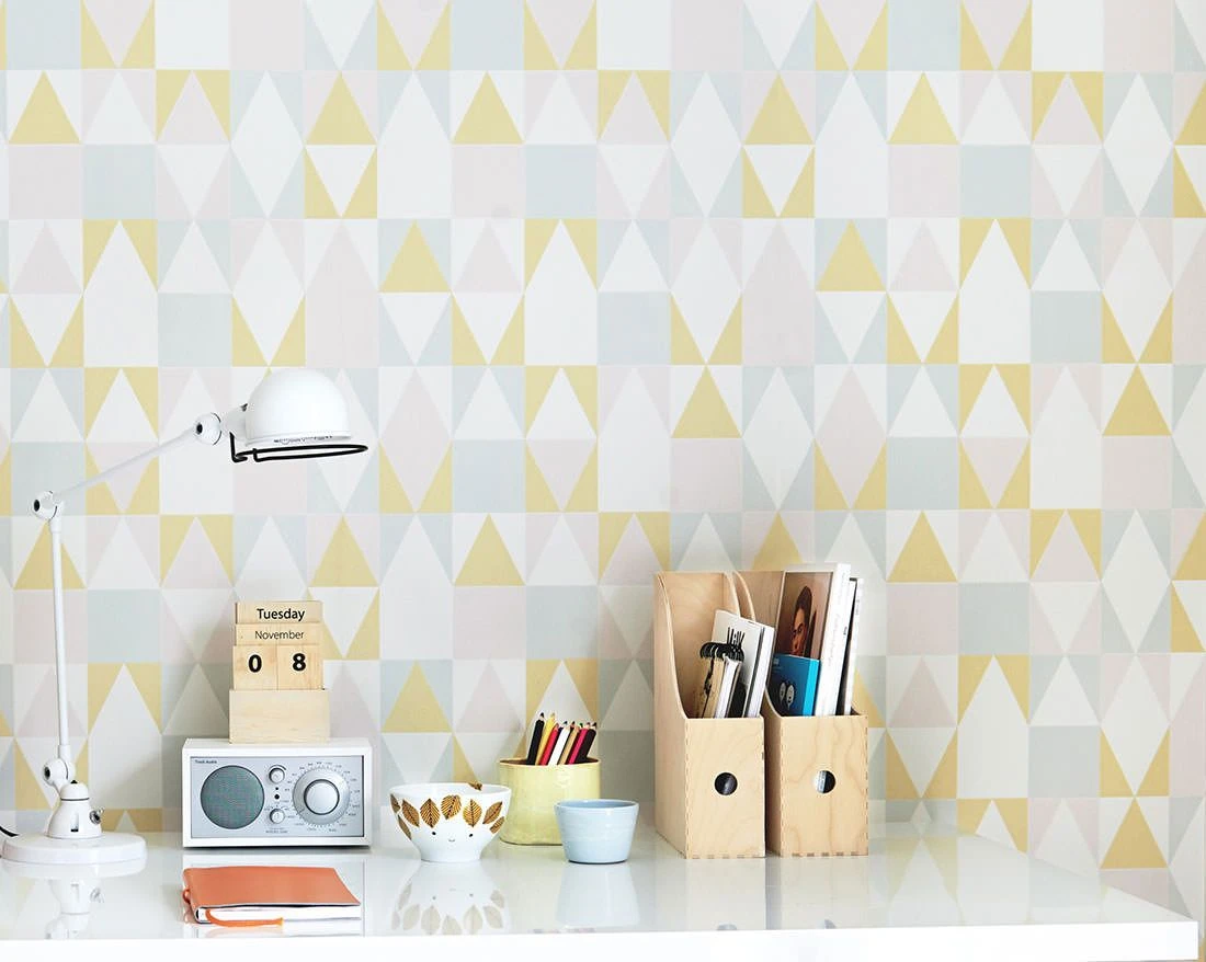 Dreiecke, Rechtecke und Rauten in den Farben Grau, Cremeweiß, Zartrosa und Zitronengelb prägen die beliebte Tapete aus dem Designstudio Majvillan. Scandinavischer Stil , der beruhigt und erfrischt zugleich.