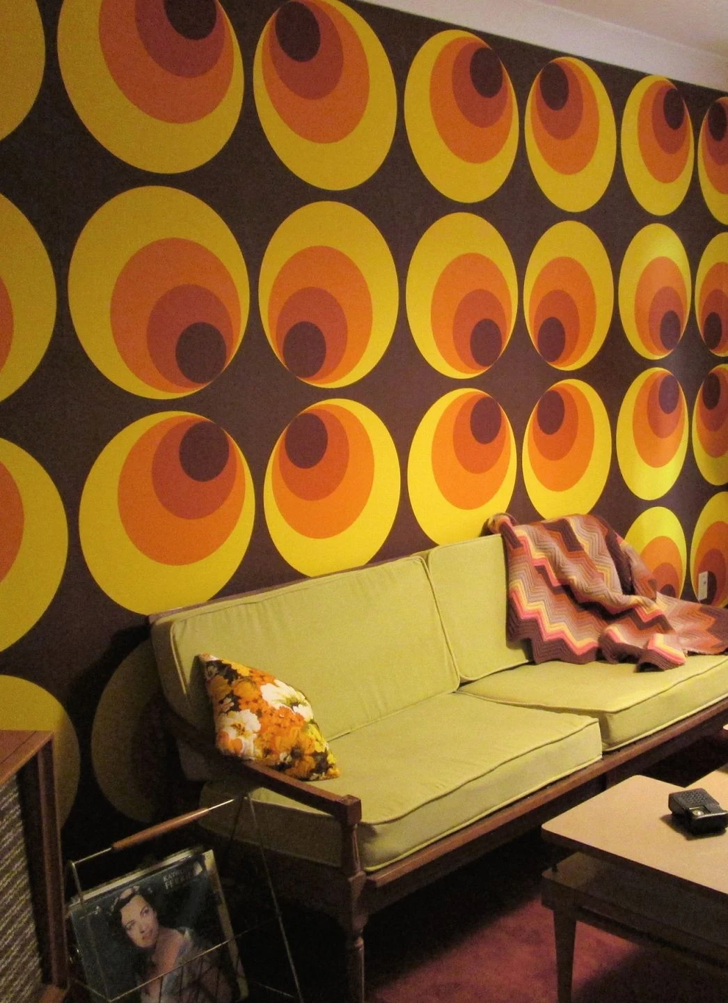 Die Atmosphäre der 70er Jahre erwecken Sie mit dieser Tapete gekonnt zum Leben. Denn hier gehen Muster und Farbwahl Hand in Hand: Die einander umschließenden Kreise, charakteristisch für das Design der 70er, sind in den typischen Gelb- und Orangetönen auf braunem Grund gefärbt. Der Clou des Musters: Aus der Entfernung betrachtet, lässt die Anordnung der Kreise zueinander Formen wie vierblättrige Kleeblätter entstehen.