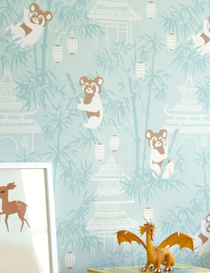 Weiß, Braun und Pastelltürkis verleihen der szenischen Darstellung von großen Pandabären in Bambusbäumen eine weiche Ausstrahlung, die den individuellen Farbwünschen im Kinderzimmer gerecht wird. Chinesische Tempel und Palastbauten verraten, wo diese Pandas leben. Auf in ein vergnügt entspanntes Spielabenteuer.