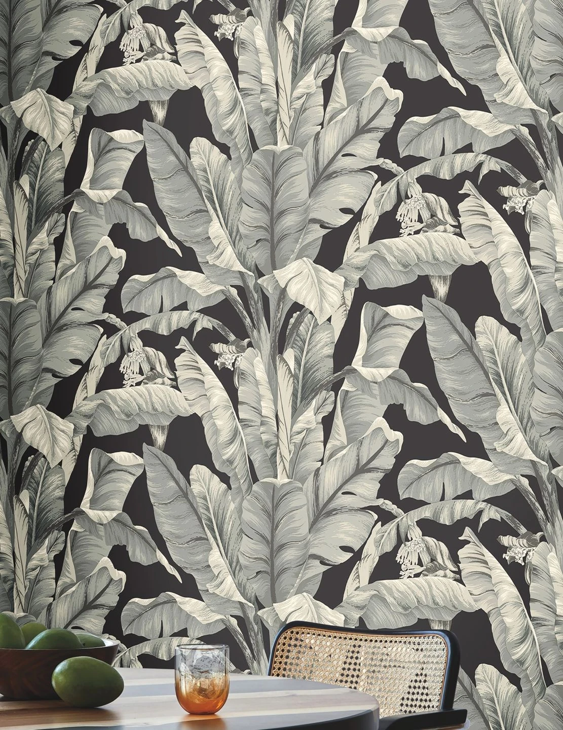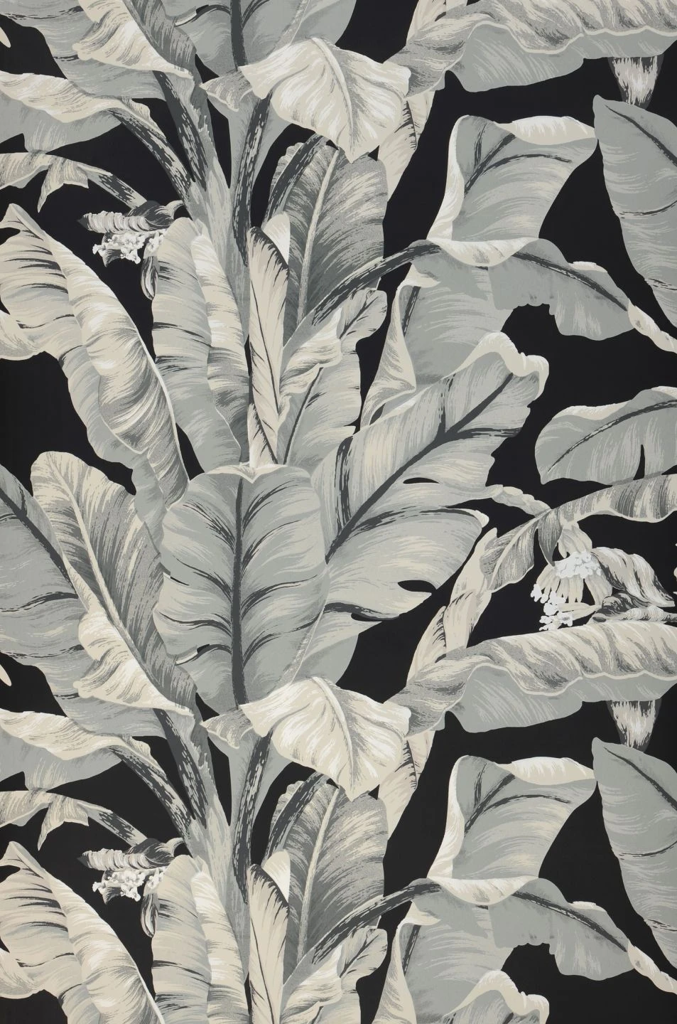Die Konzentration auf verschiedene Grautöne auf schwarzem Grund, die ganz die Linienführung im Vordergrund stehen lässt, bringt die typische feine Aderstruktur der Bananenblätter auf faszinierende Weise zur Geltung. Die Beschränkung auf die Form tut der Üppigkeit der exotischen Pflanzen keinen Abbruch – es entsteht ein wunderbar grafischer, interessanter und gleichzeitig wandelbarer Hintergrund für einen echten Lebens-Raum.