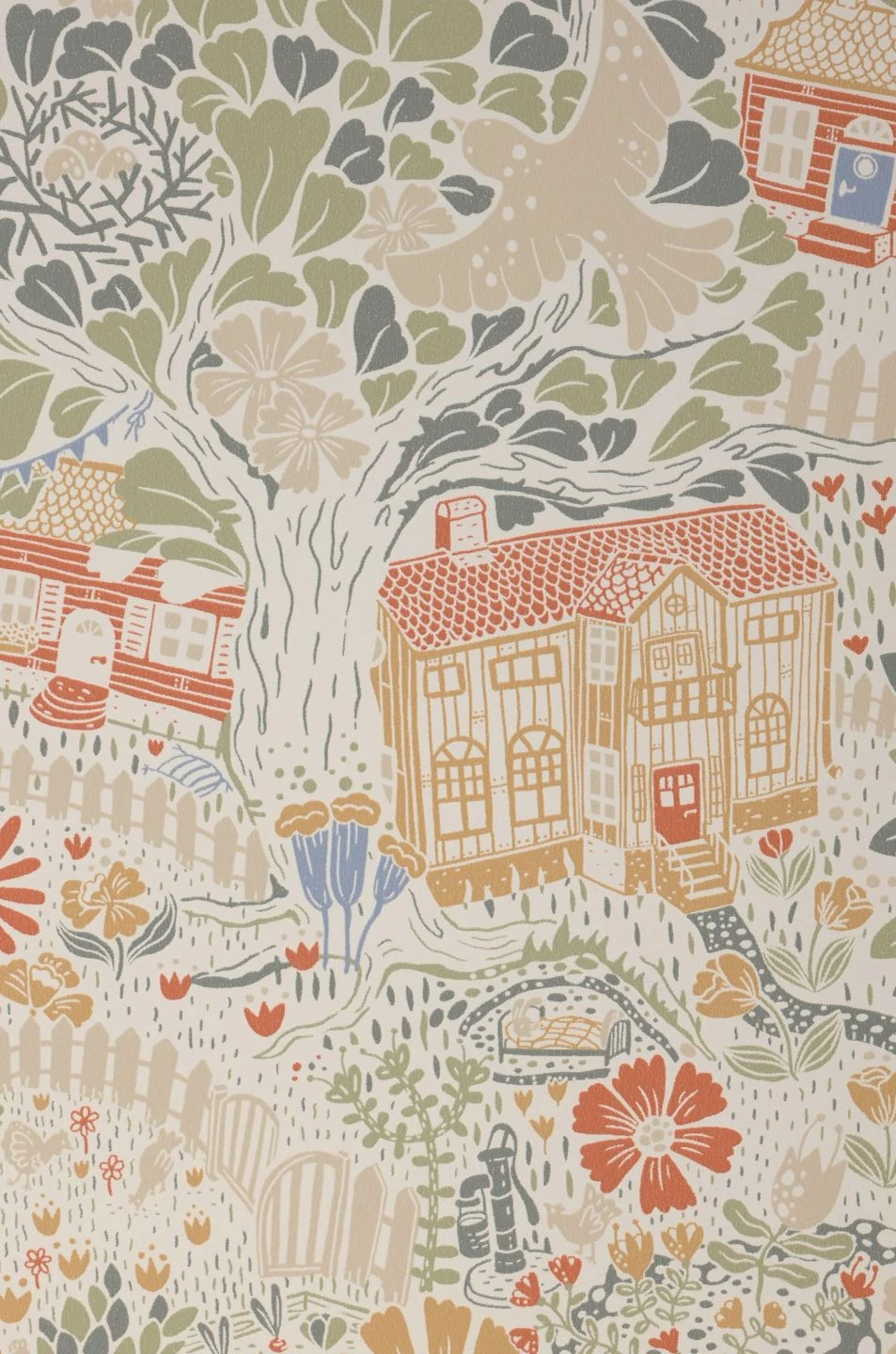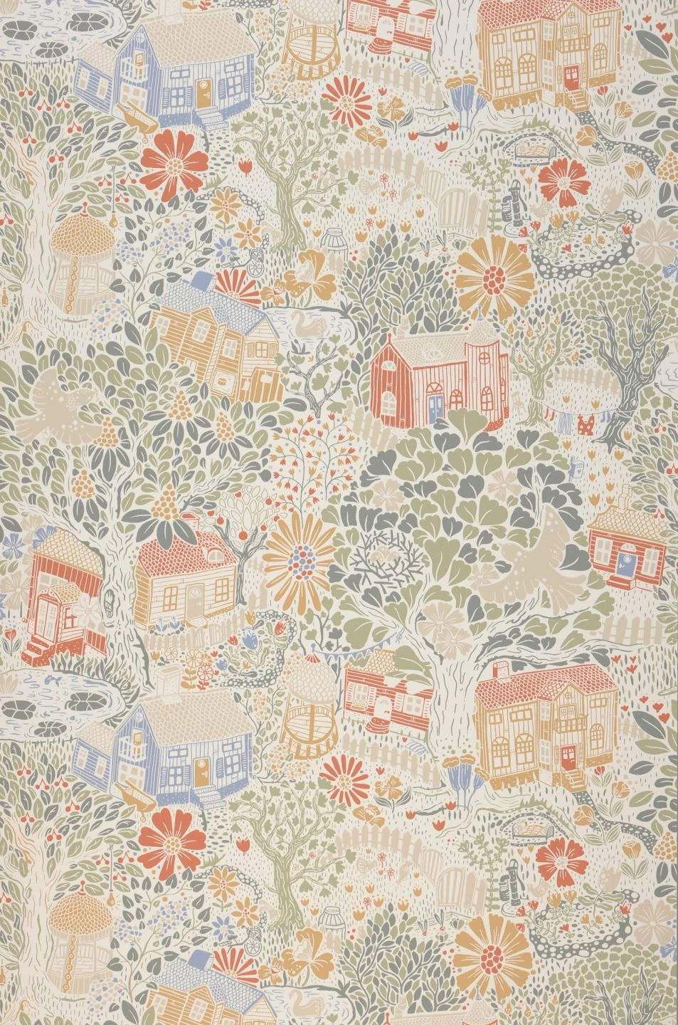 Eine ganze Welt voll von buntem Leben erwacht an Ihren Wänden und unterhält Sie mit ihrer Fülle an liebevoll gezeichneten Details. Wie in einem schwedischen Dorf finden sich hölzerne Häuser und eine Kirche, Bäume und Blumen, ein Seerosenteich, Vögel und noch viel mehr. Der freundliche Charakter der hellen Farbtöne entfaltet in einem hellen Kinderzimmer ebenso seine Wirkung wie in einer einladenden Küche oder einem hyggeligen Wohnzimmer im skandinavischen Stil.