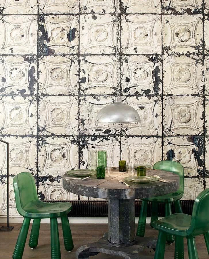 Zum Trend wurden sie im Pariser Conceptstore „MERCI“: außergewöhnlich schön gearbeitete Emaille-Kacheln. Die Vliestapete bringt Ihnen die Kostbarkeiten als Digitaldruck in die Wohnung – komplett mit den Spuren der Zeit. Die abblätternde helle Emailleschicht mit zarten Rissen, die in das Metall getriebenen stilisierten Blütenmuster, alles zusammen kreiert einen außergewöhnlichen Raumeindruck, der Ihrer Einrichtung im Shabby Chic oder Industrial Look das gewisse Etwas verleiht.