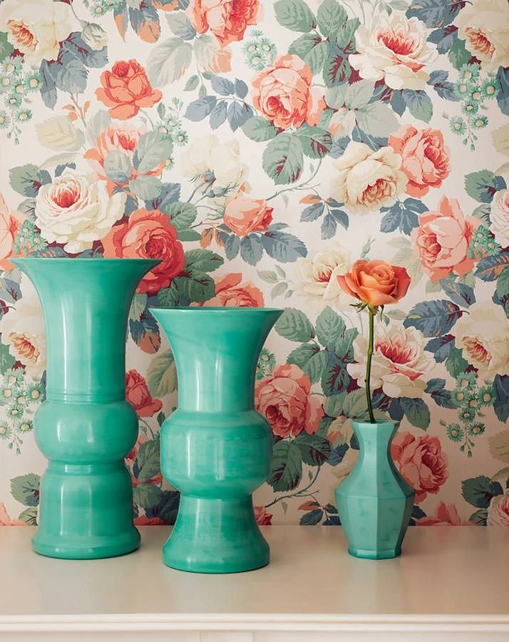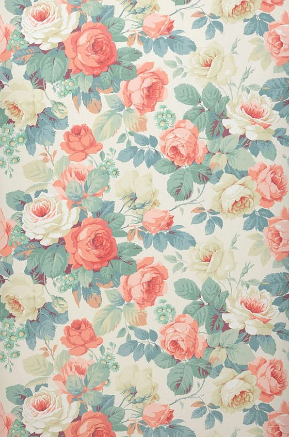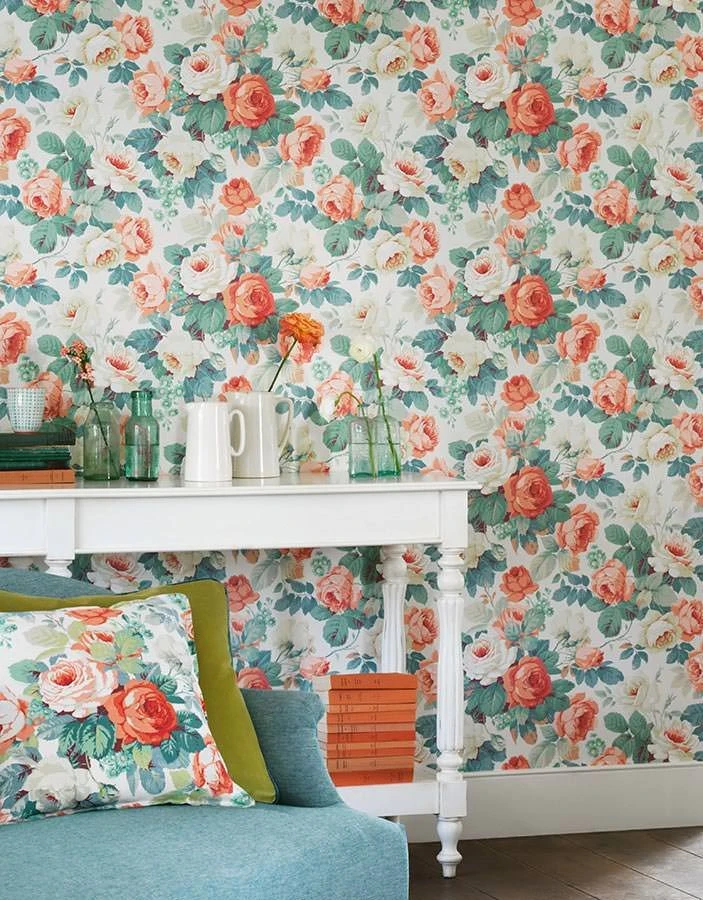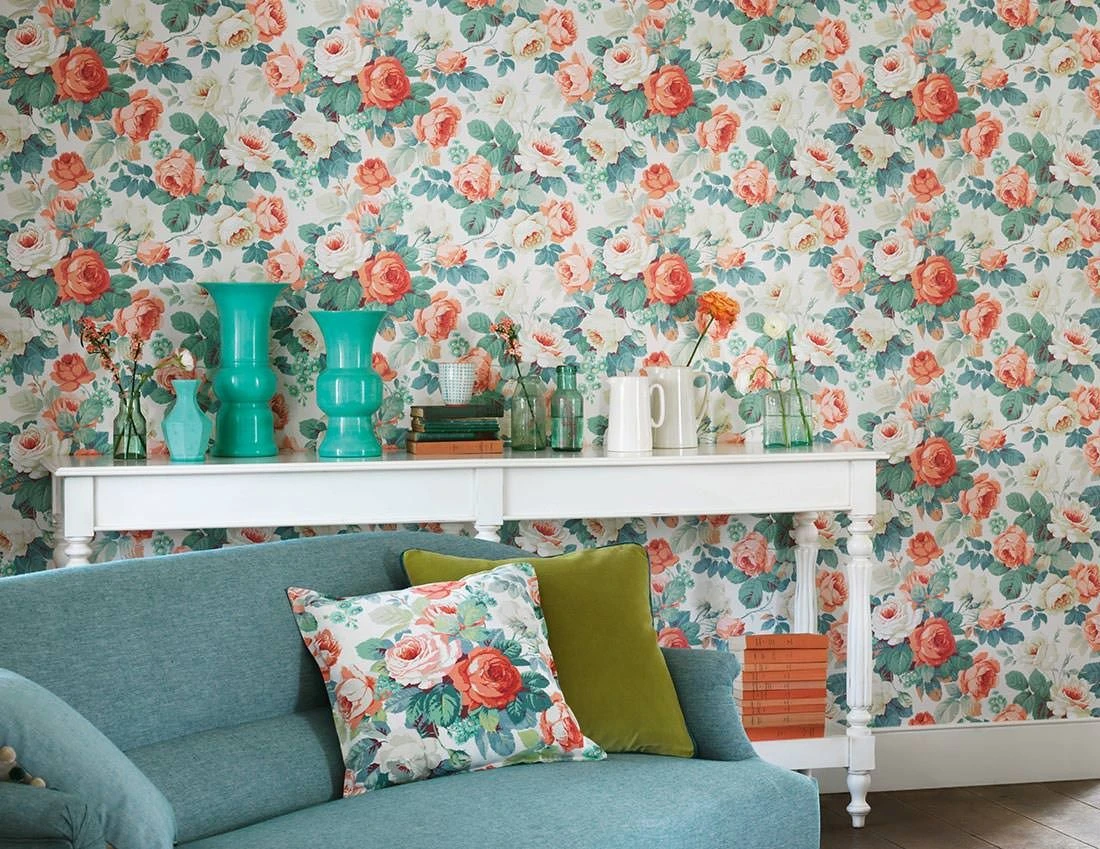 Prächtige, große Rosen erblühen in leuchtendem Rot, Lachsorange und Grünbeige auf dem cremeweißen Grund der romantisch anmutenden Papiertapete. Die grünblauen und minttürkisen Blätter bilden ein angenehmes Gegengewicht zu den strahlenden Farben der Rosenblüten. Die Tapete bringt den nicht enden wollenden Sommer mit sich und ergänzt Ihre romantische Einrichtung, antike Möbel oder den Landhaus-Stil mit ihrer Farbenpracht.
