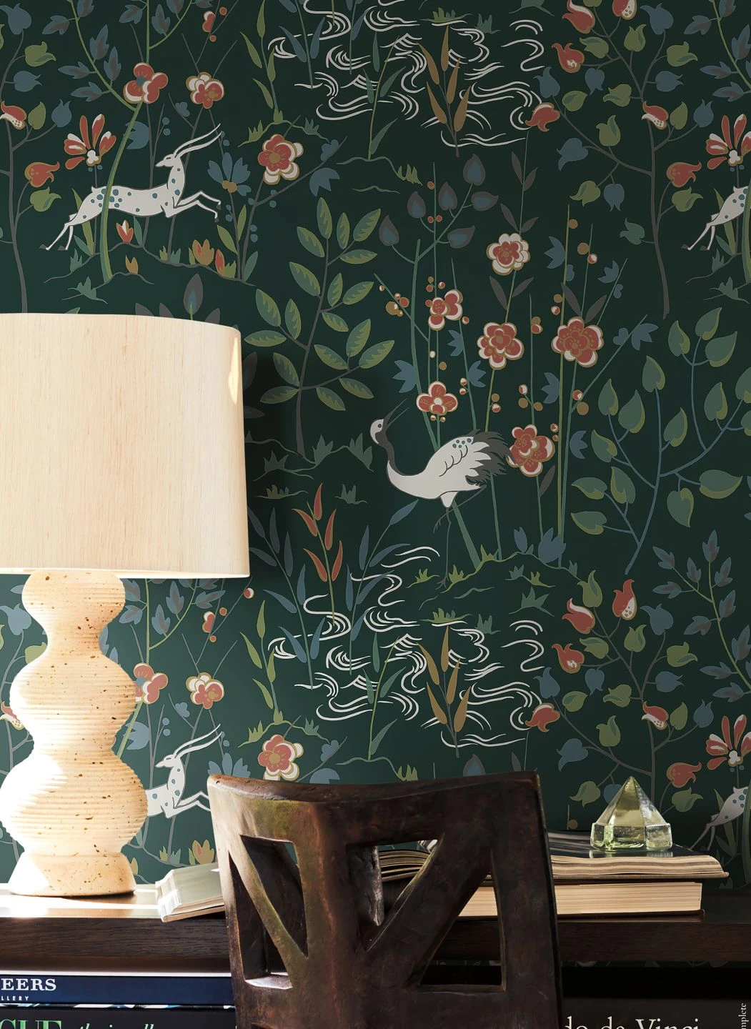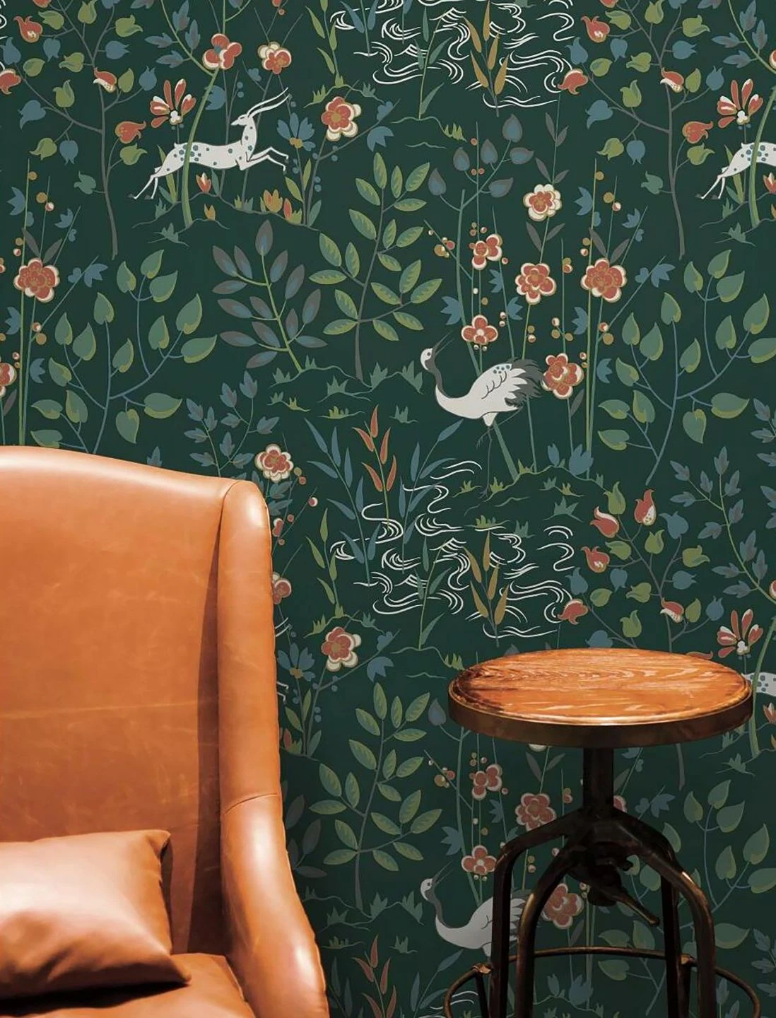 Zwischen Sträuchern und in voller Blüte stehenden Blumen kräuseln sich stilisierte Wellen zu einer angedeuteten Uferlandschaft. Kraniche und Antilopen versetzen Sie in eine exotische Welt im fernen Osten. Inmitten der vorherrschenden Blau- und Grüntöne setzen die Blüten mit ihrem leuchtenden Orientrot und den Details in schimmerndem Perlgold und hellem Grauweiß freundliche, farbenfrohe Akzente.