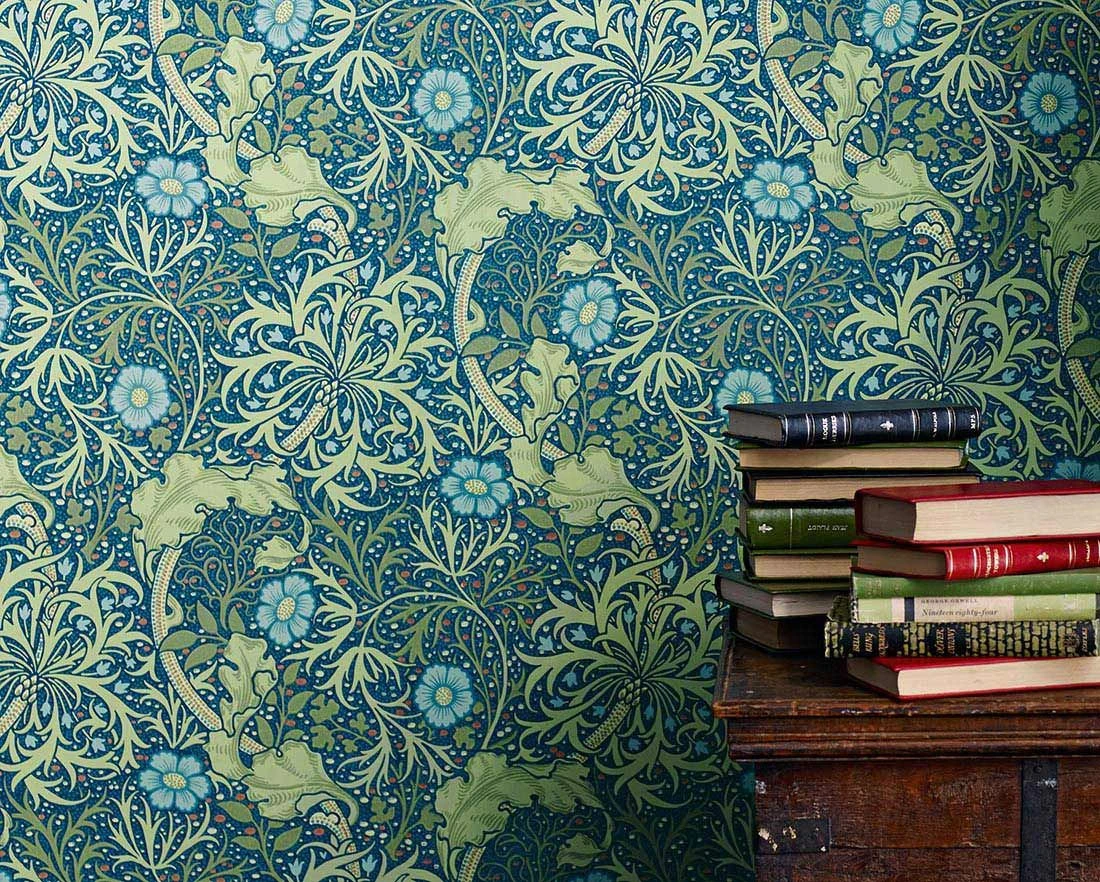 Die perfekte Kombination von Blau- und Grüntönen gibt dieser Tapete einen unverwechselbaren Charme. Ein gleichmäßiges Rankenspiel verschiedener Blätter, dazwischen blaue Blüten und rote Knospen, das ist einfach nostalgisch!