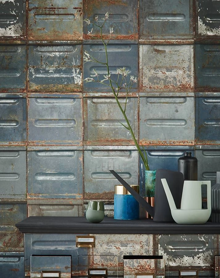 Dunkelgrau, Graublau, Rotorange symbolisieren die einzigartige Schönheit, die von blauem Stahl ausgeht, an dem die Zeit nicht spurlos vorbei gegangen ist. Die Vliestapete mit natürlich patinierten Metallbehältern eröffnet tolle Ideen für Räume mit Industrial-Charme, z.B. Küche oder Arbeitszimmer. Sie werden staunen, welche hochmodernen Effekte sich ergeben.