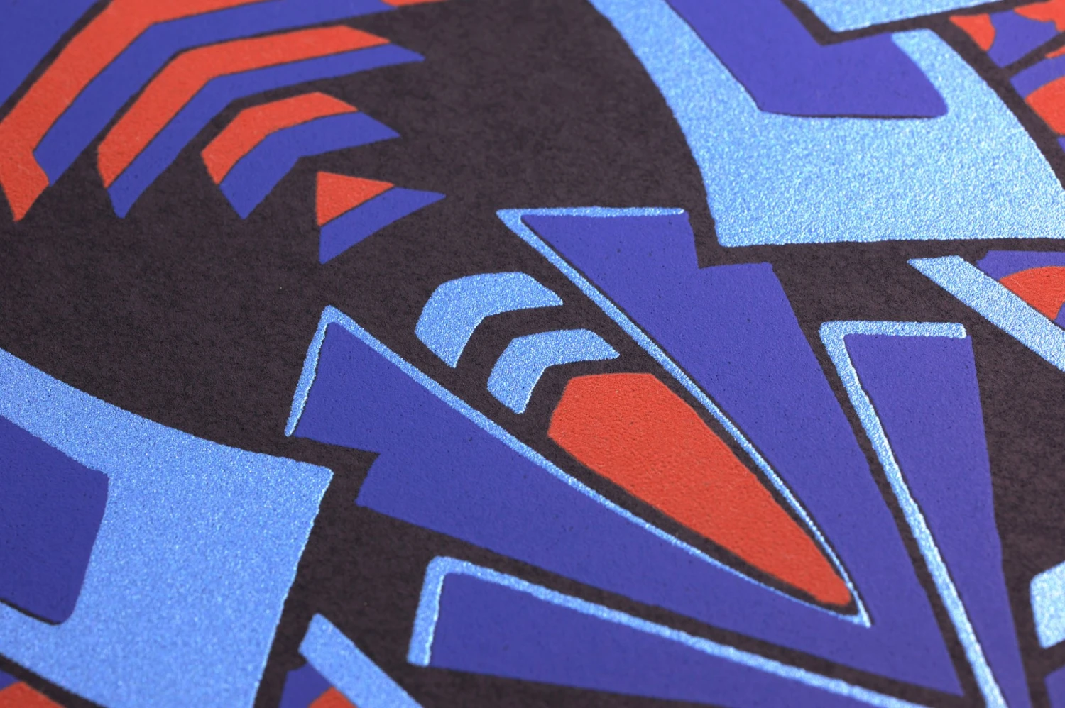 Wenn sich psychedelische Kunst und Art Deco Einflüsse treffen, entsteht eine magische Symbiose. Der Farbrausch aus Perlblau, Perlkupfer, Orangerot und Blau lässt die modernen Ornamente vom schwarzen Grund hervortreten. Wer intensive Farben und exzentrische Muster liebt, will diese Designtapete sofort haben.