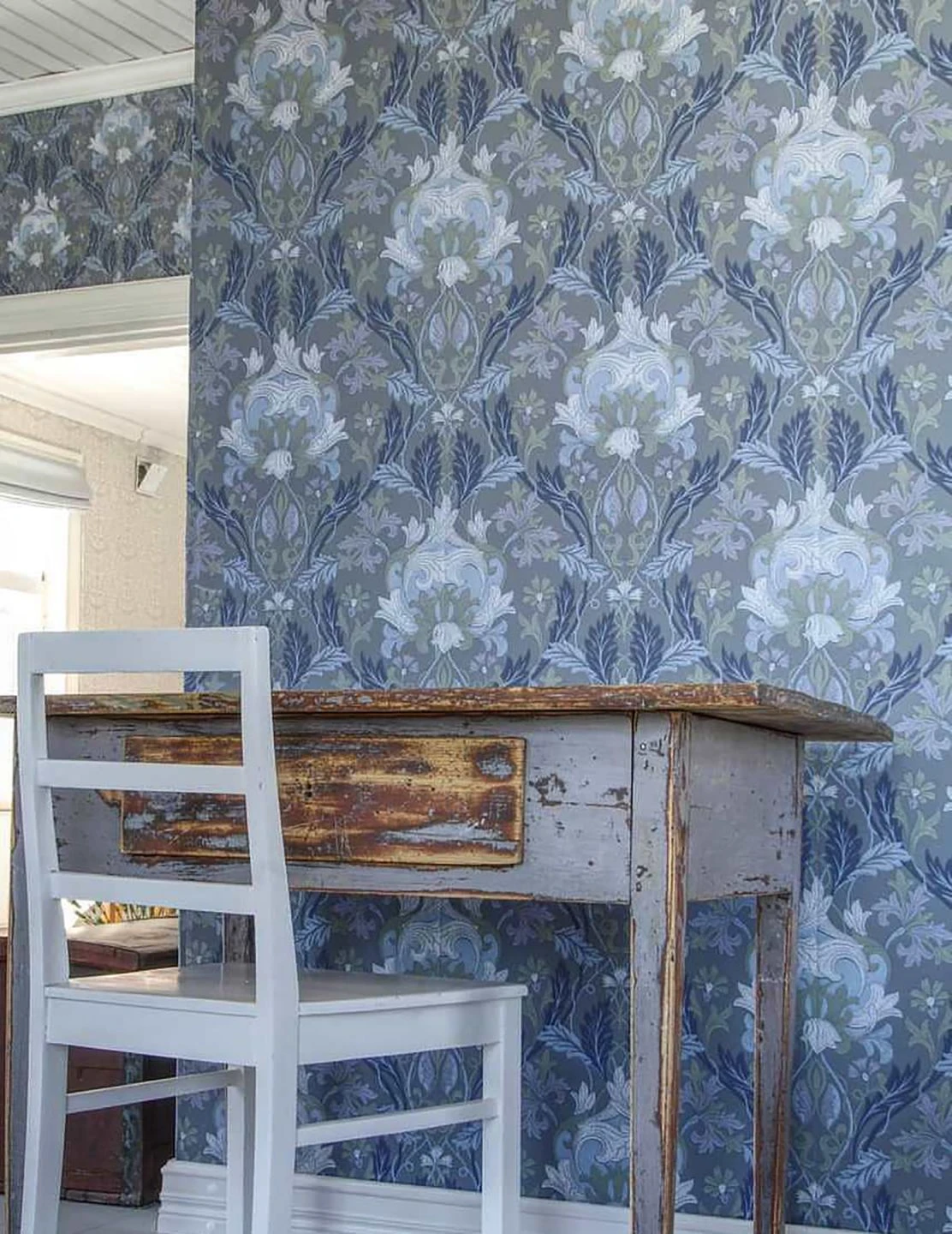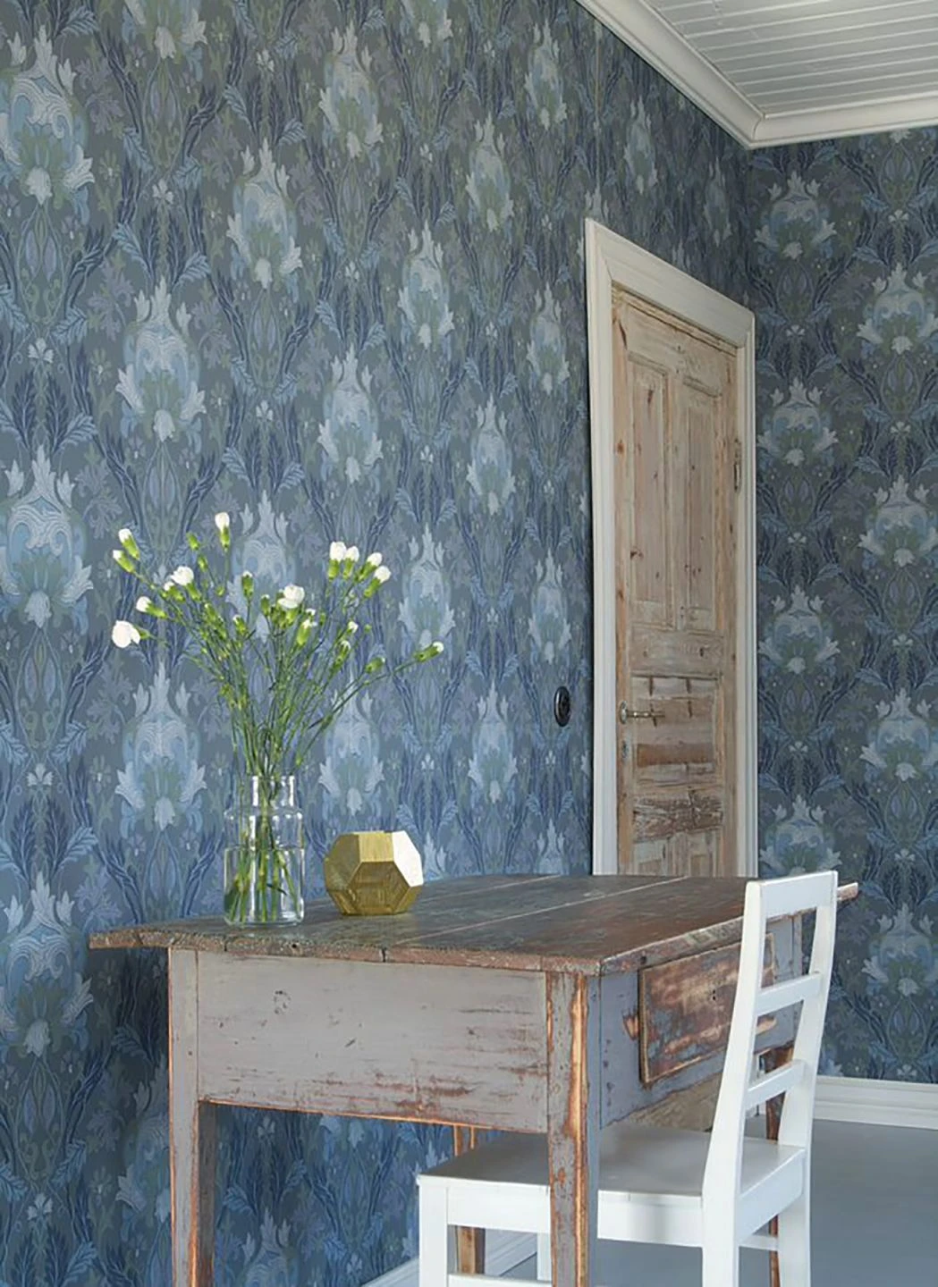 Die stilisierten und kunstvoll angeordneten Blüten, Blätter und Ranken des Jugendstils in sanften Grün- und Blautönen üben eine intensive Wirkung aus. Das klassische, im Leimdruckverfahren hergestellte Tapetenmuster gewinnt eine märchenhafte, beruhigende Ausstrahlung, wie geschaffen für ein entspannendes Schlafzimmer oder ein gemütliches Wohnzimmer. Weiße Möbel oder weitere Töne aus der blaugrünen Farbfamilie, antike Elemente oder Shabby Chic, Denisa passt sich an eine Vielzahl von Stilrichtungen an.