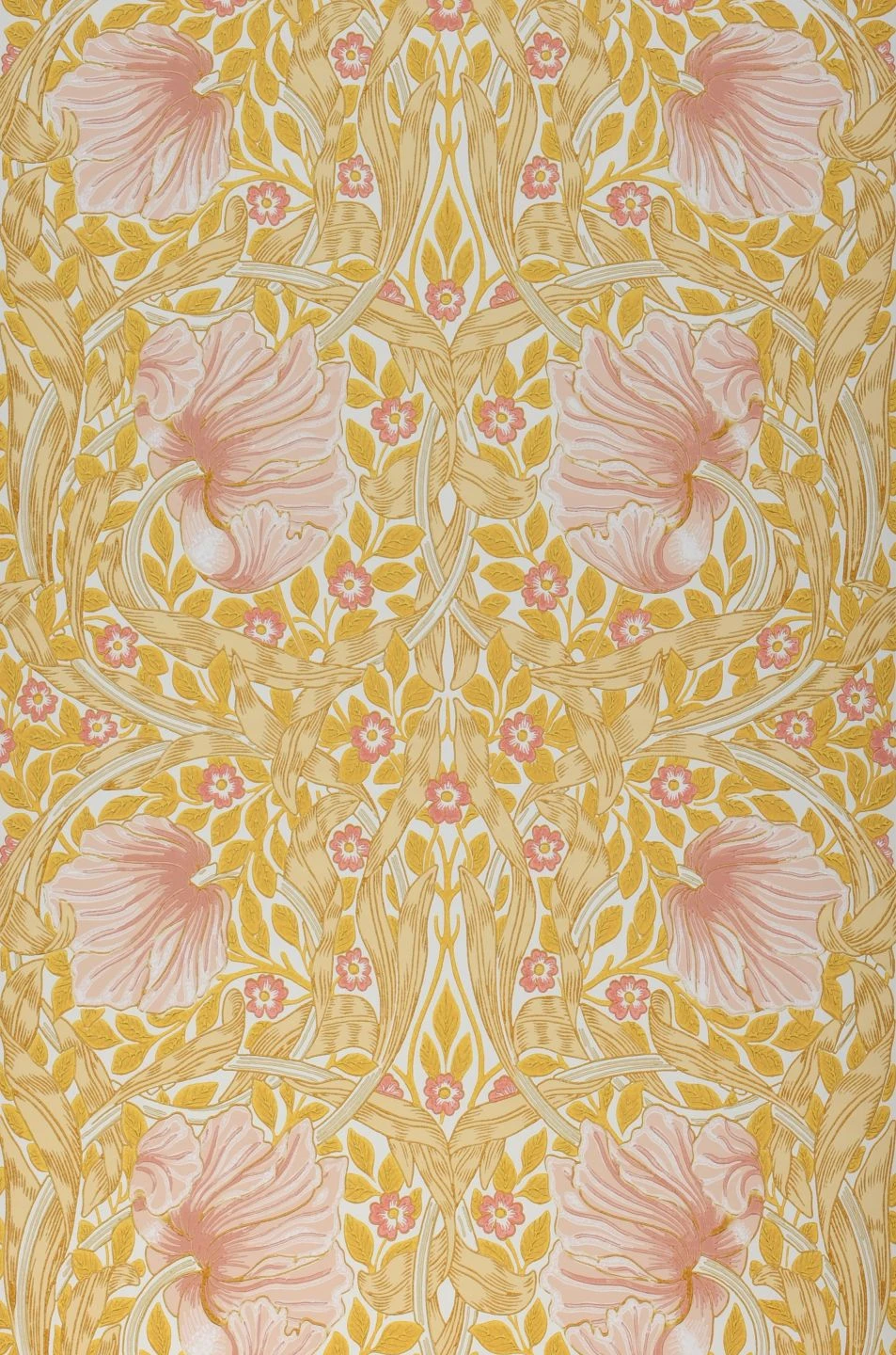 Sonniges Ginstergelb in Verbindung mit Rosatönen lässt die exklusive Jugendstil-Tapete Despina wie von selbst leuchten und taucht Ihren Raum in warme, helle Farben. Das Muster ist ein Design des britischen Künstlers William Morris und lebt von großen zarten Blüten in Altrosa, Creme und Zartrosa und den umeinander geschlungenen Blüten- und Blattranken, die den weißen Grund bedecken. Die Optik des verwendeten Leimdruckverfahrens gibt der Papiertapete ihren authentischen Charakter.