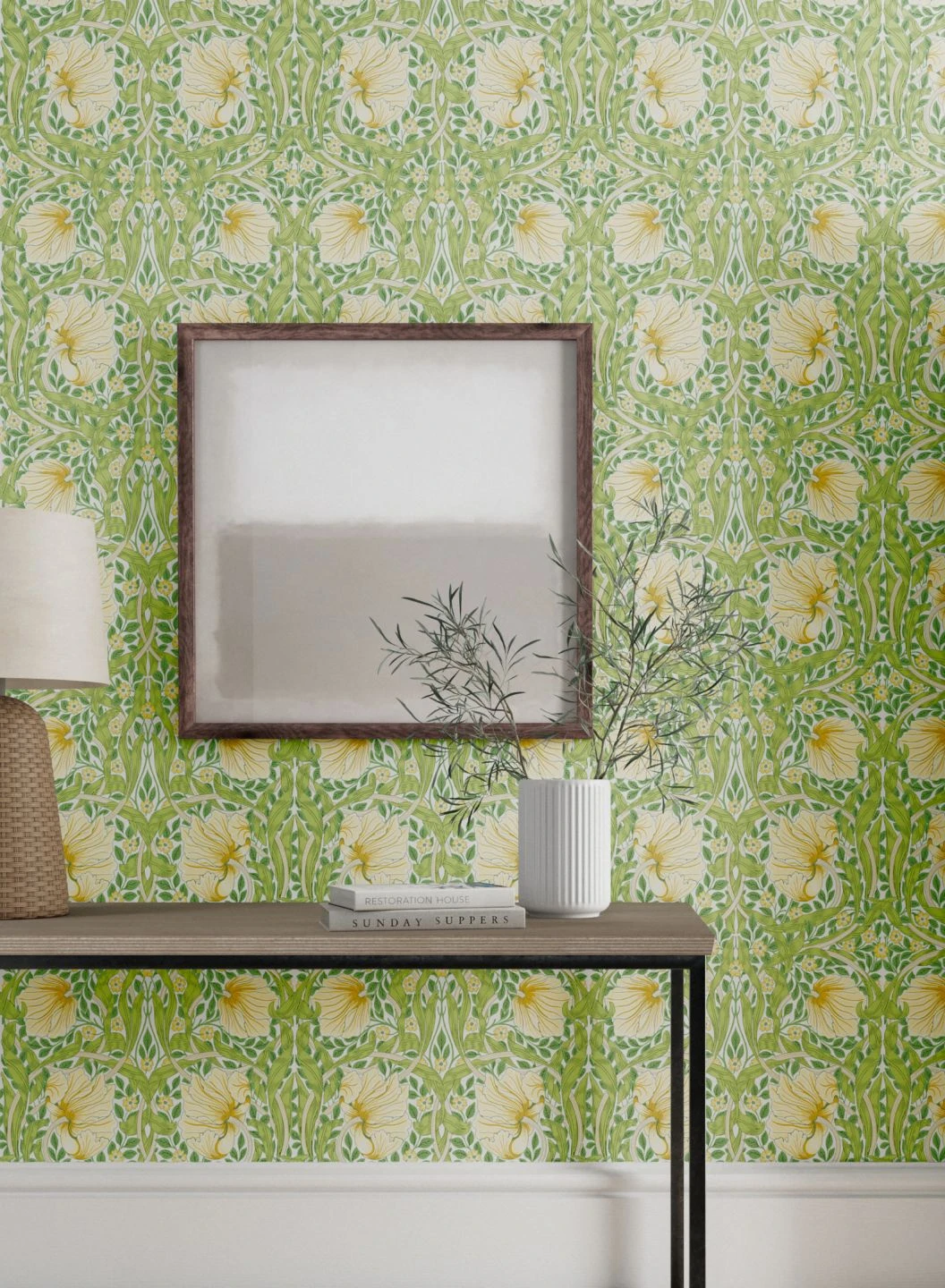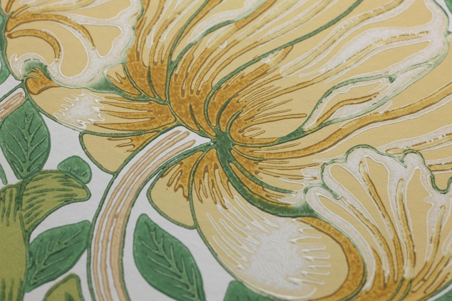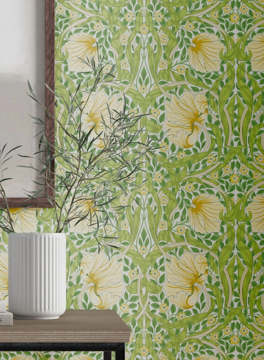 Das Design der im Leimdruckverfahren hergestellten Papiertapete hat eine ruhmreiche Geschichte: Es geht auf den britischen Designer William Morris zurück, der im 19. Jahrhundert zahlreiche klassische Tapetenmuster entworfen hat. Gleichzeitig machen die frischen Grüntöne und die hellen Schattierungen von Gelb auf dem weißen Grund das Muster aus verschlungenen Blattranken und Blüten aktuell und zeitgemäß. Mit Despina, ergänzt mit antiken Möbeln aus Holz, beweisen Sie Stilsicherheit.