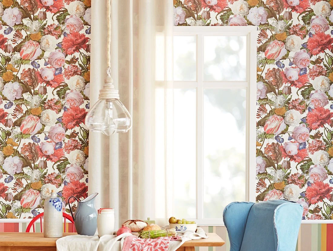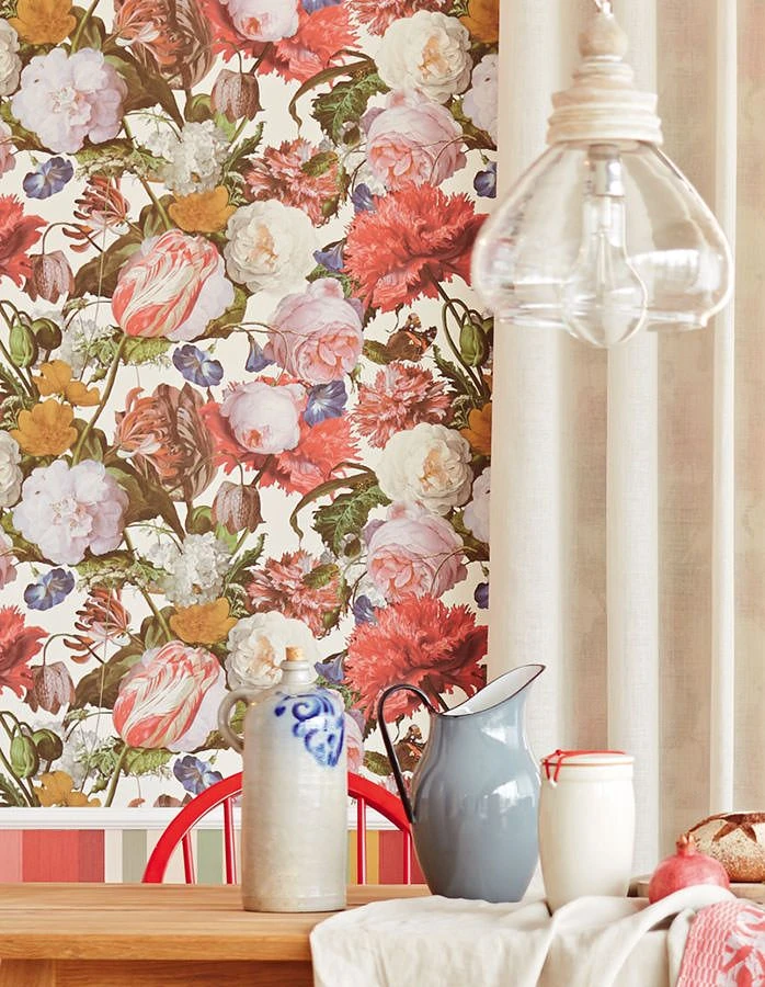Die bunten Farben der prächtigen Blüten auf dieser Vliestapete entfalten auf dem cremeweißen Untergrund ihre ganze Leuchtkraft. Komposition und Darstellung der Blumen erinnern an die Stillleben der holländischen alten Meister des Barock. Die textilähnliche Struktur der Oberfläche aus Vinyl trägt zum Eindruck eines Gemäldes bei und sorgt dafür, dass Sie mit dieser hoch waschbeständigen Tapete auch Ihr Bad verschönern können.