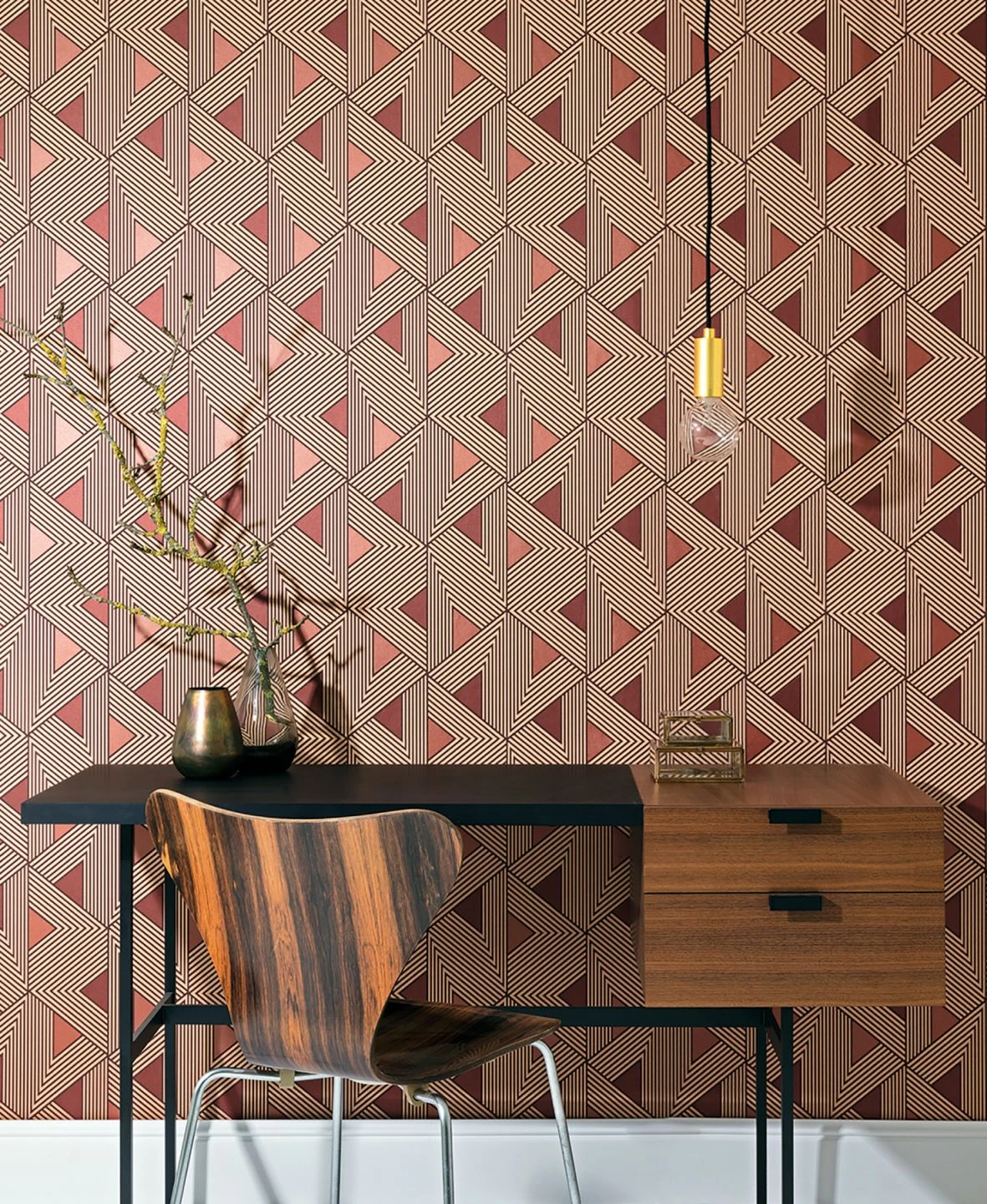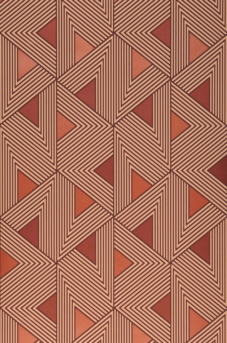 Subtile Romantik in Kupfer – Geometrie Tapete Elias weiß, in welche Richtung der Blick hier gelenkt wird. Die dreidimensionale Wirkung wird durch graphische Kunst, Farb- und Schimmer-Effekte erreicht. Die moderne Variante der Sixties-Tapete treibt die psychedelische Wahrnehmung geschickt auf die Spitze.