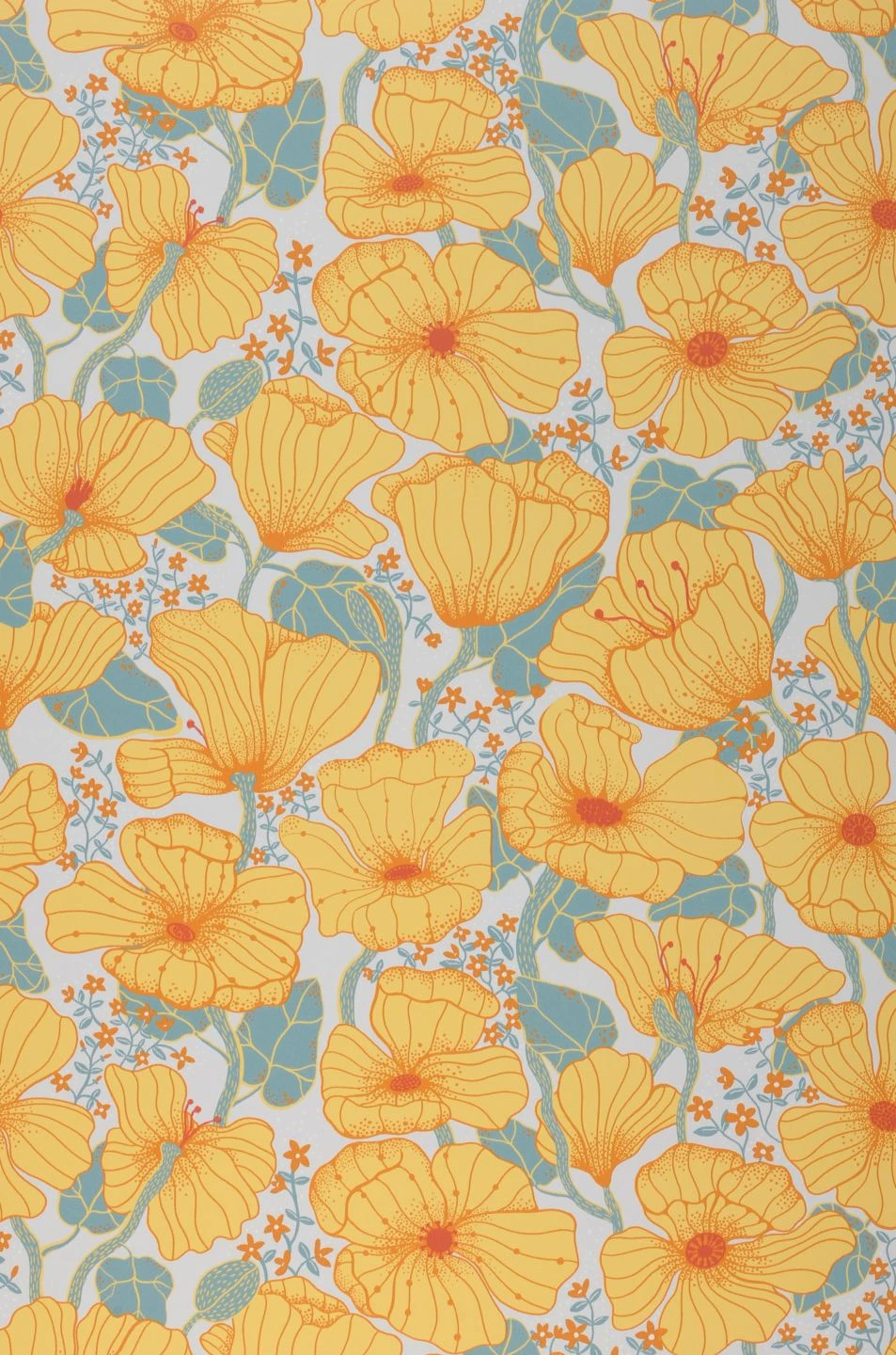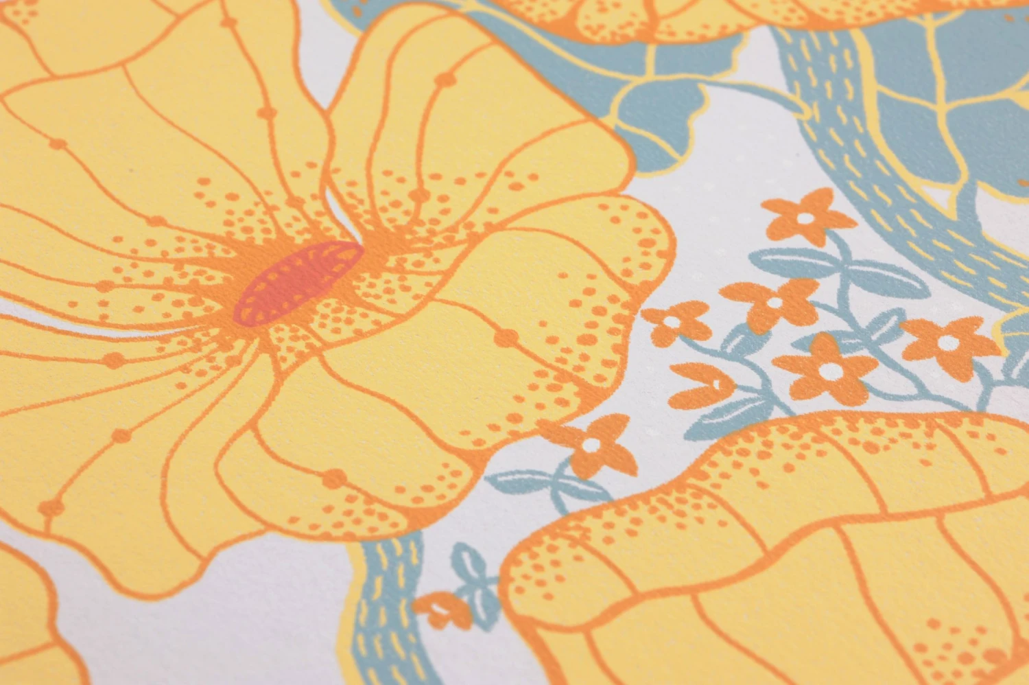 Ein Blumenmuster voller Lebendigkeit, das mit seinen leuchtenden Gelb- und Orangetönen Sonnenschein und ansteckend gute Laune verbreitet, charakterisiert die florale Tapete Ewa. Schöne Details auf den Blütenblättern und kleine sternförmige Blümchen im Hintergrund ergänzen das fröhliche Gesamtbild. Der Strahlkraft und Lebensenergie der großen, üppig geformten Blüten kann sich niemand entziehen!