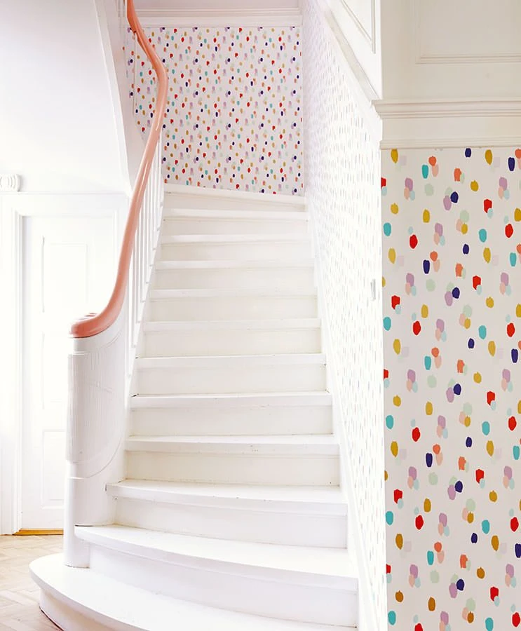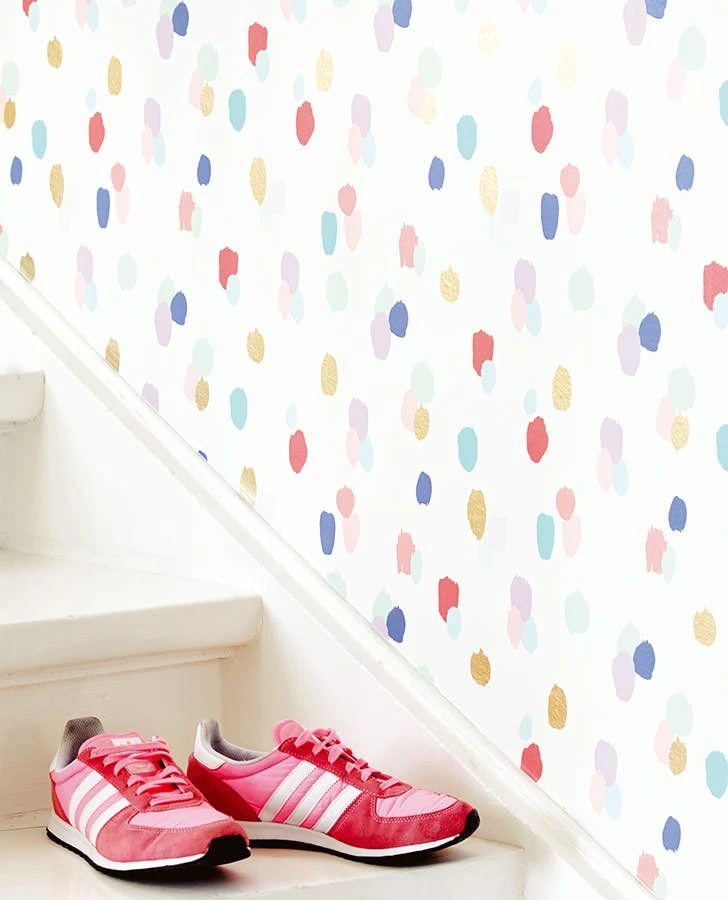Pinseltupfen wie zufällig auf der Tapete verteilt, vertreiben graue Wolken und wirken wie ein bunter Regen, der keine Traurigkeit erlaubt.