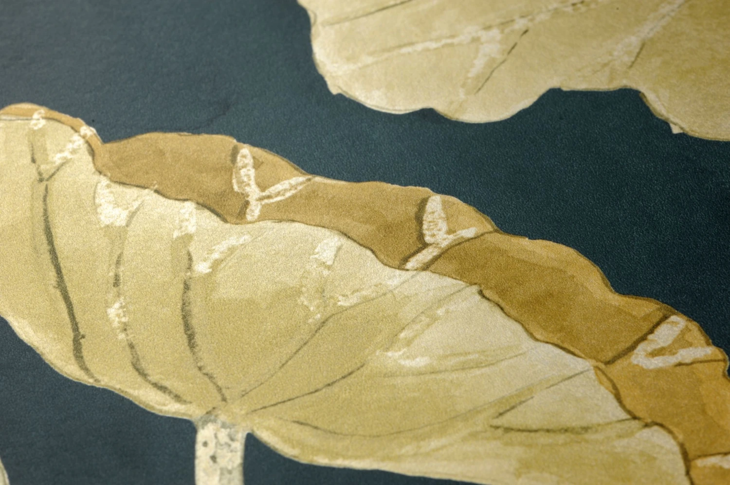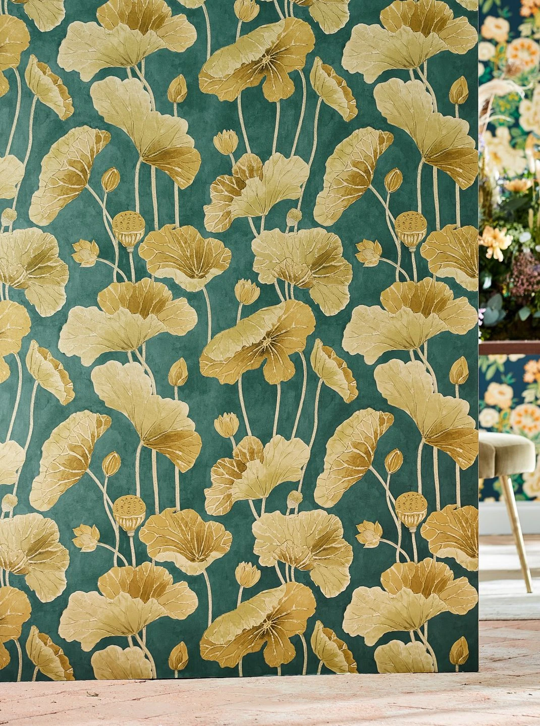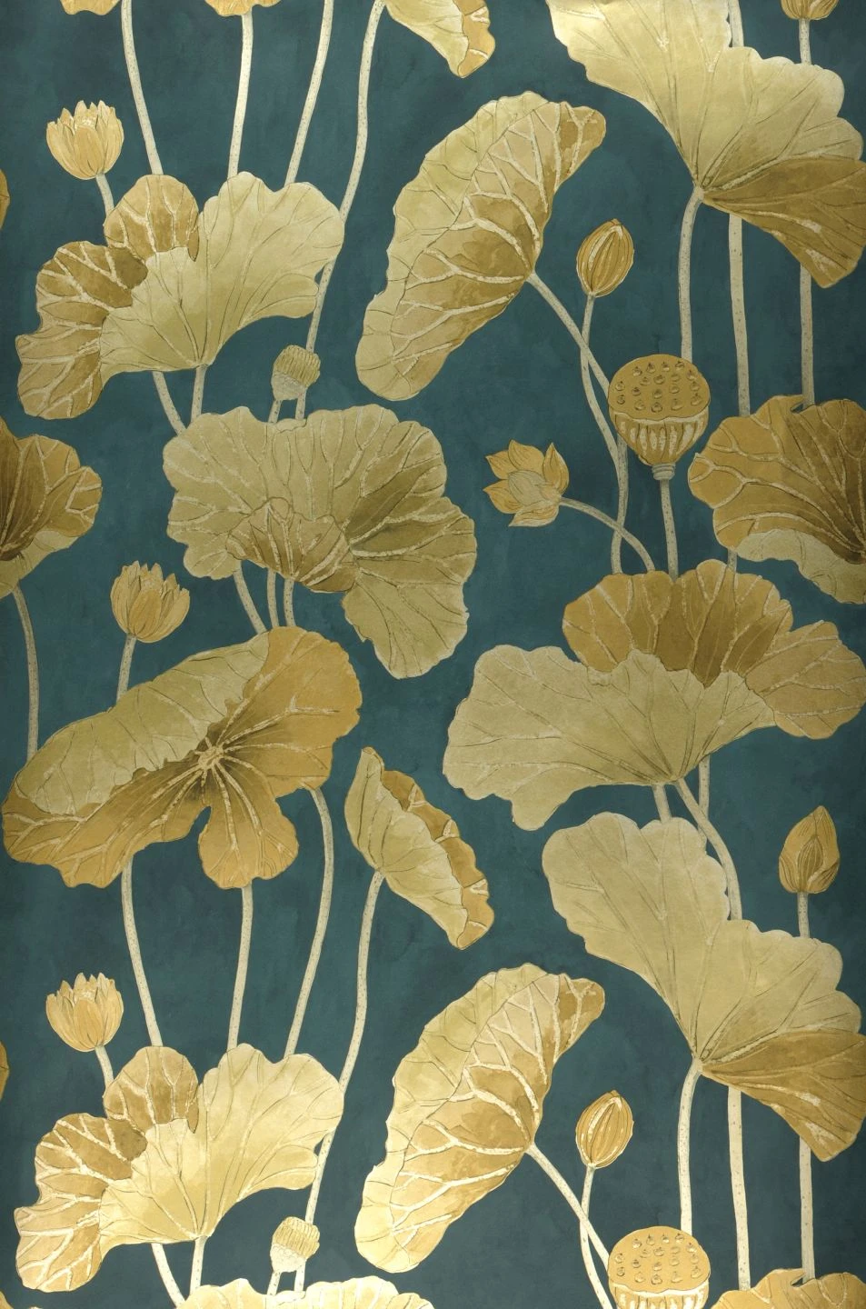 Die Blätter, Knospen und Fruchtstände der Lotuspflanze, die in der asiatischen Mythologie ein Symbol für Reinheit ist, üben in der faszinierenden Kombination verschiedener Schattierungen von Gelboliv und dem blaugrünen Grund eine fast hypnotische Wirkung aus. Ihrer Einrichtung im orientalischen Stil verleiht die Tapete mit ihrer Aquarell-Optik einen besonderen Reiz. Aber sie passt auch wunderbar zu anderen Stilrichtungen.