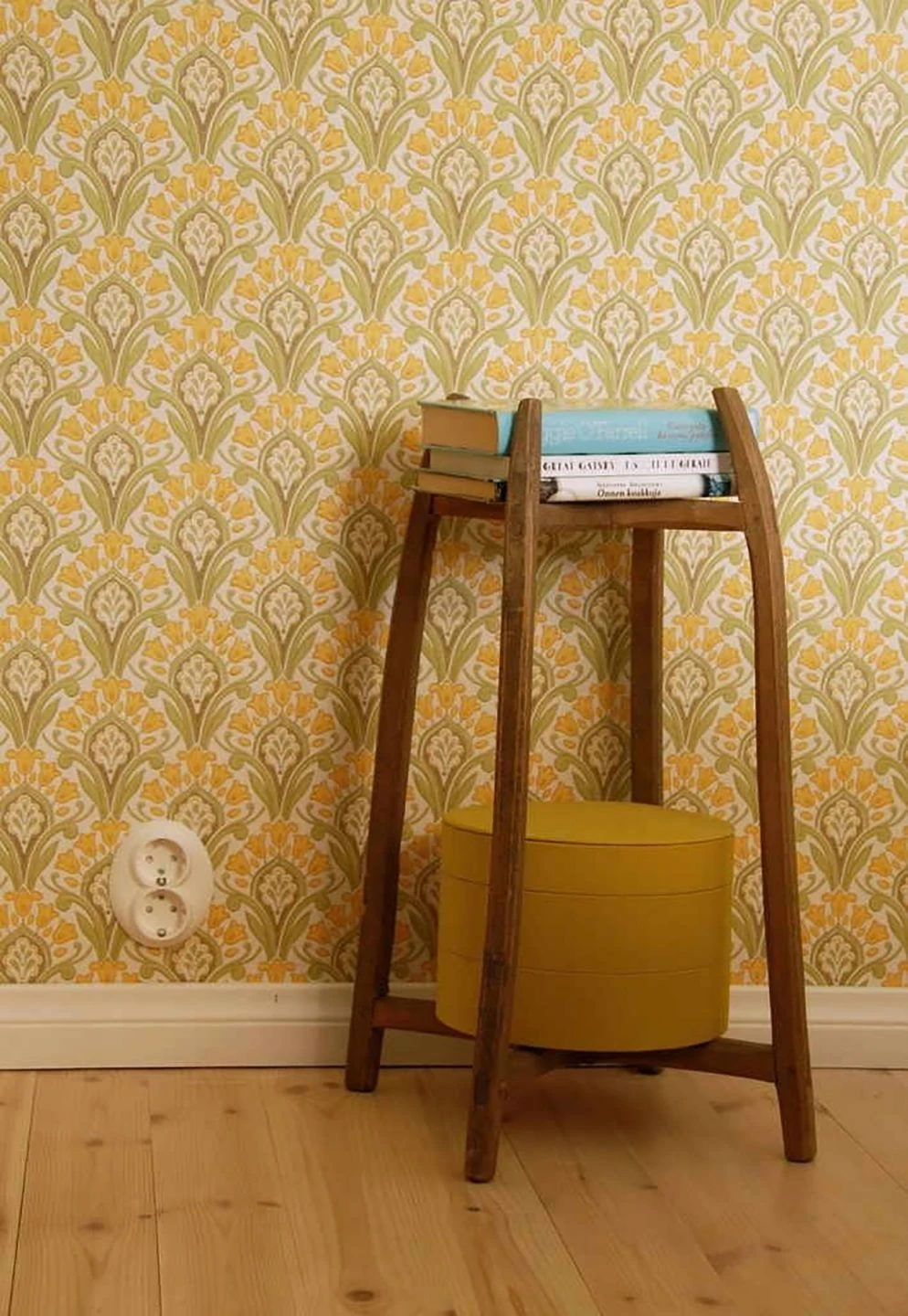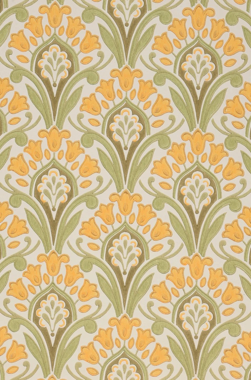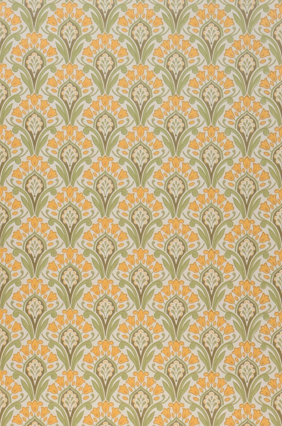 Zeitlose Klassik in nostalgisch anmutendem Maisgelb, Farngrün und Khakigrau auf cremeweißem Grund verschönert Ihren Raum mit einem symmetrischen, regelmäßigen Muster aus Jugendstil-Ornamenten. Die stilisierten Blumen sind im traditionellen Leimdruckverfahren auf die Papiertapete aufgedruckt. So unterstreicht Florence ihren Ursprung im klassischen Tapetendesign und verströmt den Eindruck von Qualität und Hochwertigkeit.