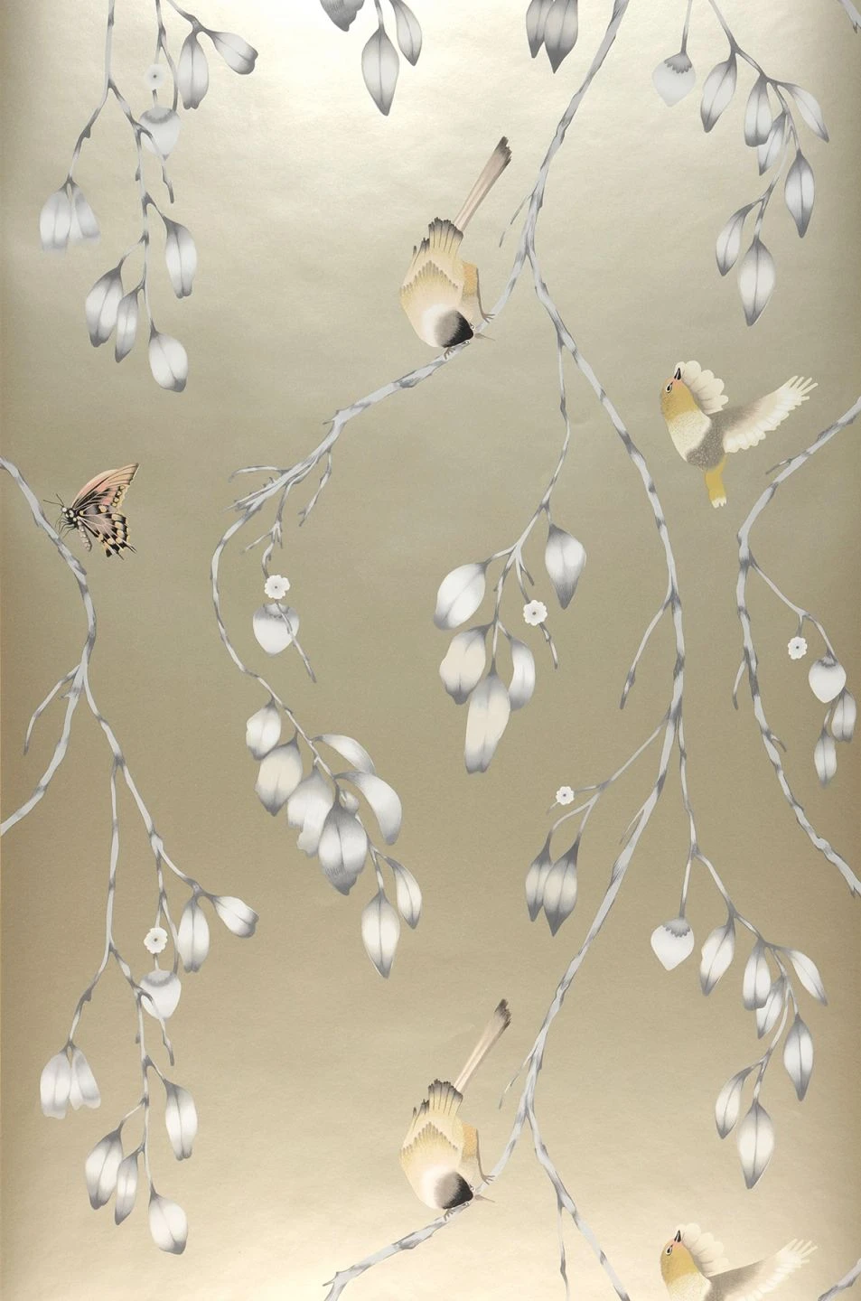 Sich nach unten schlängelnde Zweige mit feinen Blüten bilden den Tummelplatz für eine aktive Vogelschar. Die Romantik Tapete präsentiert sich in den weichen Musterfarben Beige, Cremeweiss, Grau, Graubeige, Hellrosa. Perlbeige als schimmernde Grundfarbe verleiht der glatten Vliestapete den extravaganten glamourösen Touch.