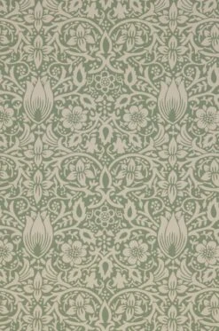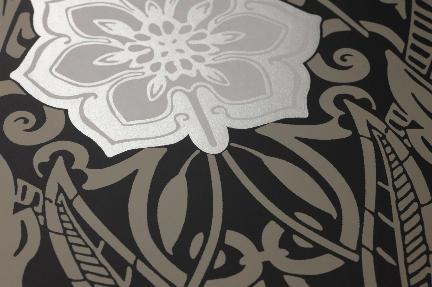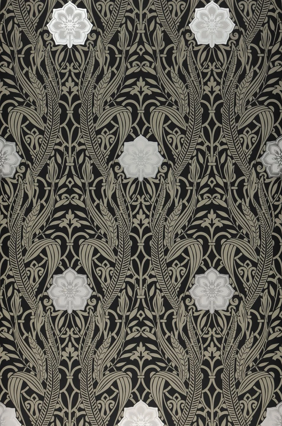 Wie die geschwungenen Verzierungen auf einem kostbaren Märchenbuch umgeben die silbern schimmernden Ornamente aus stilisierten Blättern und Ranken auf schwarzem Grund die Blüten in Weiß und Steingrau. Das Jugendstil-Design wirkt elegant und luxuriös und verströmt einen Hauch von Nostalgie, den Sie mit charaktervollen Möbeln und Deko-Elementen aus der Epoche des Jugendstils wirkungsvoll betonen können.