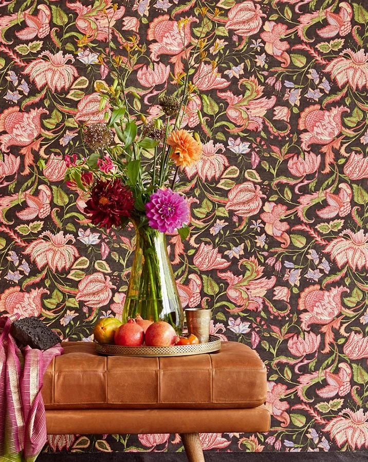 Indisches Blumenrohr und die zauberhafte Lotusblume haben Pate für die mondäne Blumentapete gestanden. Wie fein gewebt mutet die sanfte Struktur der Vinyltapete an, die auch in Feuchträumen wirkungsvoll zum Einsatz kommt. Auf schwarzgrauem Fond entfalten die Blütenranken in Cremeweiss, Erdbeerrot, Maigrün, Violett eine besonders expressive Stimmung.