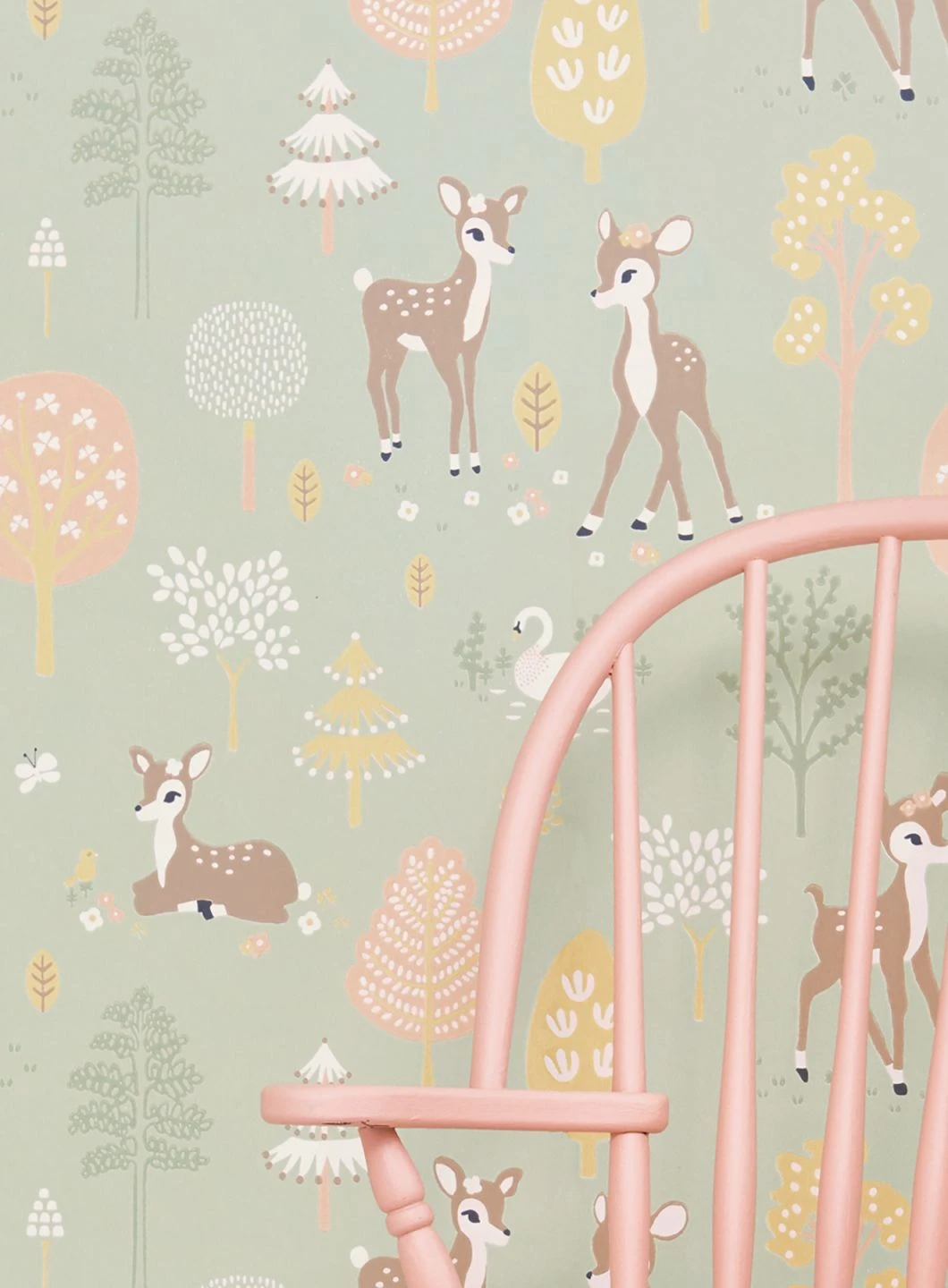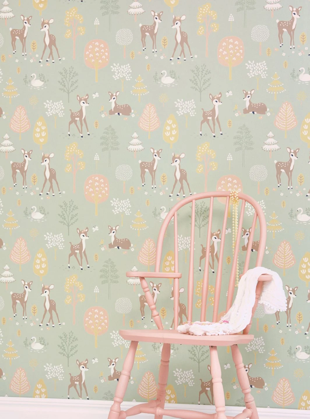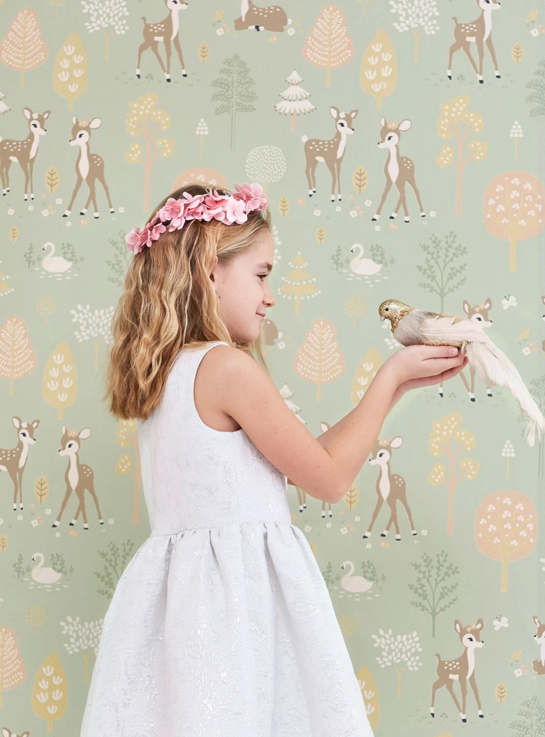 Junge Rehe mit Blumen auf dem Köpfchen, Schwäne und Schmetterlinge, dazwischen blühende Bäume – die kindgerechte Vliestapete aus dem Hause Majvillan zaubert eine friedliche, heile Welt an die Wände Ihres Kinderzimmers. In dieser freundlichen Umgebung kann sich Ihr Kind spielerisch frei entfalten. Die hellen Farbtöne auf blassgrünem Grund sind im Leimdruckverfahren aufgebracht und vielseitig kombinierbar.