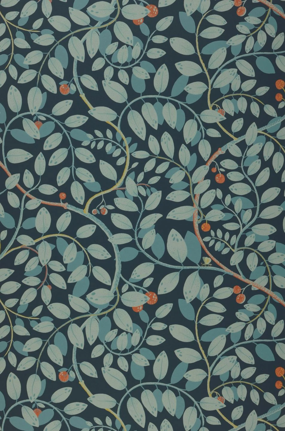 Zwischen verschlungen rankenden Zweigen und Blättern verbergen sich zart gemusterte Schmetterlinge und kräftig rotorangefarbene Früchte. Inmitten des dunkel anthrazitfarbenen Untergrunds und der gedeckten Grüntöne der Blätter und Zweige betonen Muster in Honiggelb, Rotorange und Minttürkis geschickt die geschwungenen Formen der Ranken. Die botanische Tapete lässt sich in einer Vielzahl von Kombinationsmöglichkeiten denken.