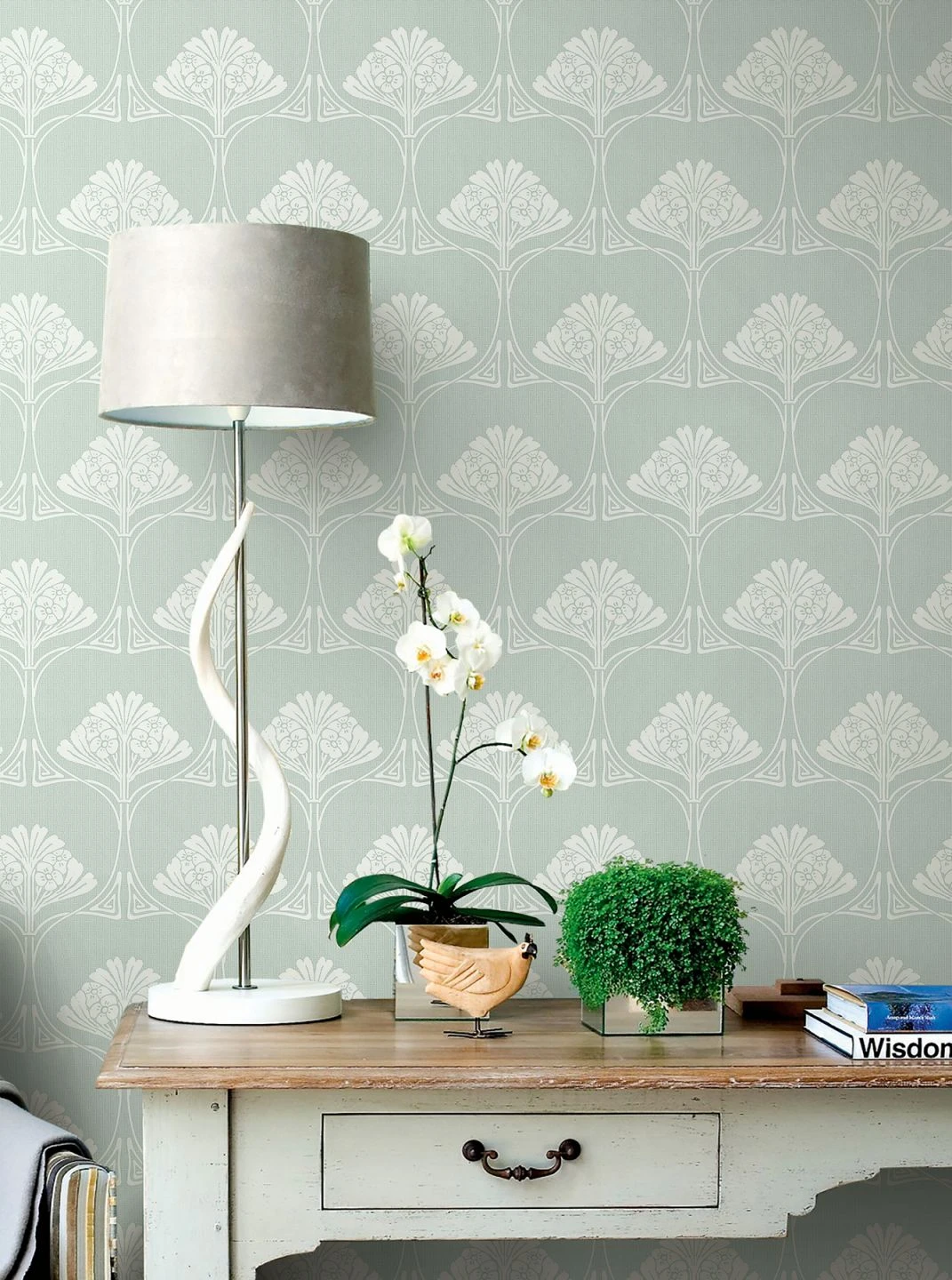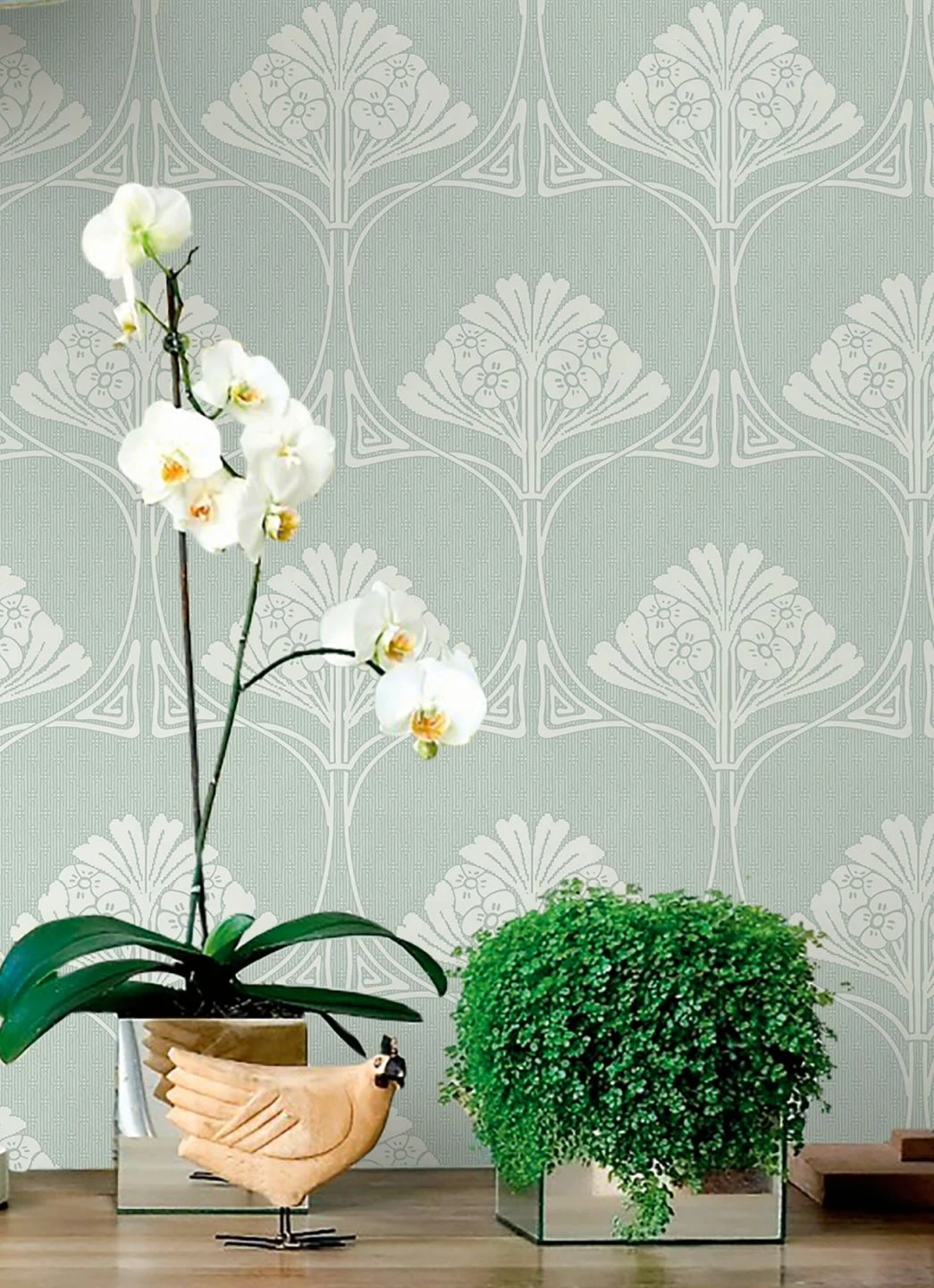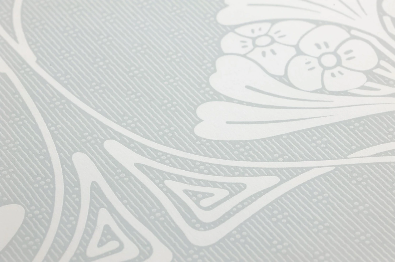 Bis ins feinste Detail begeistert Designtapete Harmony mit Jugendstilelementen, die sich vom Großen ins Kleine entwickeln und dabei das Auge charmant täuschen. Die grün-weiße Farbgebung der glatten Papiertapete beflügelt den frischen Landhaus-Stil, den botanischen Romantik-Look oder den leichten Shabby-Chic.
