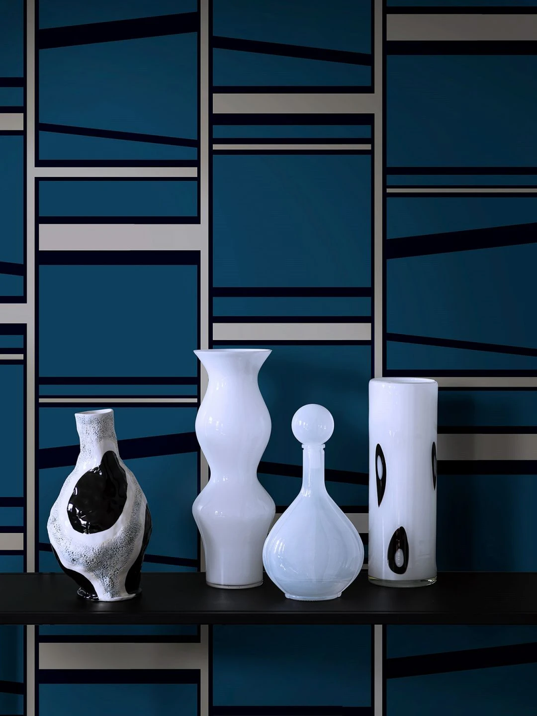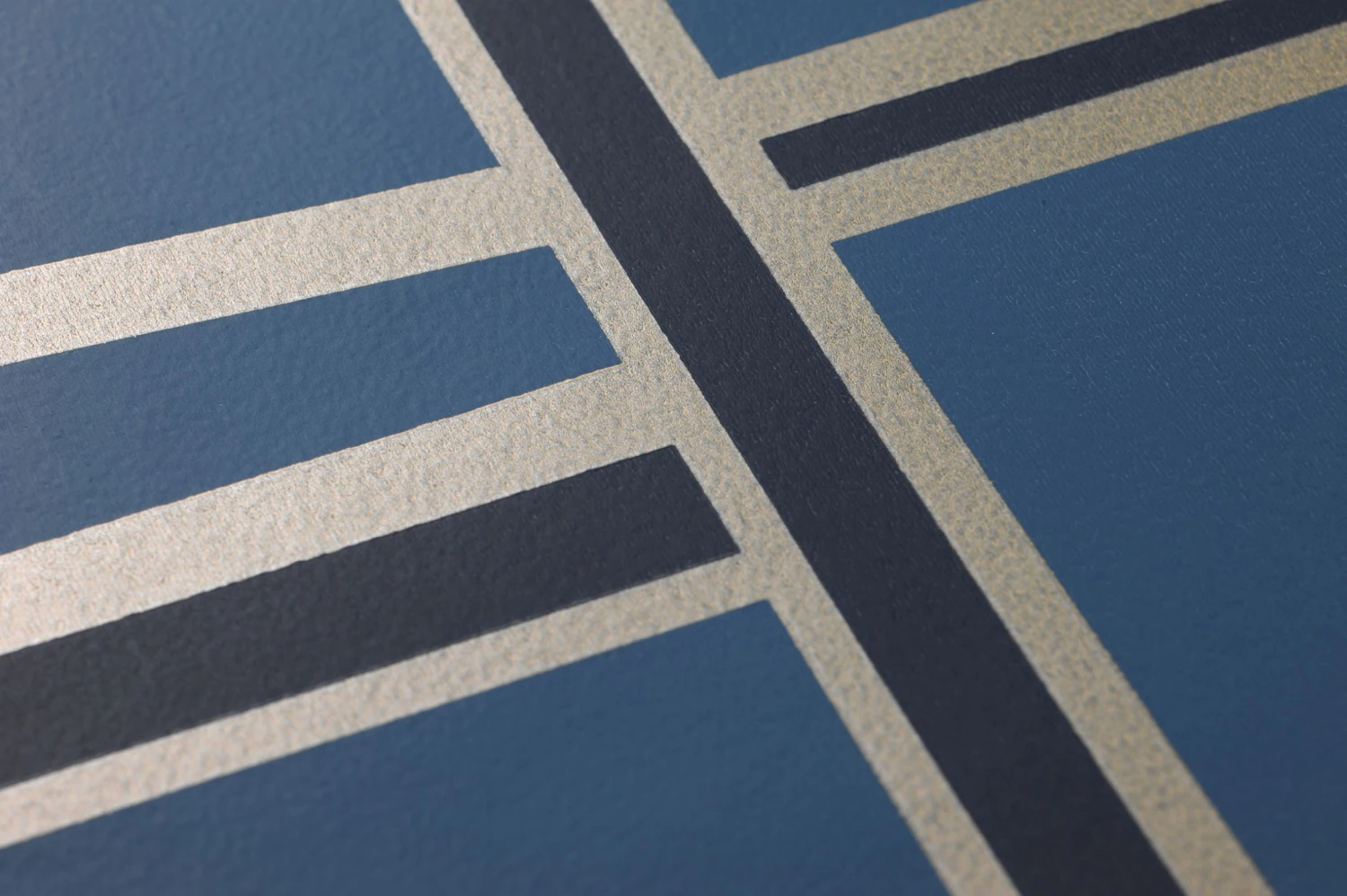 Geometrische Elemente, Blöcke und Streifen setzen sich aus Flächen in leuchtendem Azurblau, Graublau und leicht schimmerndem Perlbeige zusammen und geben Halt und Ordnung. Die Vliestapete strahlt in ihrer geometrischen Sachlichkeit schlichte Eleganz aus und punktet mit der Kombination der verschiedenen Blautöne. Ihr Wohn- oder Schlafzimmer bereichert sie ebenso wie ein zeitlos schickes Büro.