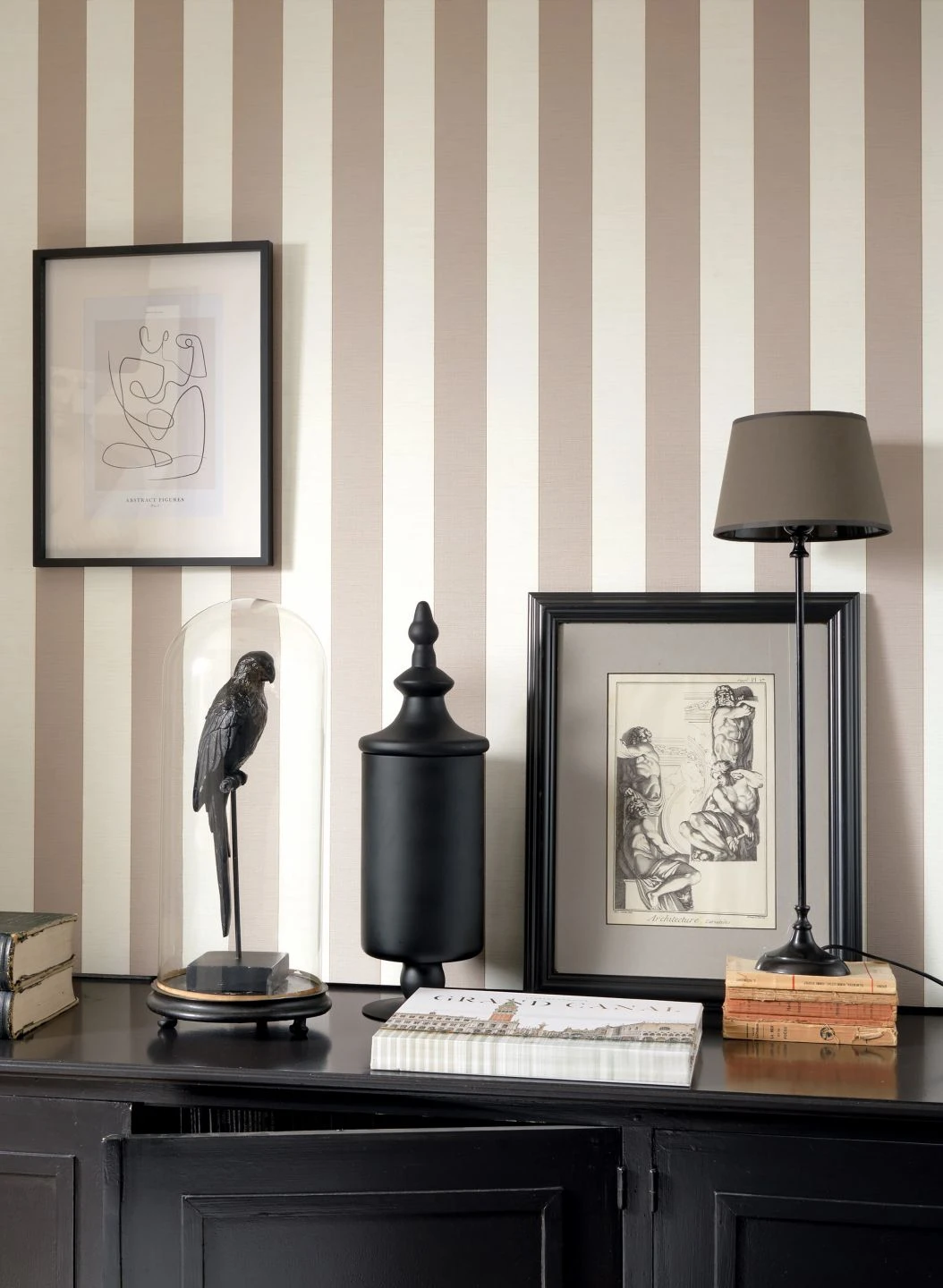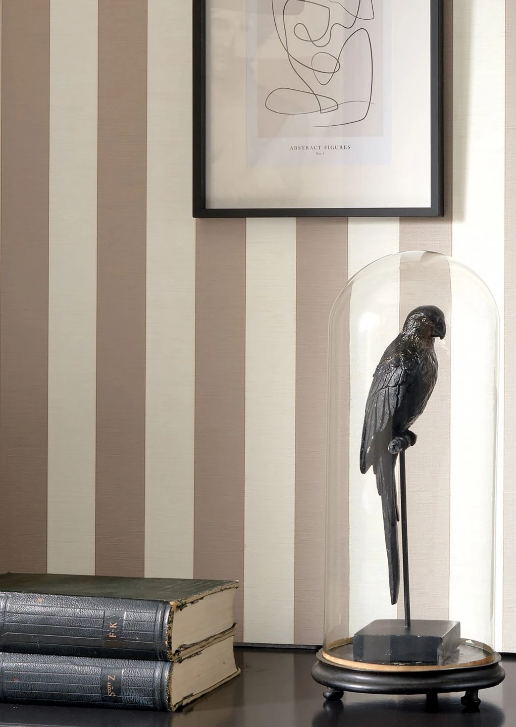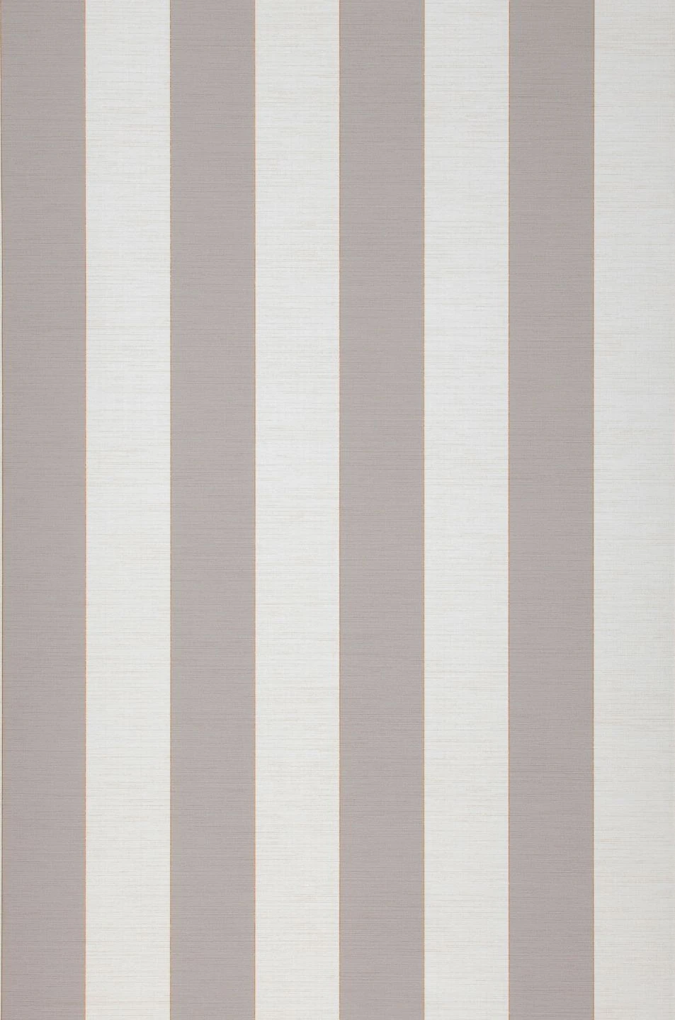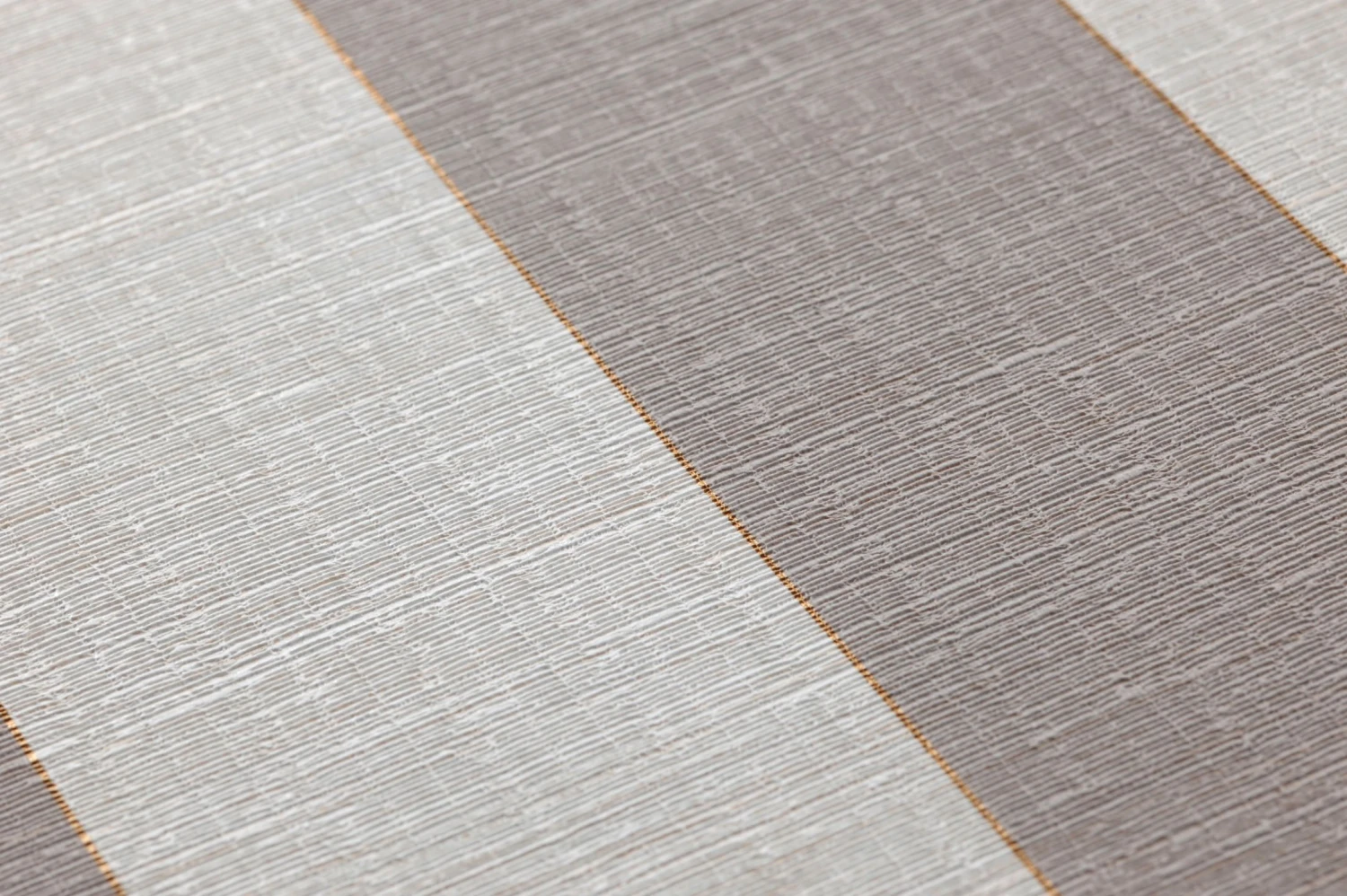 Breite Streifen in Beigegrau und Weiß werden durch schmale, bronzefarben schimmernde Linien voneinander abgesetzt. Die Wirkung einer eleganten Textiltapete entsteht durch die feine, textilähnliche Struktur der Vinyloberfläche. Die Tapete bietet antiken Möbeln in dunklen Holztönen einen klassisch-eleganten Hintergrund, lässt sich durch ihr scheuerbeständiges Material aber auch in Ihrem Bad wirkungsvoll einsetzen.