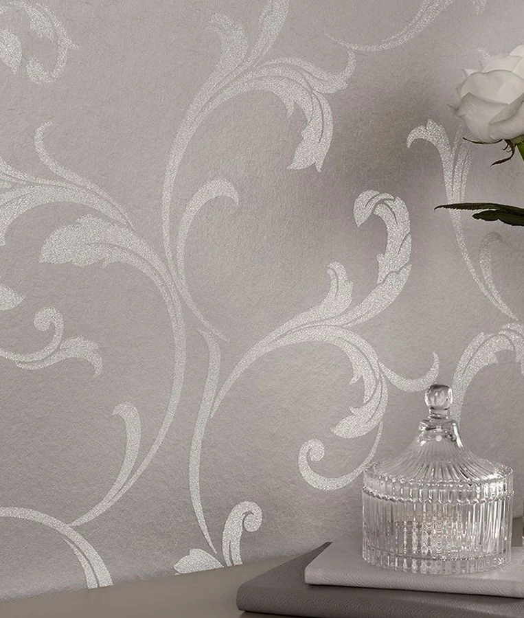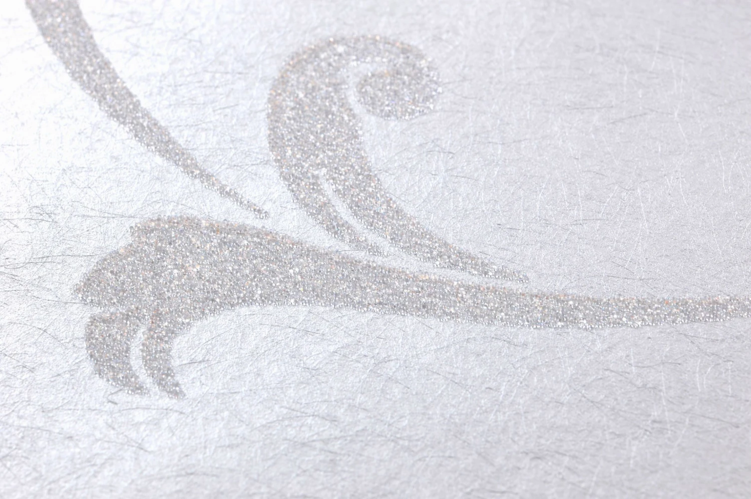 Über und über mit Glasperlen besetzt, präsentiert sich das florale Muster, das auch in prunkvollen Gemächern des Barock seinen idealen Platz finden würde. Das fühlbare Relief nimmt das Thema mit verästelnden Strukturen auf. Aluminium und Weiß mit schimmernder Optik sorgen für das Plus an Ausgeglichenheit.