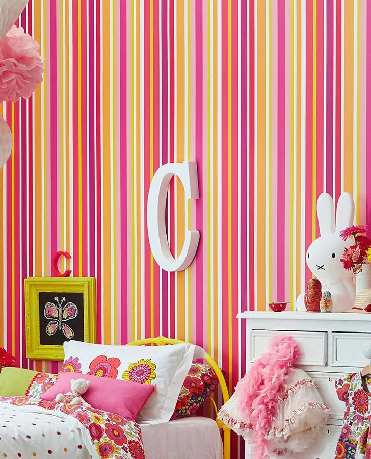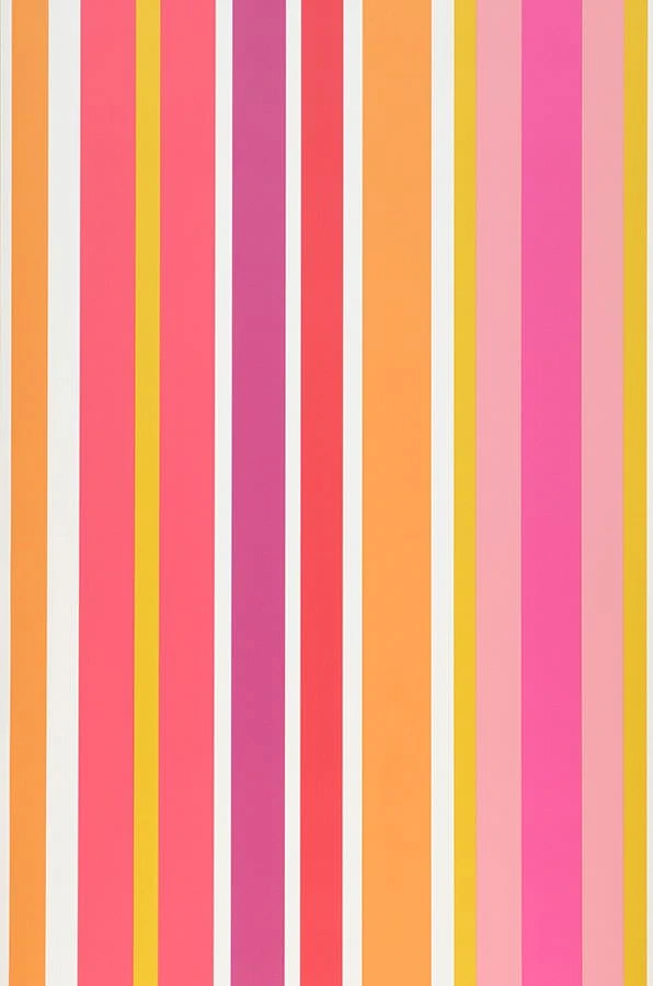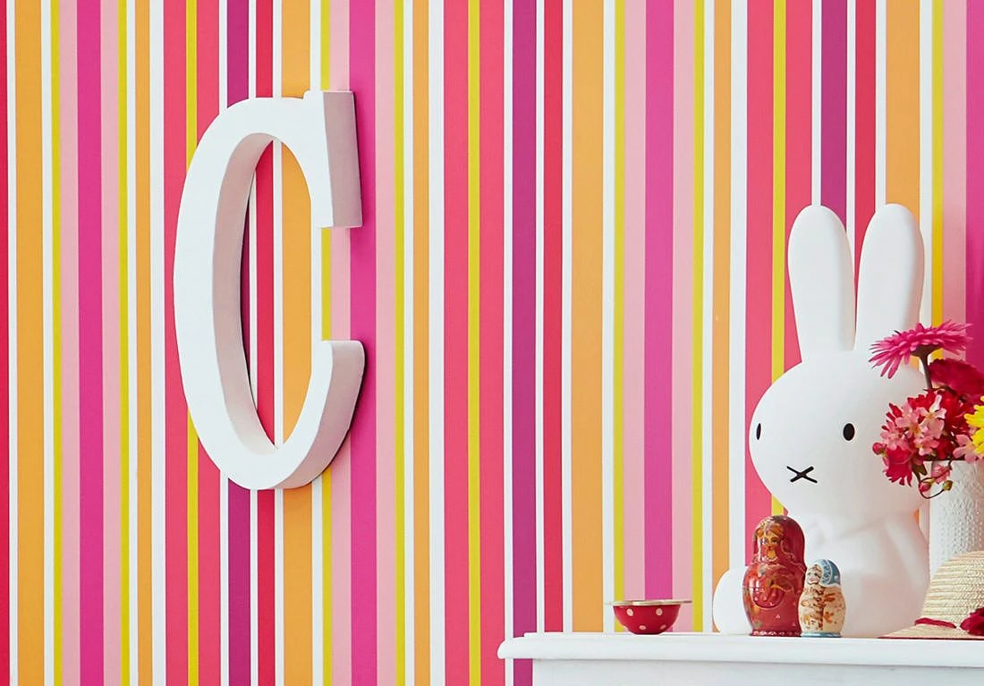 Cremeweiß, Honiggelb, Orange, Rosa- und Rottöne in verschieden breiten Streifen lösen die Fläche Ihrer Wand fröhlich und sonnig auf. So kann regnerisches Wetter Ihnen nichts anhaben – mit dieser Streifentapete in Bonbonfarben scheint immer die Sonne. Je nach Anbringung der Tapetenbahnen – längs oder quer – erzielen Sie ganz unterschiedliche Raumwirkungen und betonen entweder die Höhe Ihres Zimmers oder die Ausdehnung seiner Grundfläche.