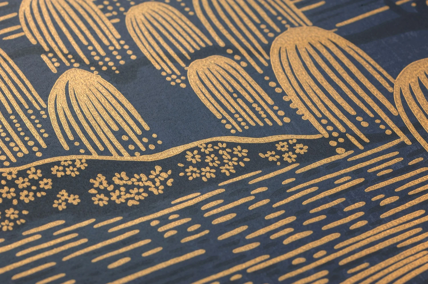 Nur aus Linien, Punkten und Tupfern von Goldfarbe und Schwarz entsteht auf dem ins Blaue spielenden Anthrazitgrau des Hintergrunds eine japanische Parklandschaft. Berge, Bäume mit hängenden Zweigen, Blumen und stille Teiche werden nur angedeutet. Die Tapete lebt vom Kontrast des schimmernden Goldes zum dunklen Grund und nimmt Sie mit auf eine Reise durch Raum und Zeit ins Reich der japanischen Ästhetik.