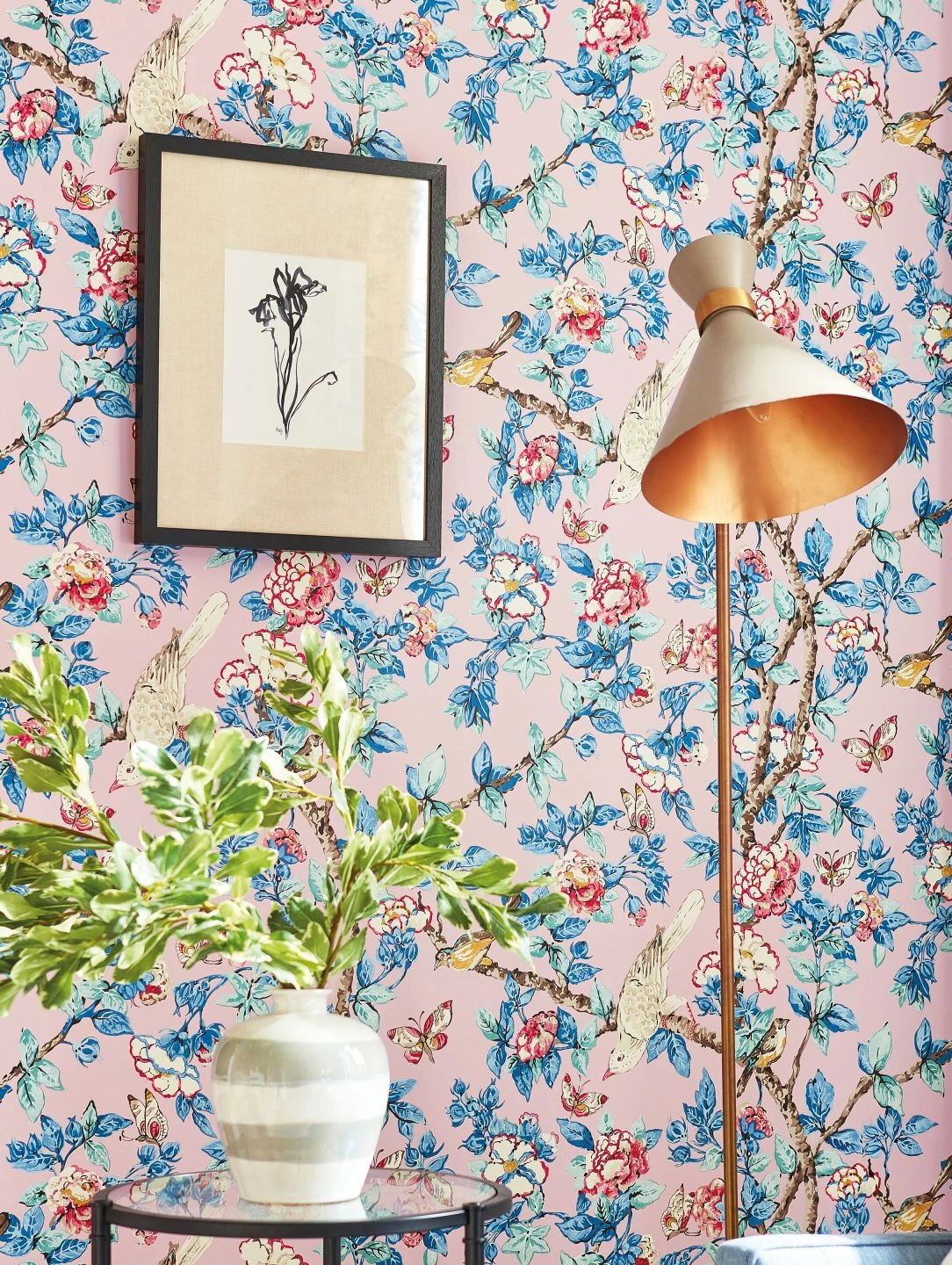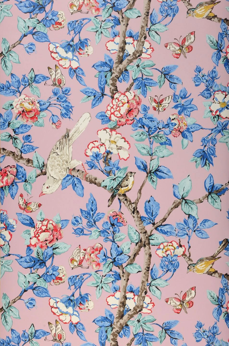 Poetisch und farbenfroh dekorieren Sie Ihren Raum mit der botanischen Tapete Jardine. Wie auf einem Gemälde im Stil der asiatischen Kunst wirken die Zweige voller Blätter in sanften Blautönen und Blüten in Perlweiß und Orientrot. Vögel mit buntem Gefieder und Schmetterlinge vervollkommnen das Bild. Mit schönen Details sind die Blüten, Blätter und die Flügel der Schmetterlinge versehen. Ein wahres Kunstwerk für Ihre Wände!