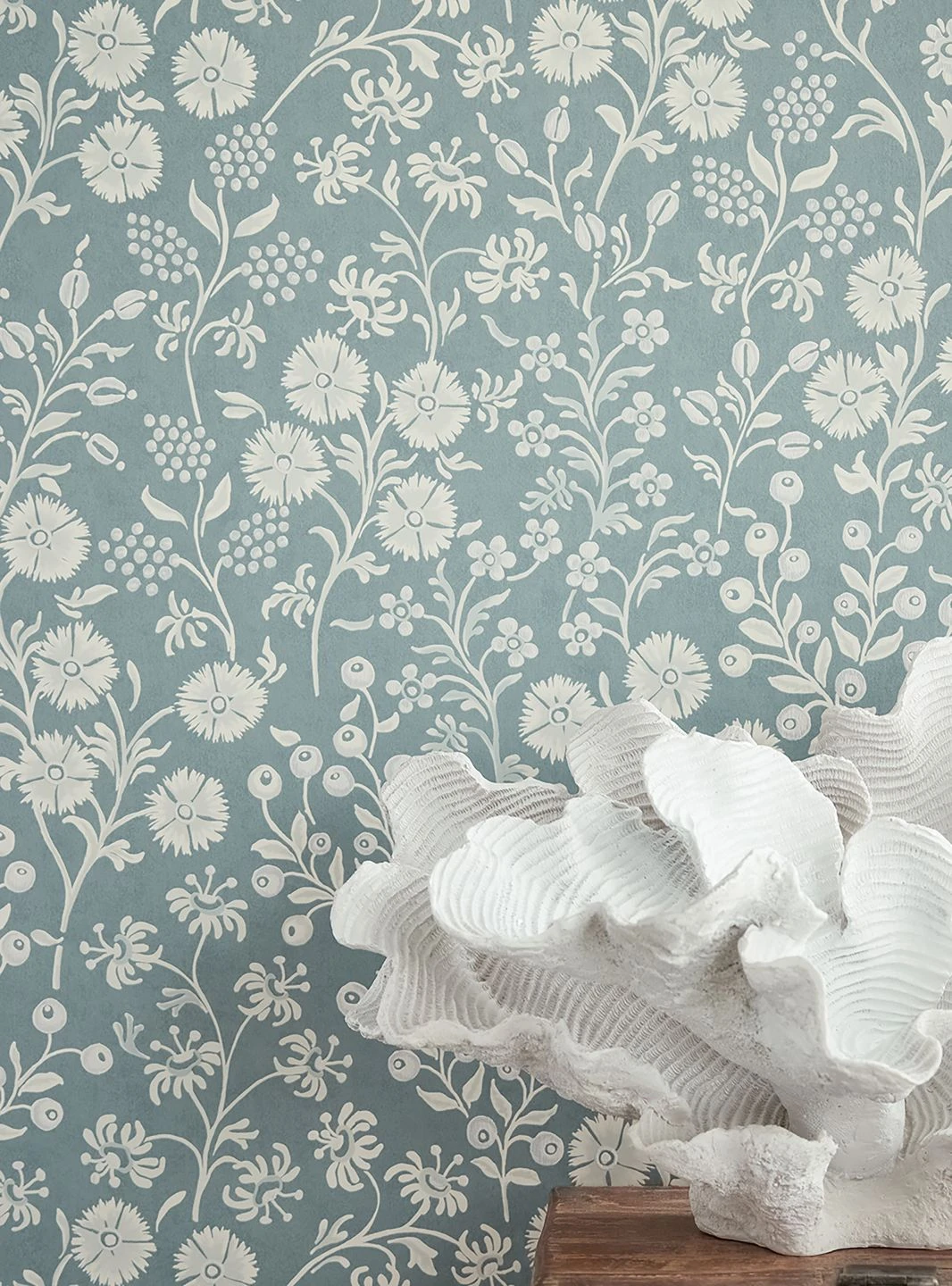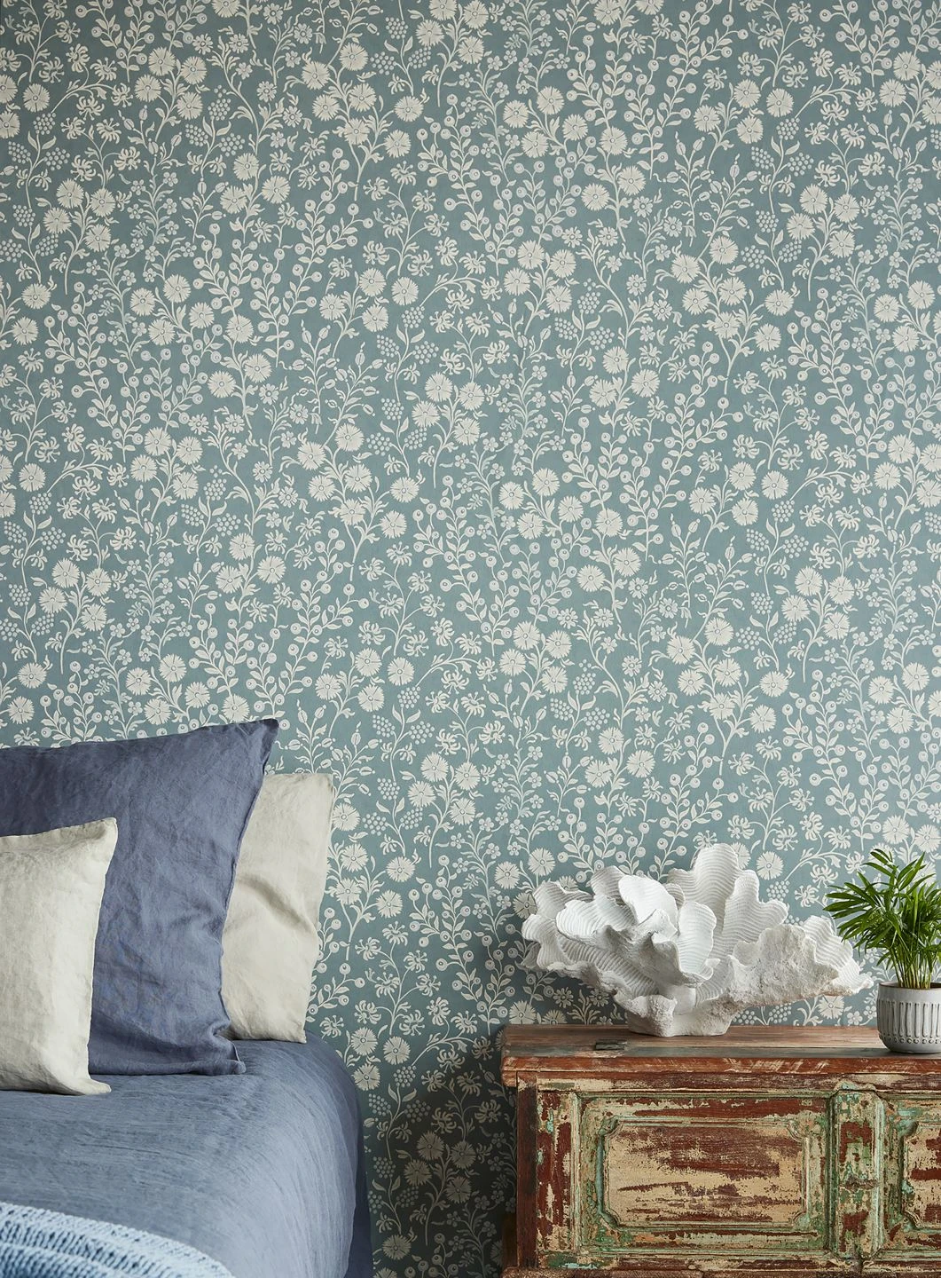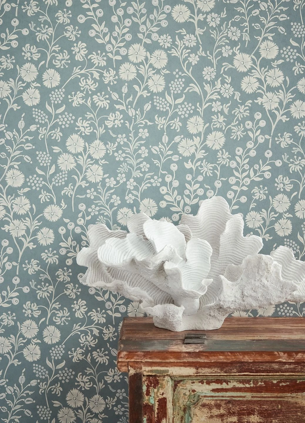 Cremeweiß mit ein wenig Achatgrau und Zartblau – mehr braucht es nicht, um eine Vielfalt von Blumen, Früchten und Blättern als helle Silhouetten auf dem grünblauen Grund darzustellen. Diese Sparsamkeit der Farben, die mit einem verblüffenden Formen- und Detailreichtum einhergeht, macht Vliestapete Jessica zu einem besonders wirkungsvollen Hintergrund für Ihren Raum im skandinavischen Einrichtungsstil – egal ob Schlafzimmer, Küche oder Wohnzimmer!