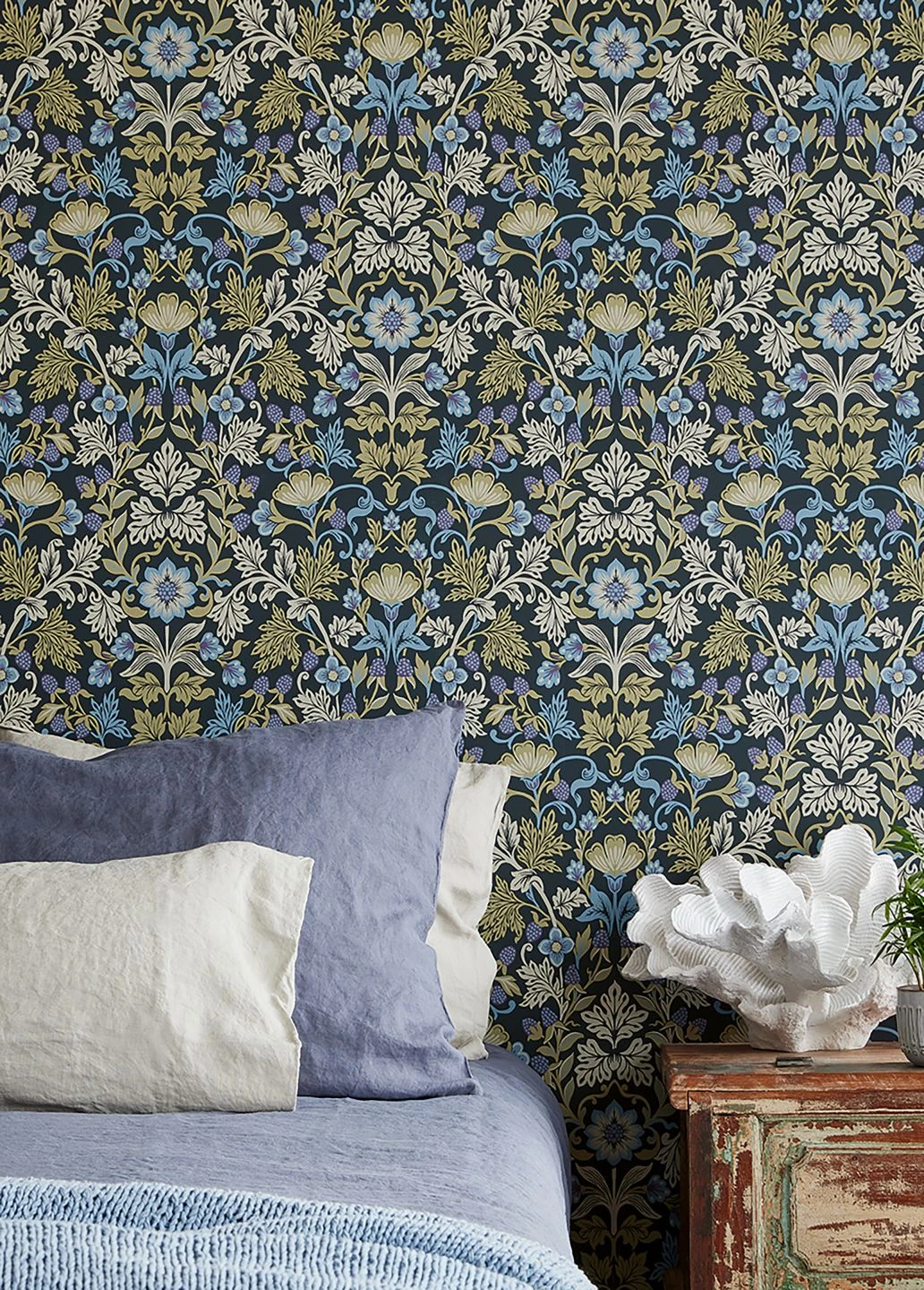 Ein klassisches Blumenmuster wie das einer imposanten Barocktapete gewinnt hier durch die verschiedenen Blautöne und das zurückhaltende Schilfgrün und Achatgrau kühle Eleganz. Auf dem anthrazitgrauen Untergrund strahlen die Farben der stilisierten Blüten, Blätter und Beeren geradezu. Für Ihr Schlafzimmer in hellen Farben oder ein repräsentatives Wohnzimmer ist Vliestapete Josefin eine elegante, traditionsbewusste und zugleich zeitlos heutige Bereicherung.