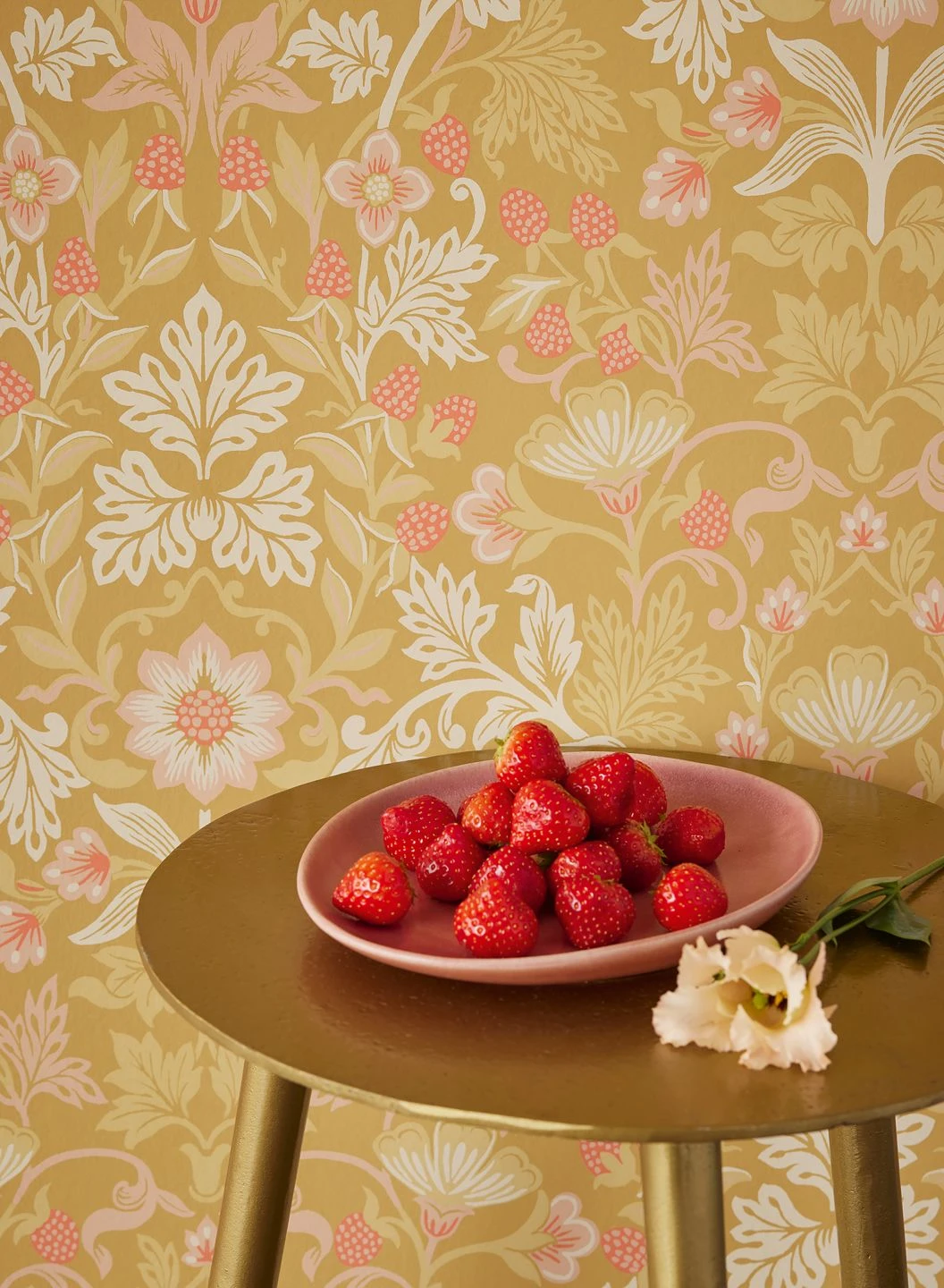 Das kunstvolle barocke Muster aus Blumen, Blattranken und reifen Erdbeeren ist in einer sehr stimmungsvollen Mischung von Ocker, Rosatönen und hellem Elfenbein und Grünbeige gehalten. Die Farbkombination schlägt die Brücke vom klassischen Design zum skandinavischen oder dem Landhaus-Stil, die Vliestapete Josefin überzeugend und charismatisch begleitet. Helles oder dunkles Holz, aber auch weiße Möbel sind tolle Ergänzungen.