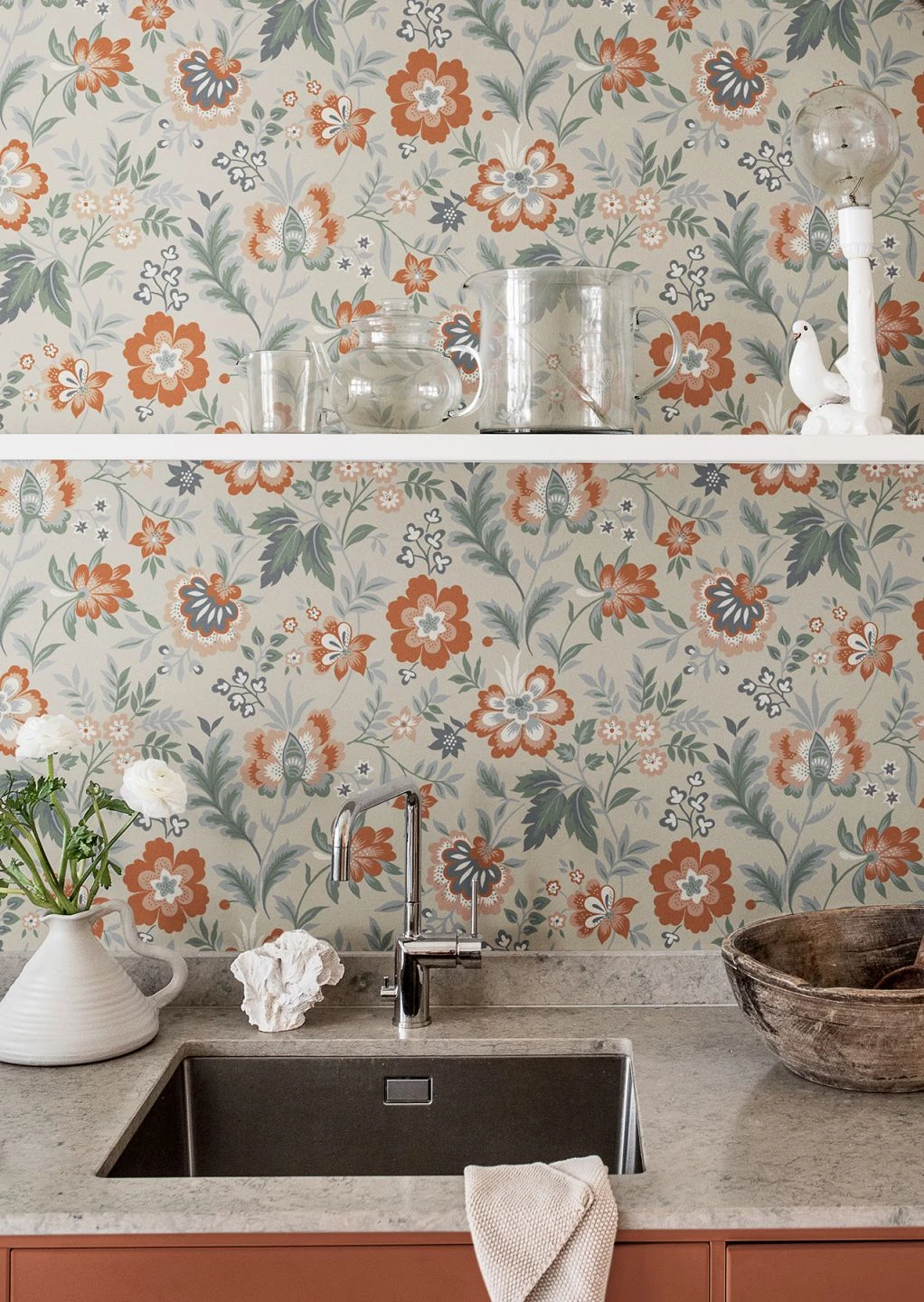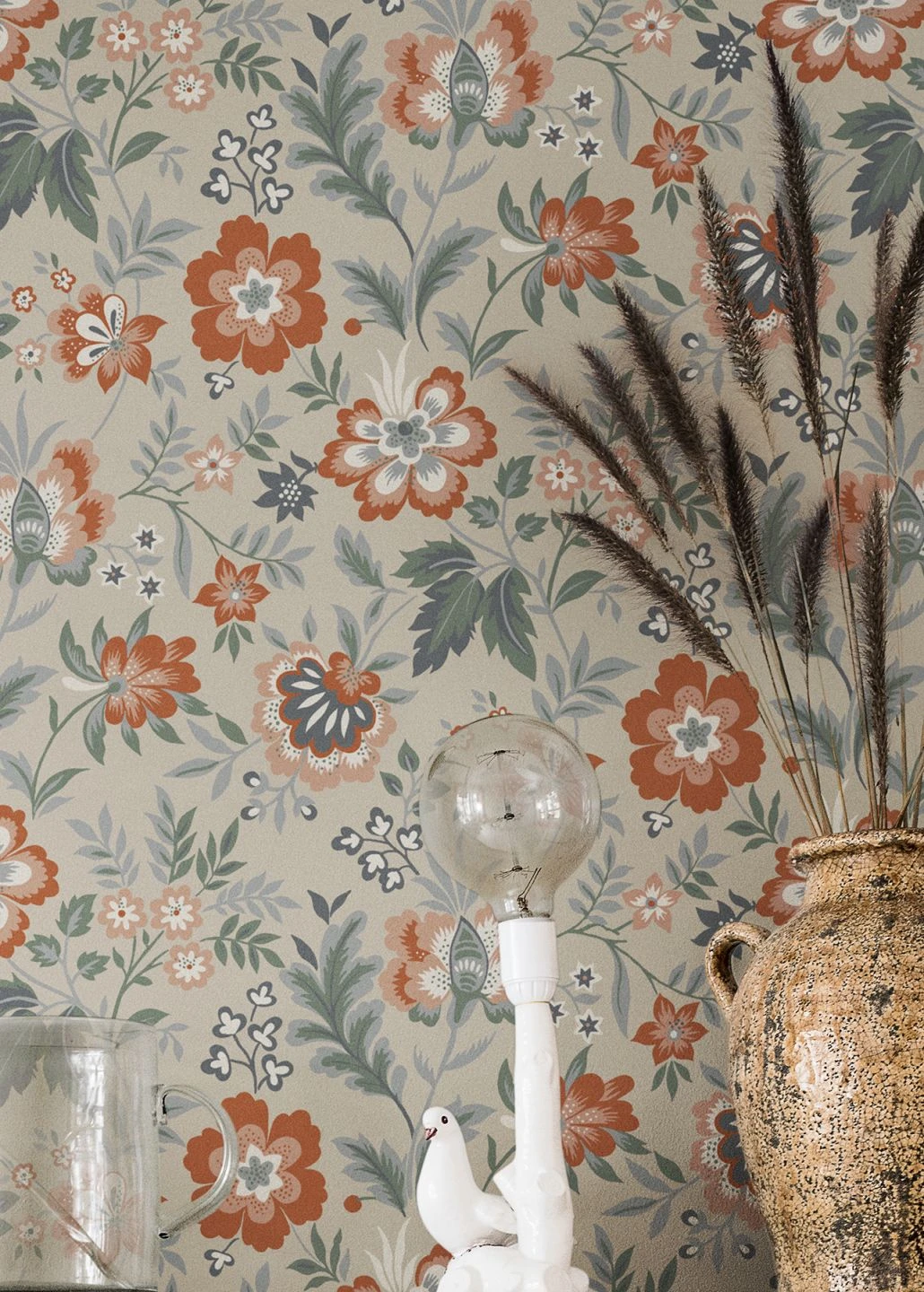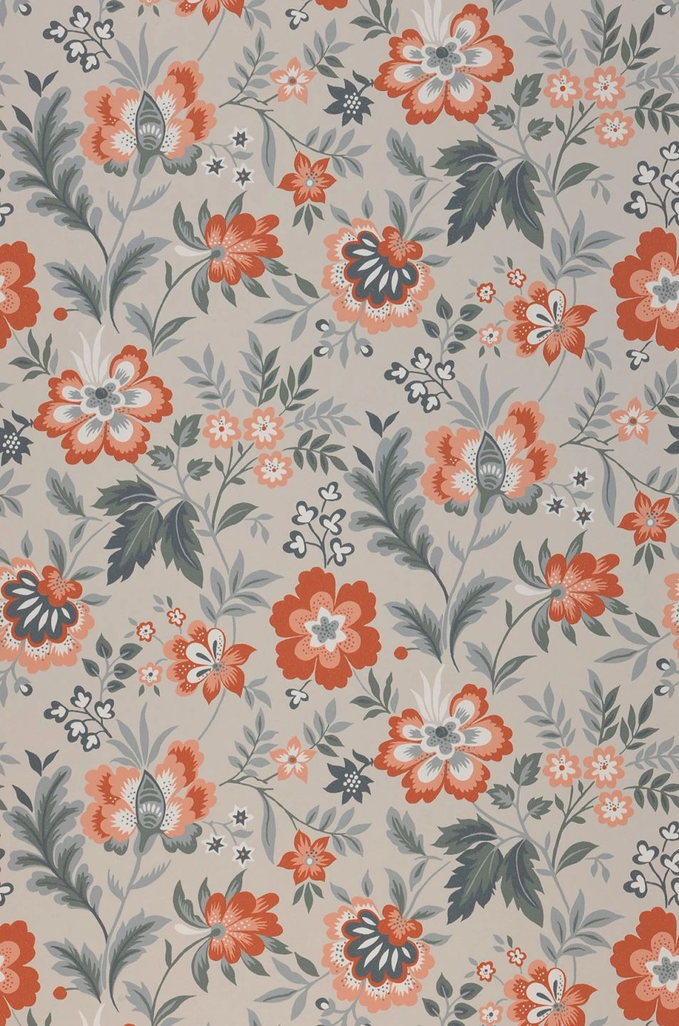 Abstrakte Blumen klassisch aufgelegt – Leben Sie Ihren eigenen Stil, unkonventionell, als Experiment und mit Farben wie Beigerot, Graphitgrau, Grau, Kieferngrün, Kupferbraun, die anregend wie ungewöhnlich sind. Dank der waschbeständigen Oberfläche sind Ihrer Gestaltungslust kaum Grenzen gesetzt.
