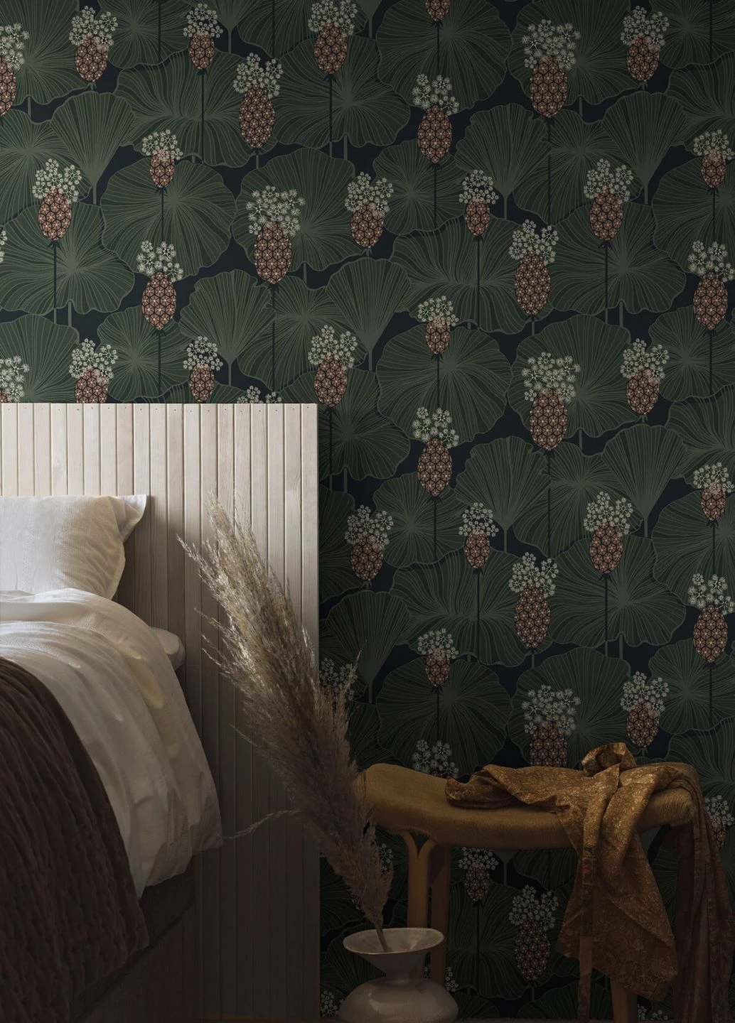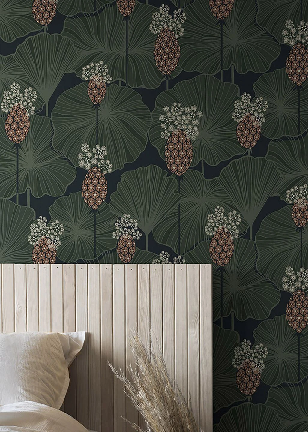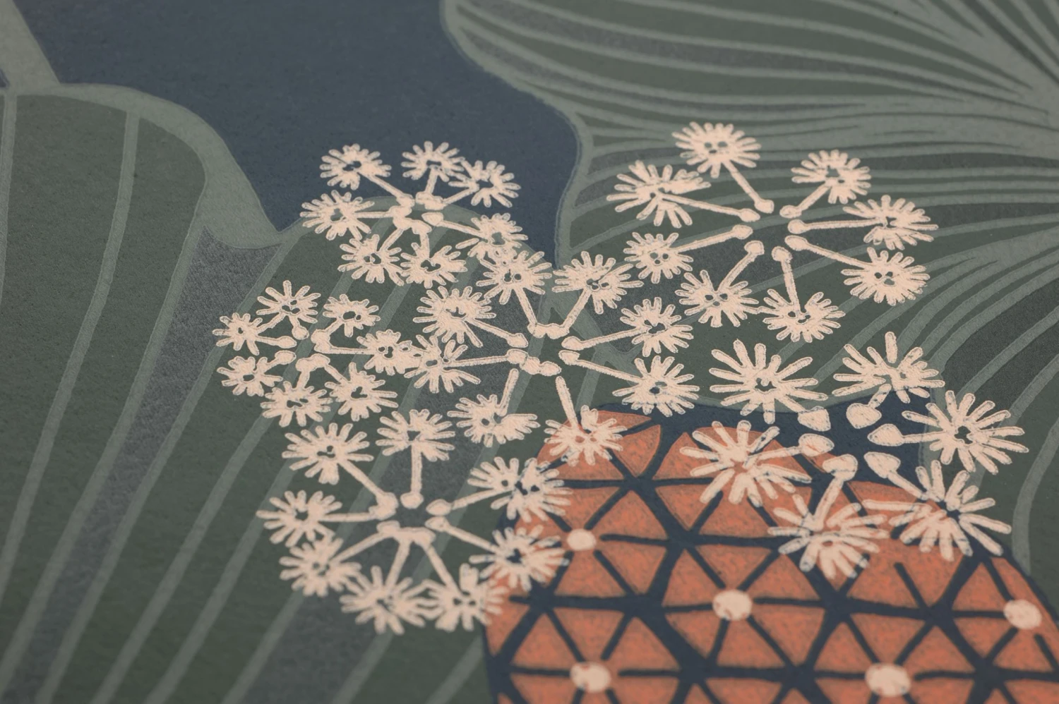 Wie beschirmt von einem lebendigen Blätterdach fühlen Sie sich mit dieser Vliestapete in gedeckten Farben und Cremeweiß. Die stilisierte Form und Struktur der großen Blätter entsteht durch Linien in Grüntönen. Blüten in Rosenholz und Cremeweiß ergänzen den exotischen Charakter. Einen stimmigen ästhetischen Eindruck ergibt die Kombination mit einem der Farbtöne der Tapete und mit klaren Einrichtungselementen im asiatischen Stil.