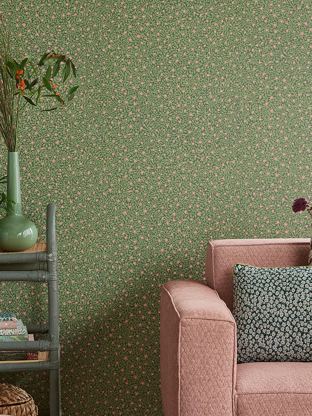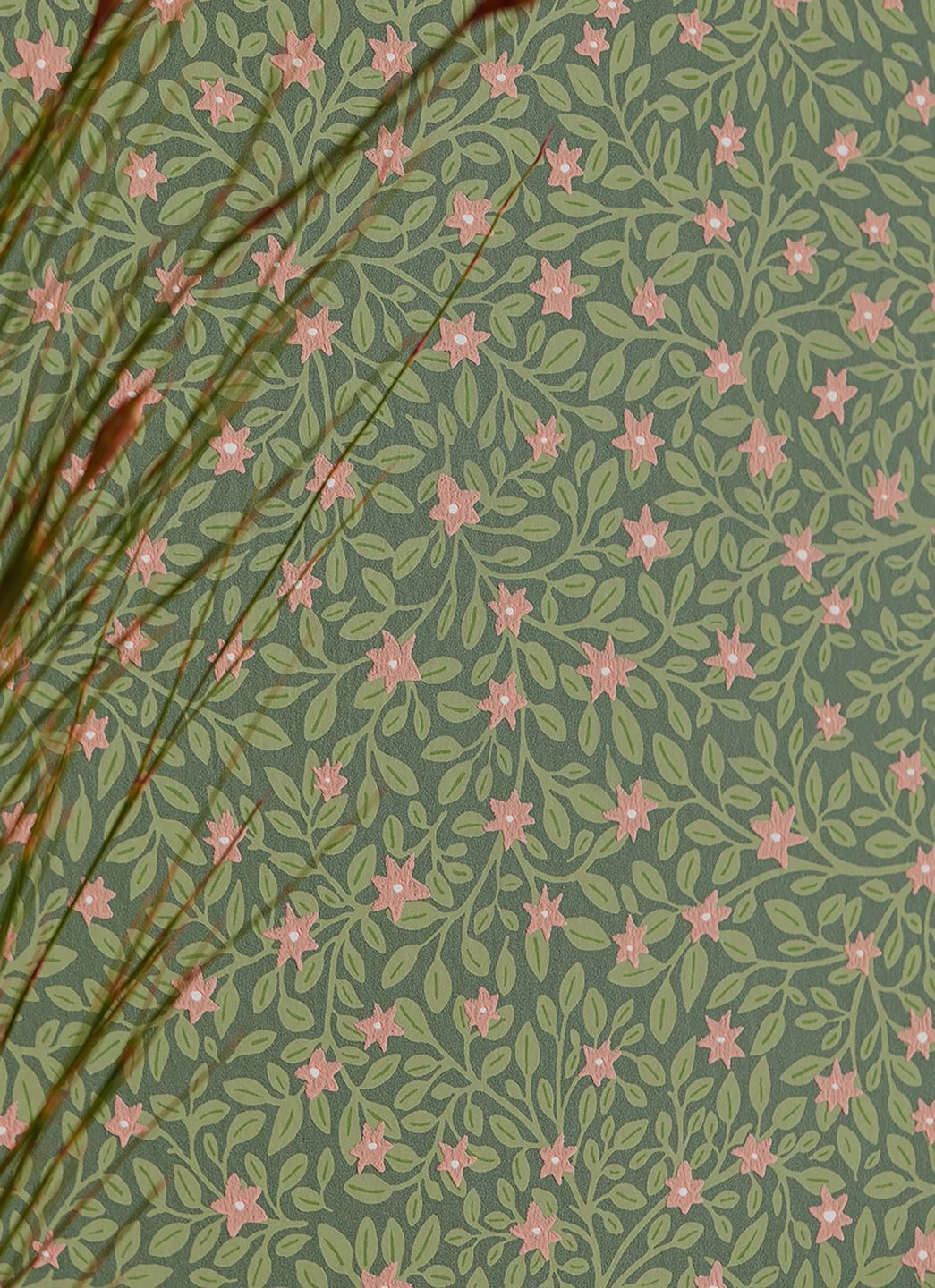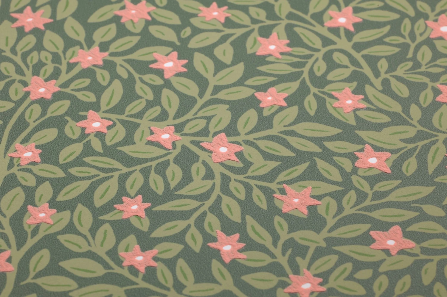 Wie kleine Sterne sind die Blüten geformt, die mit ihrem Rosaton wunderschön zwischen den unzähligen blassgrünen Blättern und Zweigen auf dem kieferngrünen Grund hervorleuchten. Die Vliestapete passt zum Landhaus-Stil genauso gut wie zu einer modernen Einrichtung. Mit natürlichen Holztönen harmoniert sie ebenso wie in Verbindung mit dem passenden Rosa oder Weiß. Ihrer Kreativität stehen alle Möglichkeiten offen!