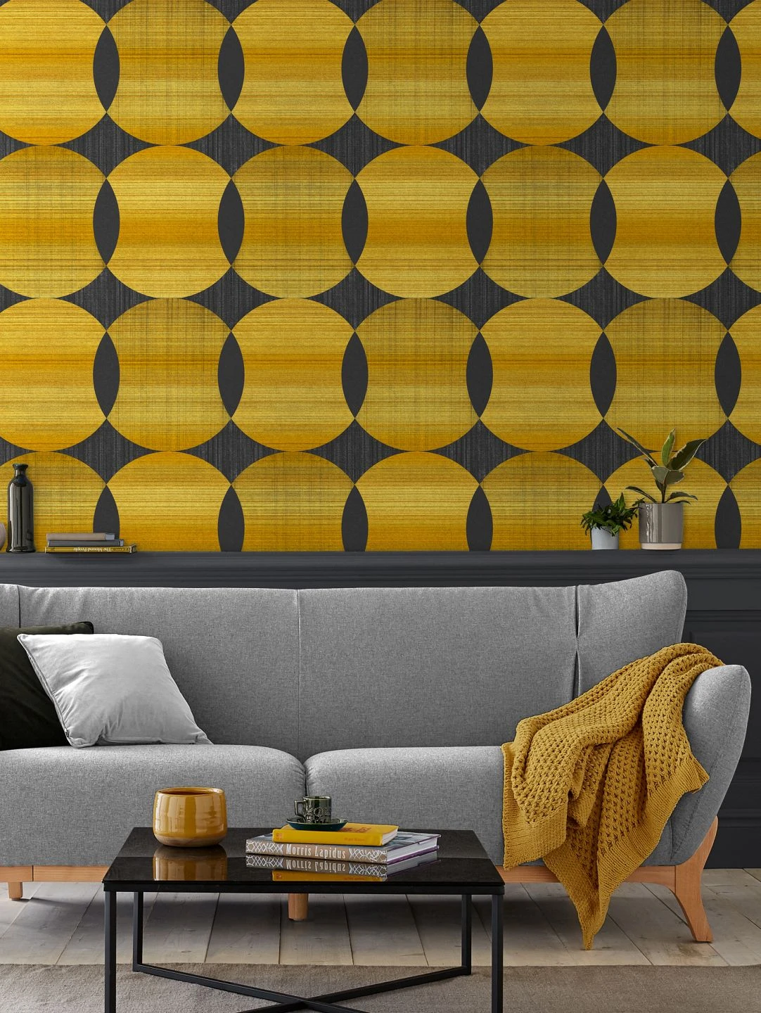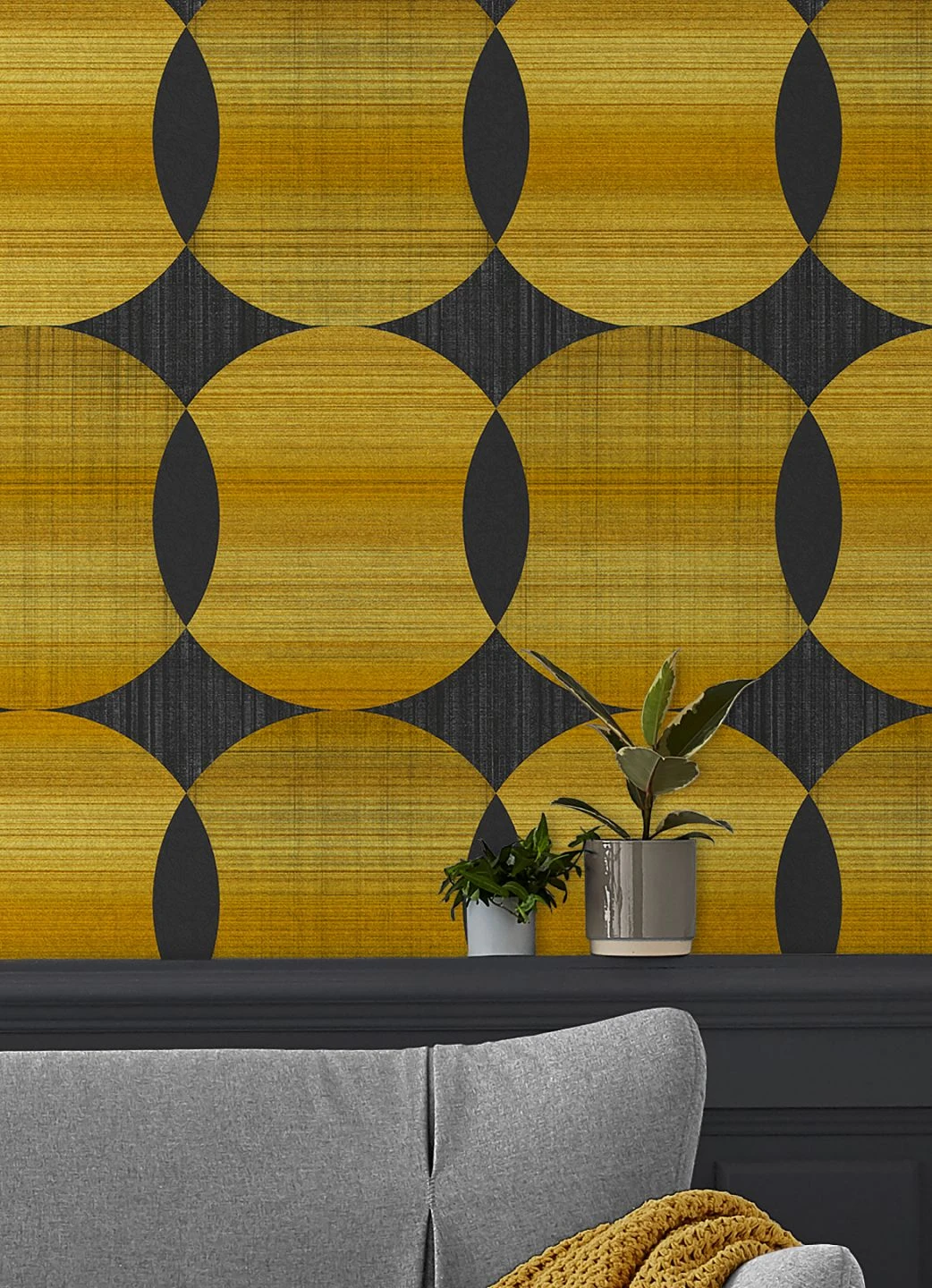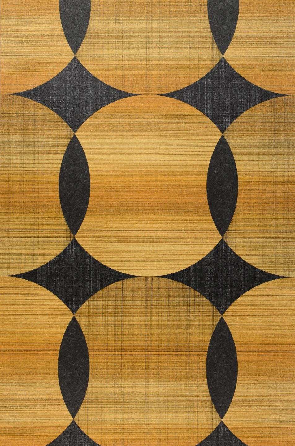 Große Kreise in verschiedenen Nuancen von Goldgelb überschneiden sich und bilden ein regelmäßiges geometrisches Muster. In der Kombination mit Schwarzgrau fällt der goldgelbe Schimmer besonders ins Auge. Die Farbflächen weisen eine Struktur auf, die an textiles Gewebe erinnert. „Kasavu“ überträgt die Formensprache der 70er Jahre ins Hier und Jetzt und schafft eine exklusive Atmosphäre für Ihren Raum.