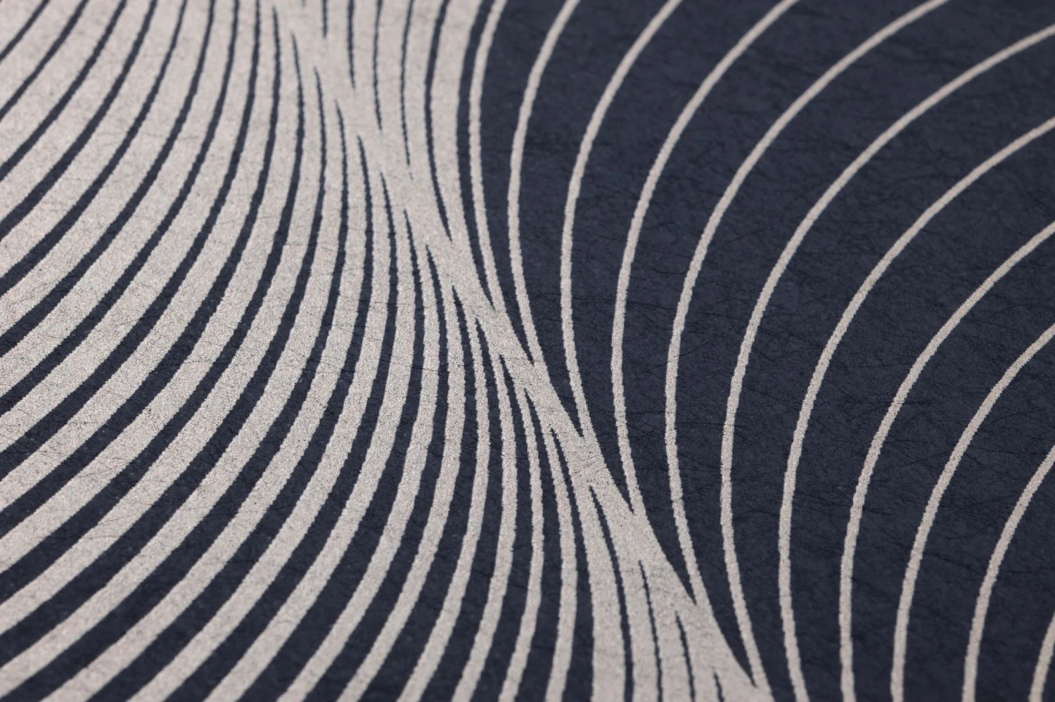 Ein verblüffender optischer Effekt entsteht durch das geometrische Muster. Die wellenförmigen, verschieden starken Linien machen aus der Fläche Ihrer Wand ein dreidimensionales Auf und Ab, das fast bewegt wirkt. Dunkles Blau und schimmerndes Weißaluminium strahlen angenehm kühle Eleganz mit einer Spur luxuriöser Extravaganz aus. Weiße oder dunkelblaue Möbel schaffen geradlinige Ankerpunkte als Kontrast.