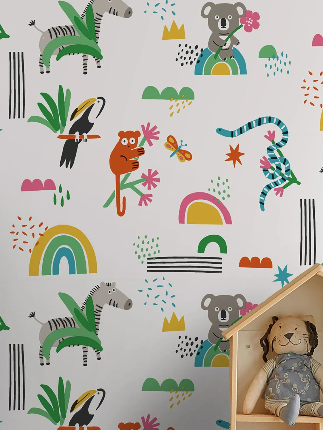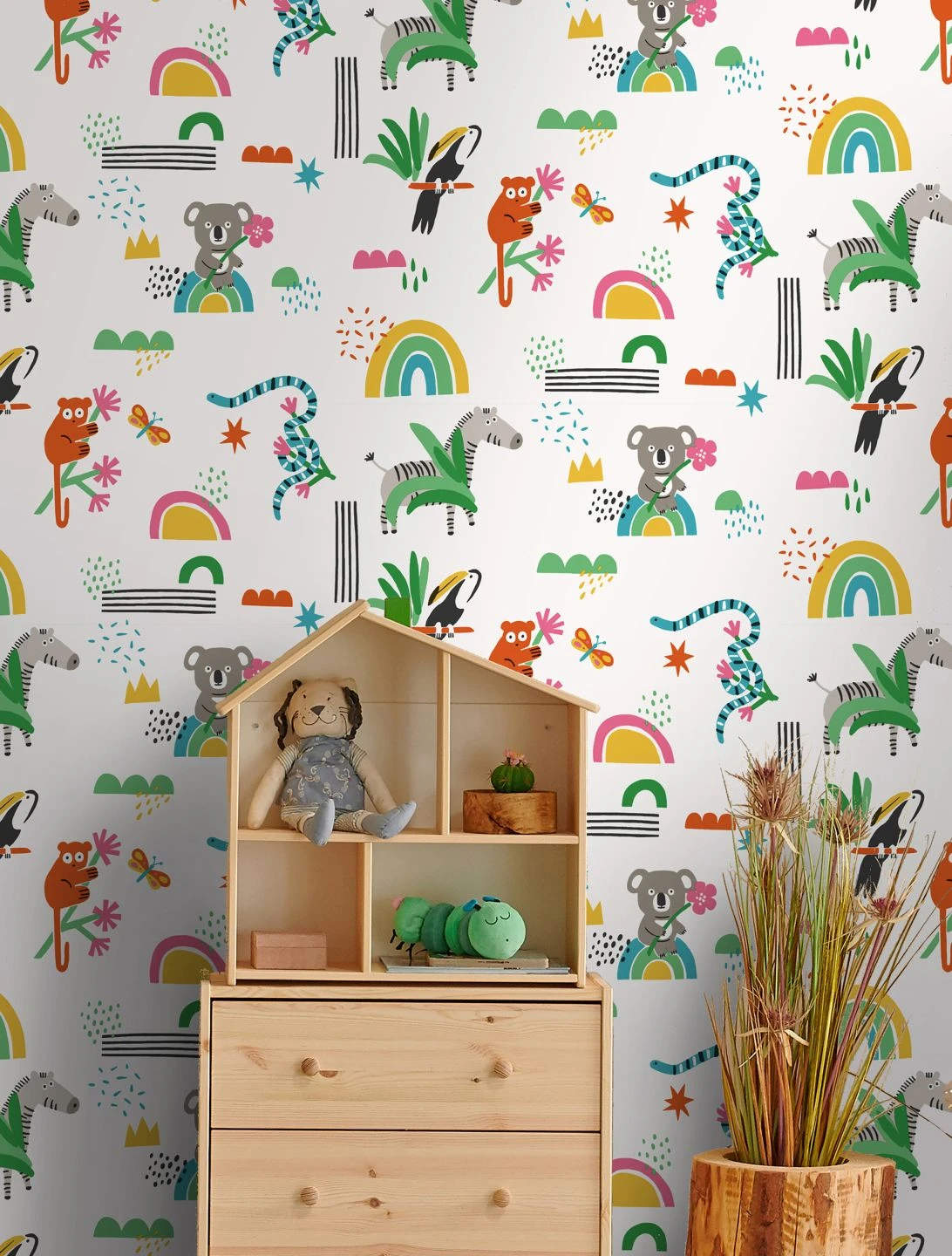 Kindgerecht und witzig gezeichnete Tiere aus der ganzen Welt in fröhlich bunten Farben zwischen Bäumen, Wolken und Regenbögen lassen die Wände in Ihrem Kinderzimmer lebendig werden. Die Faszination, die Tiere auf Kinder ausüben, ist auf der Papiertapete Kiki in warmherzige Bilder gefasst. Zebra, Koala und Schlange regen die Fantasie Ihres Kindes an und laden es dazu ein, sich mit ihnen zu beschäftigen.