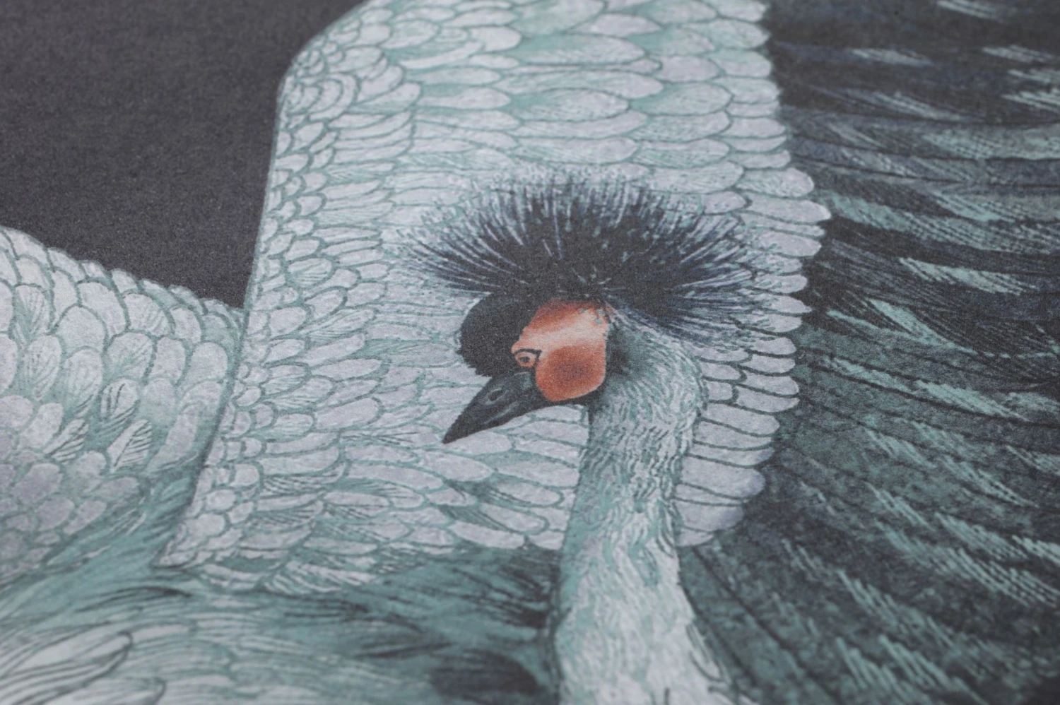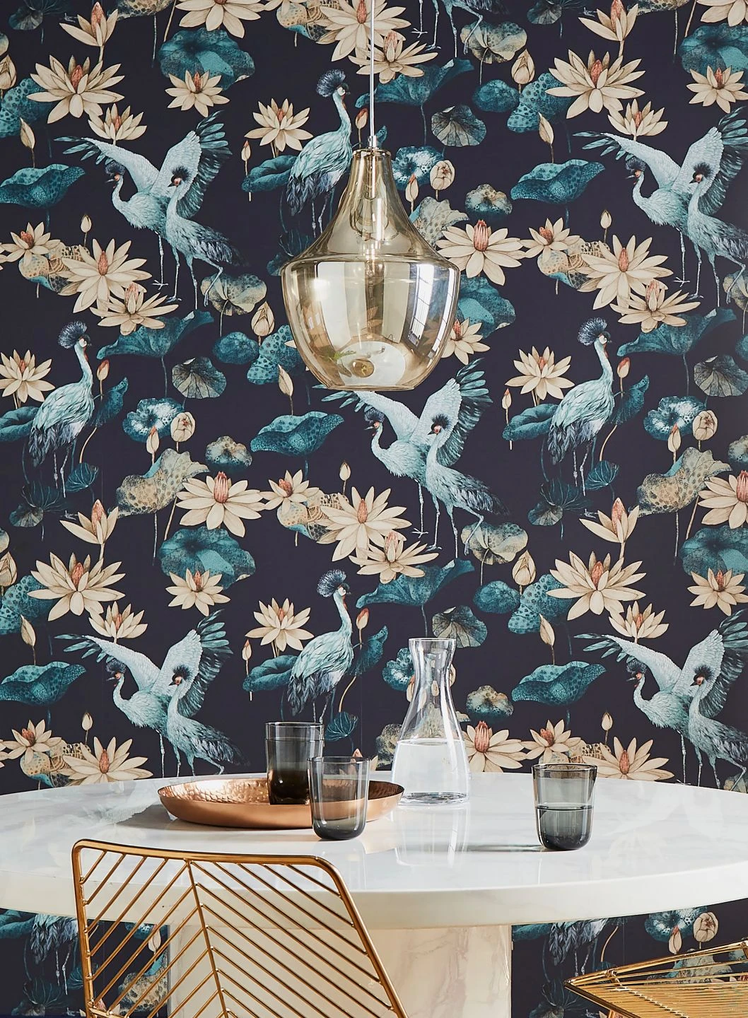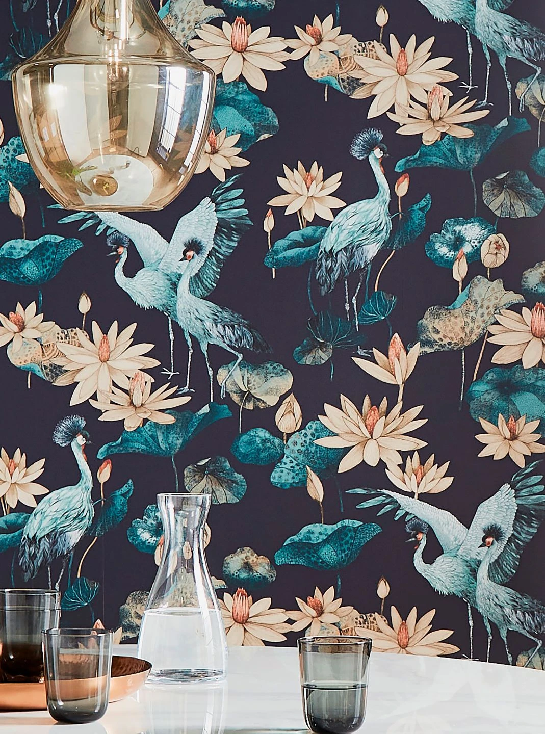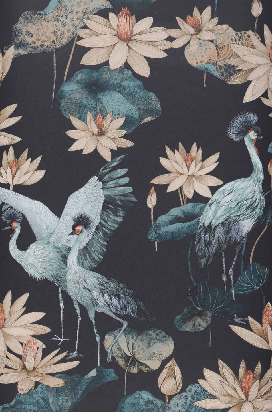 Eine Tapete wie aus einem chinesischen Märchen: Kraniche, die in der asiatischen Symbolik als Glücksbringer gelten, und Lotosblumen, die für Reinheit und Treue stehen. Die liebevoll gezeichneten Kraniche in ihren hellen Blaugrüntönen und das Beige der Lotosblumen kommen auf dem schwarzblauen Grund eindrucksvoll zur Geltung. Das Spiel mit den Größenverhältnissen macht das Design besonders interessant und verleiht Tiefe.