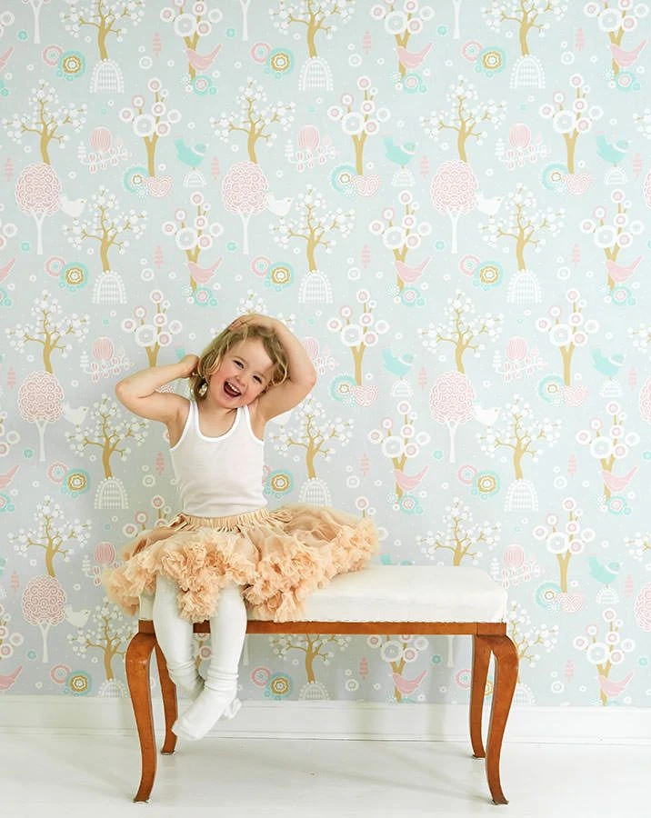 Heimelig und zauberhaft stimmt das romantische Naturszenario auf den Tag oder die Nacht ein. Die harmonisierende Farbgebung in Hellgrau, Altrosa, Hellbraunbeige, Hellpastelltürkis und Weiss verleiht dem Raum einen warmen, weichen Charakter und stimmungsvolle Helligkeit. Hier können Kinderträume wahr werden!