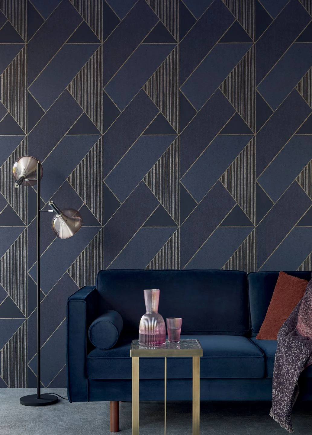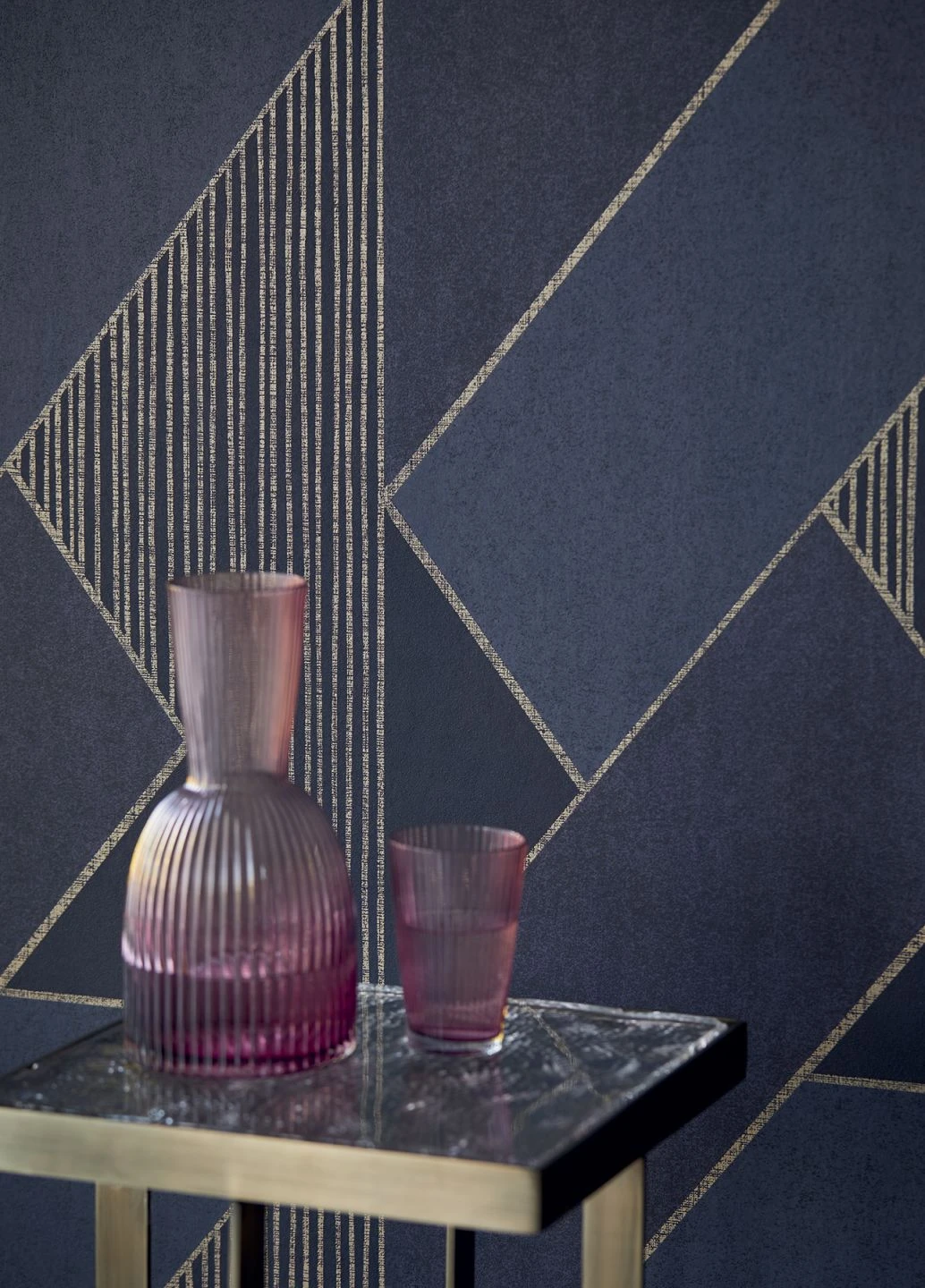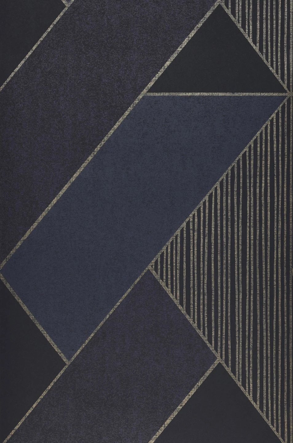 Die goldenen Linien, die in sich raffinierte Dreiecke bilden, schwingen den Rechtecken und kleinen Dreiecken in Blau förmlich entgegen und geben damit die Richtung vor. Das elegant außergewöhnliche Design schafft großartige Lounges und Partyräume. Auch in Szene-Clubs bringt die abwaschbare Vliestapete in die richtige Stimmung.