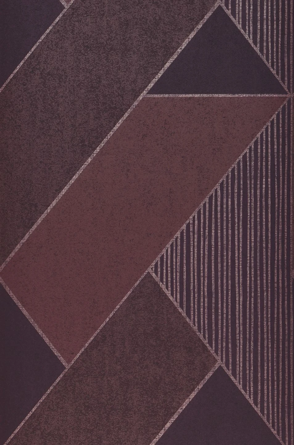Fruchtige Beerentöne in Violett lassen Rechtecke, Dreiecke und Linien auf Tapete Kolana tanzen. Das schräge Musterdesign, das von gegensätzlicher Bewegung lebt, wurde speziell für moderne Einrichtungsideen geschaffen, die Wände als kunstvollen Blickfang inszenieren, sich allerdings in der Möblierung bewusst dezent halten.