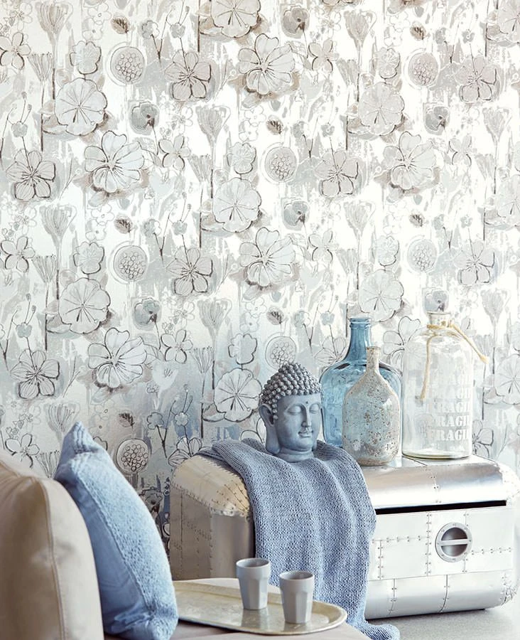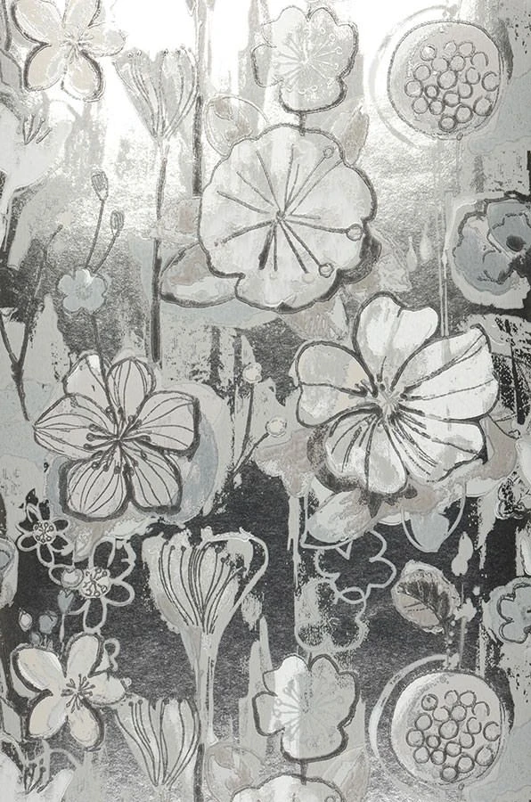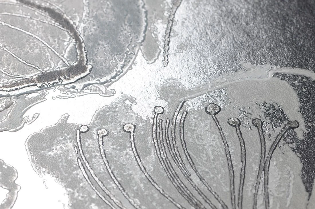 Der Leimdruck gibt diesen wunderschönen Blüten in Anthrazit und Grau die besondere Aura. Die verwendeten matten Farben auf dem silbernen Untergrund unterstützen den Stil des floralen Designs.