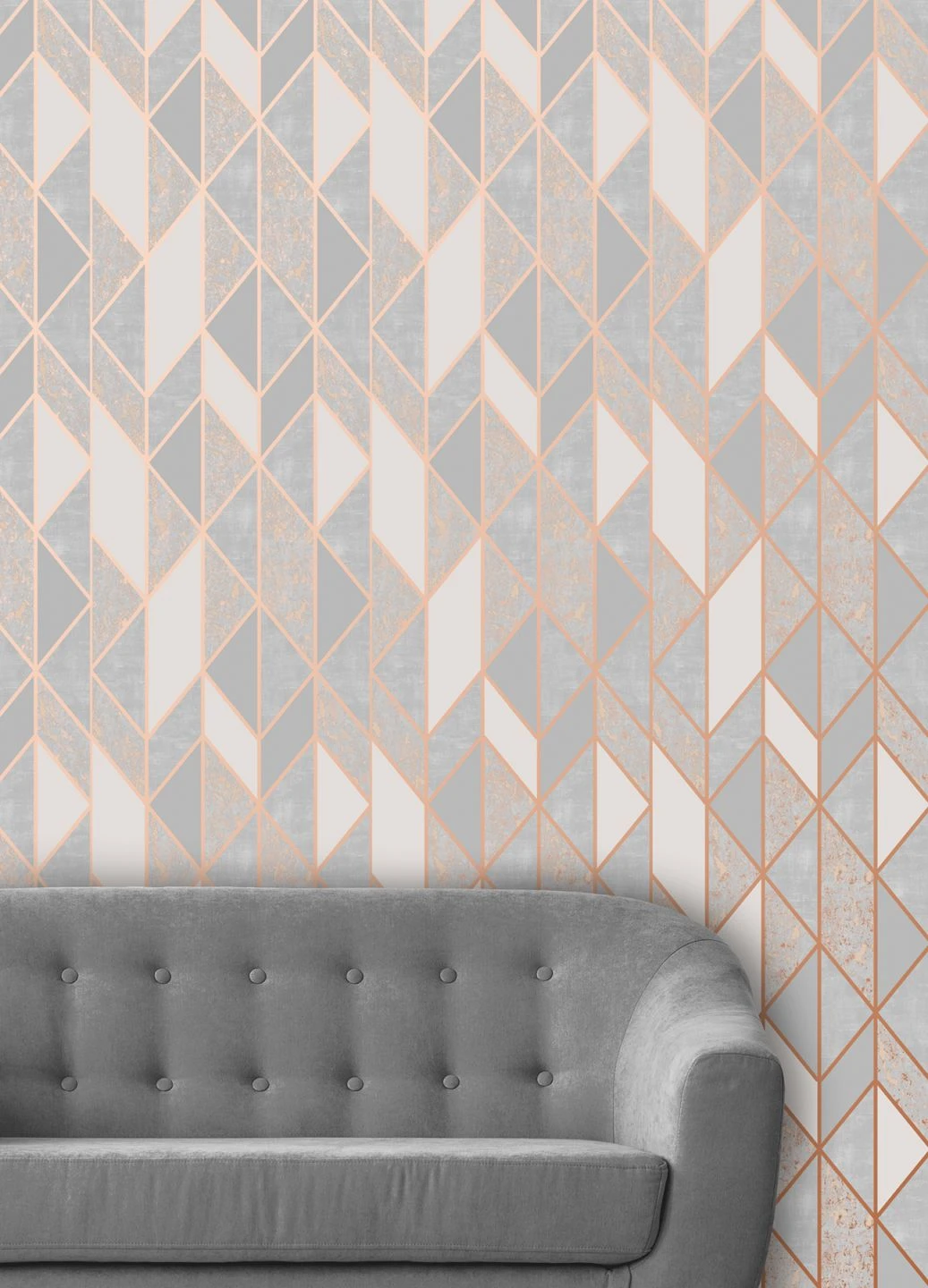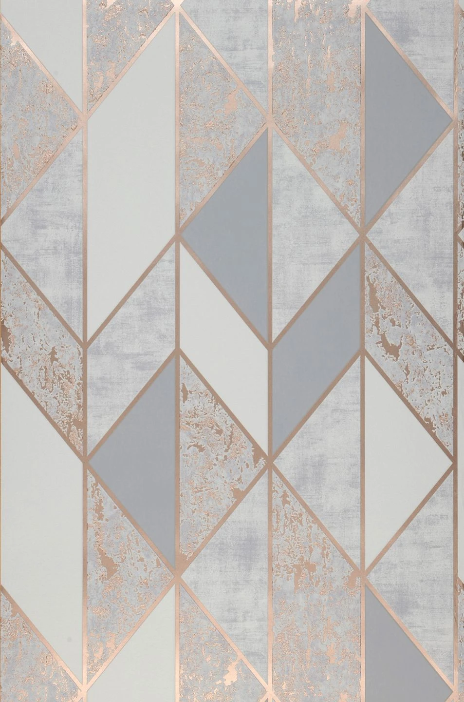 Modernes Art Deco entdeckt sich mit dieser geometrischen Tapete in Grautönen und Rosenholz neu. Der schimmernde Untergrund verhilft dem bewegten dreidimensionalen Muster zu mondäner Eleganz, die sich auch in den marmorierten Flächen widerspiegelt. Das fühlbare Relief der Vinyltapete unterstreicht den hochwertigen Charme.