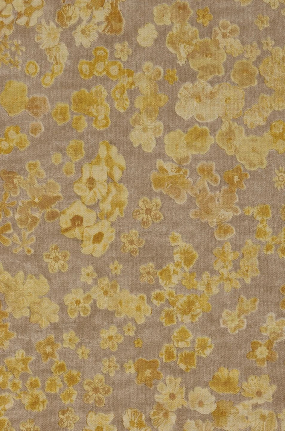 Sommerlich leuchtende Gelbtöne dominieren bei den wie zufällig auf der Fläche der Tapete verstreuten Blüten. Durch den geringen Farbkontrast zum hellgraubeigen Grund entwickelt Liberty eine ungeheuer intensive Leuchtkraft, die Ihren Raum lichtdurchflutet, sonnig und warm wirken lässt. Die Textilstruktur der Vinyloberfläche trägt zur warmen Ausstrahlung bei. Dunkle Holztöne sind eine tolle, kontrastreiche Ergänzung.