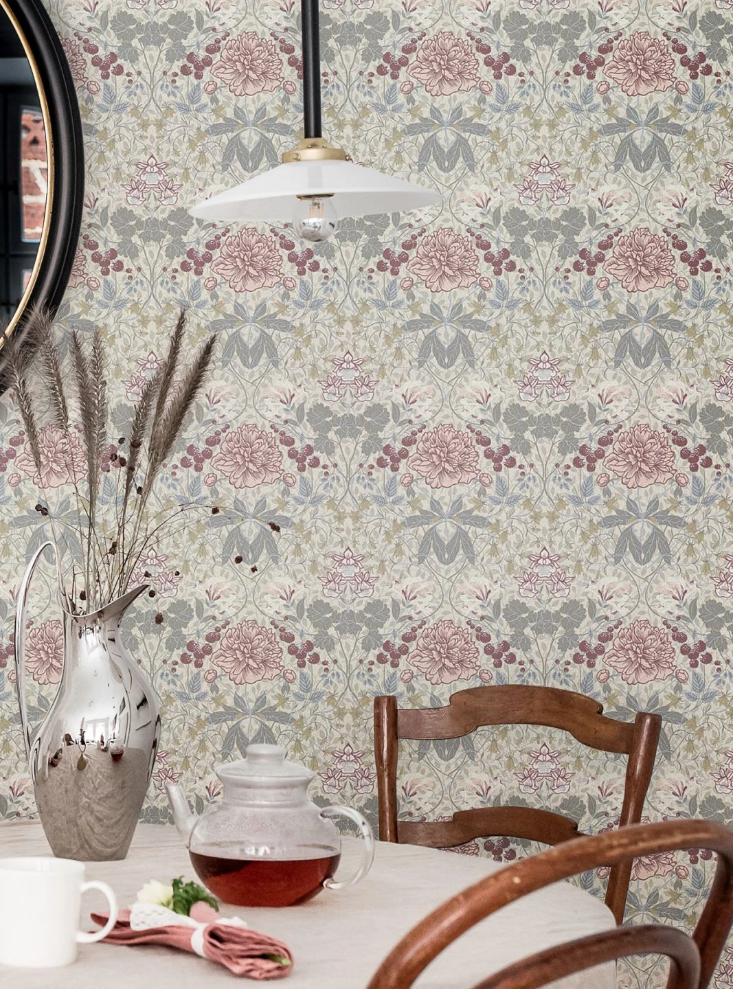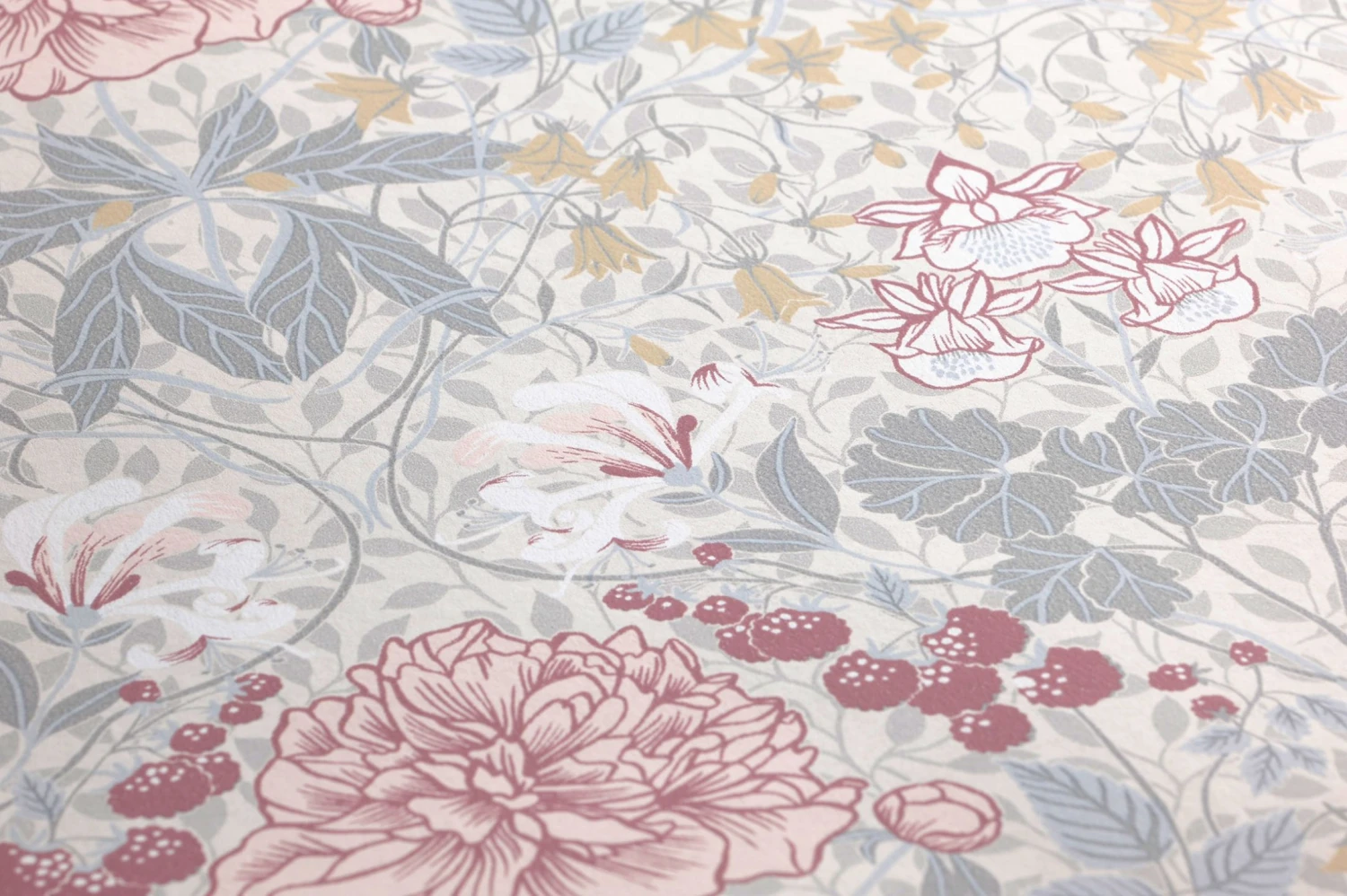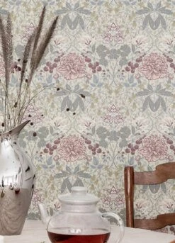Ein Hauch von unendlicher Romantik verbreitet die klassische Mustertapete. Historische Ornamente, Früchte, Blüten in Blassblau, Grau, Rosaweiss, Weinrot, die mit Cremeweiß eine stimmige Einheit bilden. Leben Sie Ihren Stil besonders harmonisch mit dieser lieblichen Vliestapete, die jedes Herz berührt.